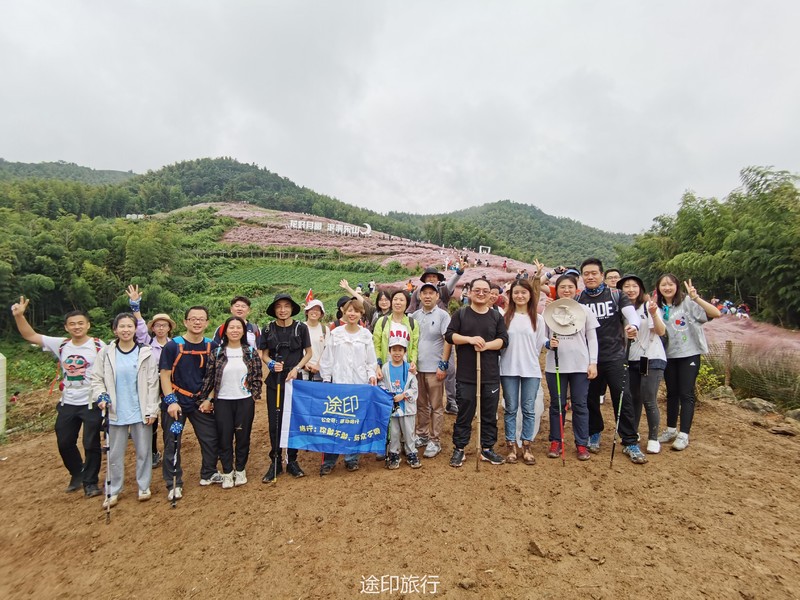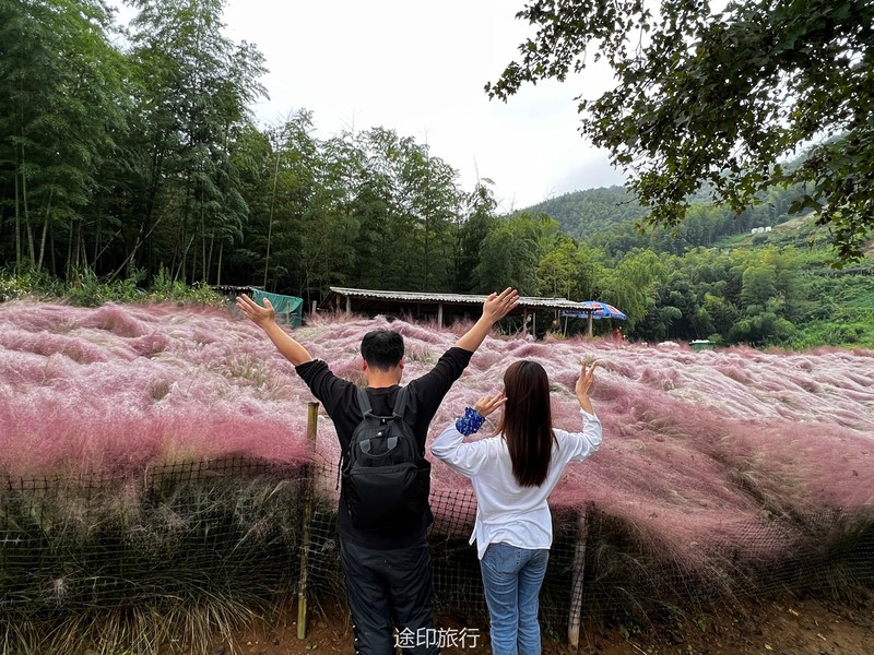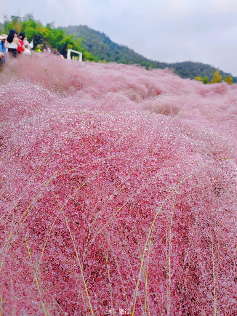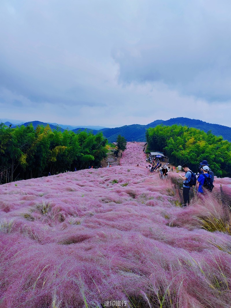 穿过村庄后经过竹林,这一截路目前还是泥泞小道,爬升有一定高度,体力好的一鼓作气就冲上去了,差一点的休息两次也能上去。上去后就是我们今天的主角,粉黛乱子了,一大片,一眼望去全是粉色。今天因为早上下了一点雨,上面挂满了水珠,给粉黛增添了一些朦胧感,更显羞涩。