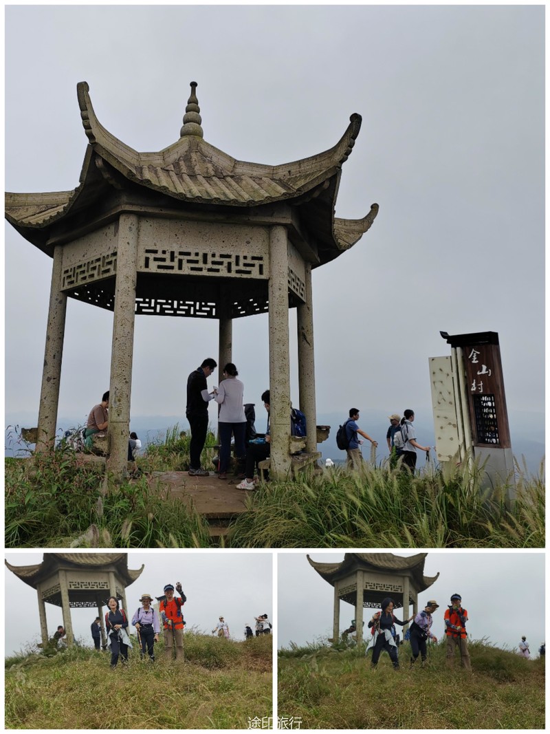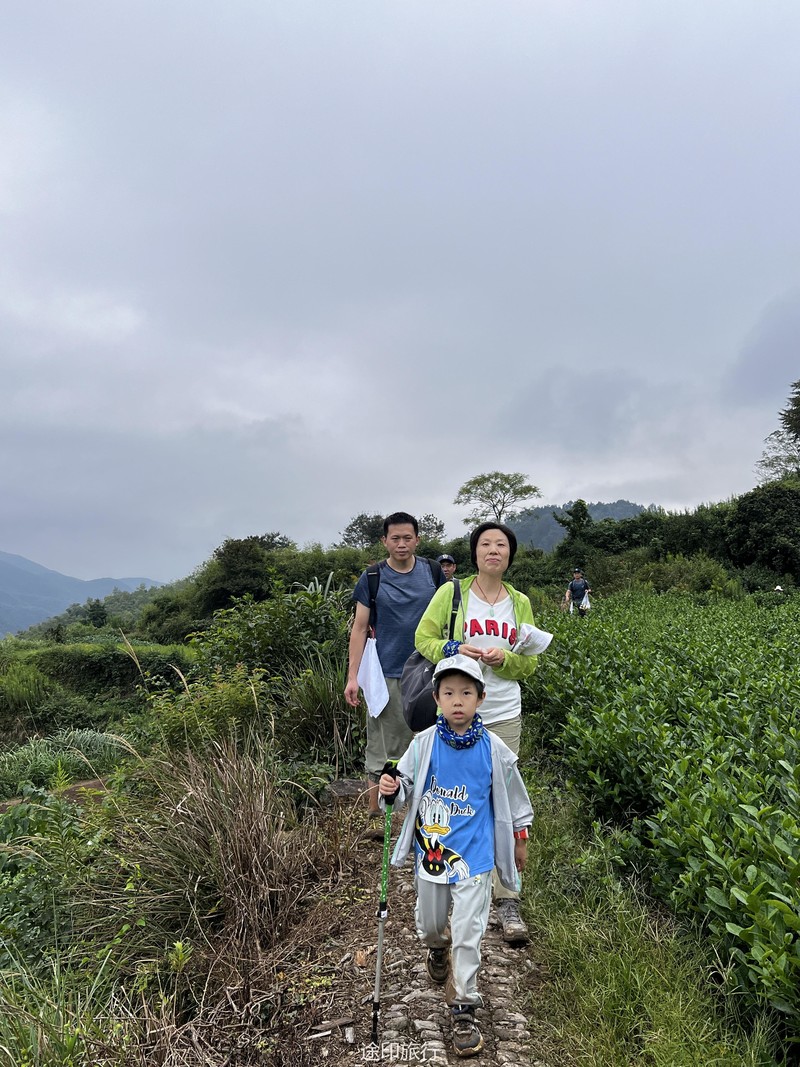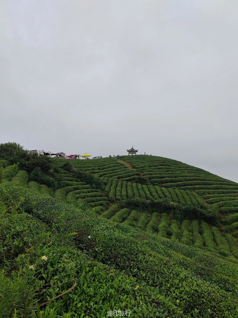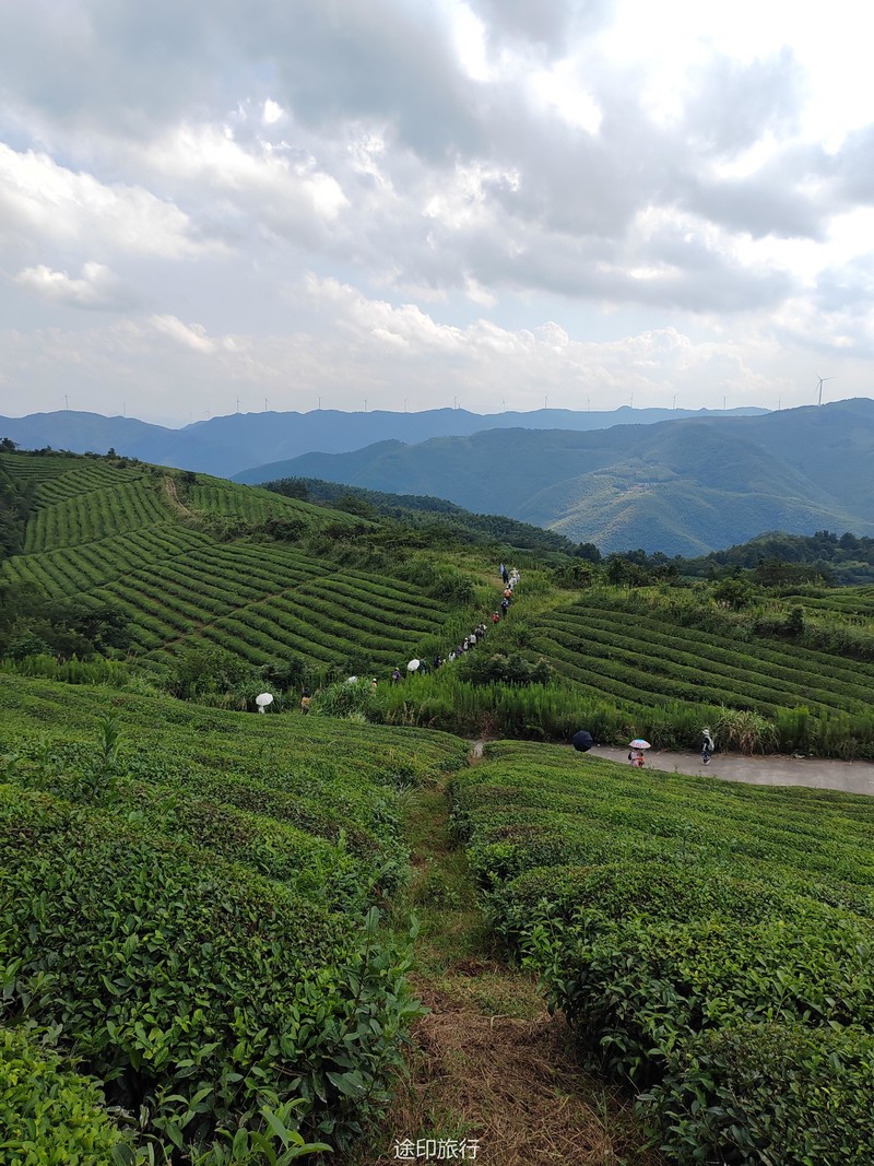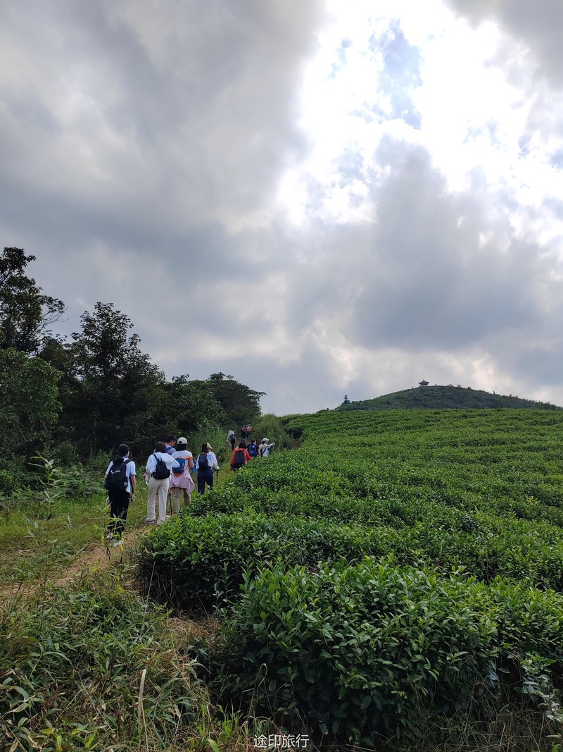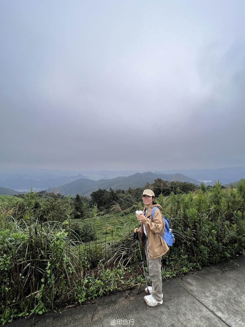 在粉黛这里休息一下,拍拍照,吃吃午餐,休整好后继续出发。向此次行程的最高点“望海亭”出发。站在山顶,一眼望去,近处是茶园,远处是群山,“一览众山小”在这一刻得到了完美的诠释。山顶这里修有一平台,有几摊位,可供休息和补给,非常不错。