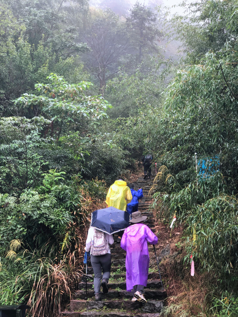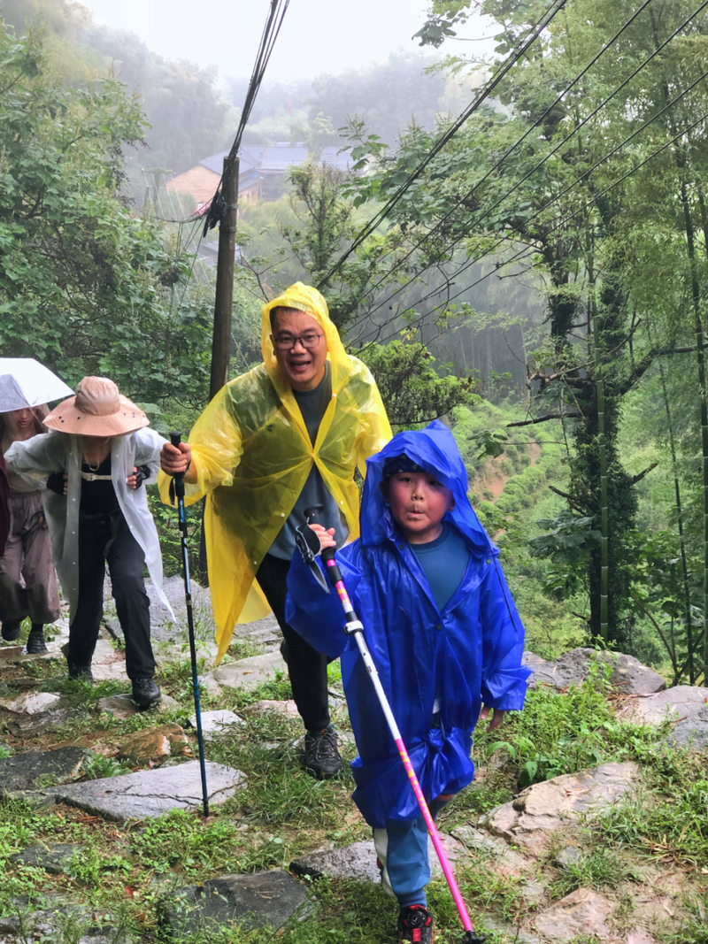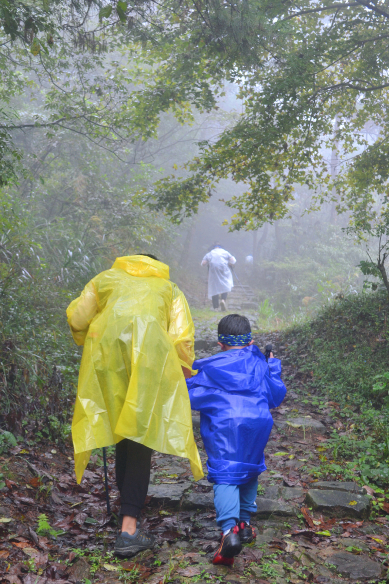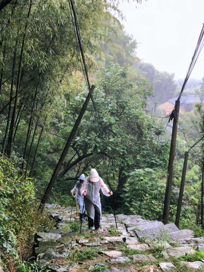 徒步起点是在孙岙村,依旧下着小雨,小伙伴穿上提前准备好的雨衣,稍作调整后开始徒步。开始的台阶路真是先给了个下马威,我们选择控制好节奏,快慢有序的行进。路上有当地的寺庙和修缮的休息点,这点设计特别好,累了就可以停下来歇歇。