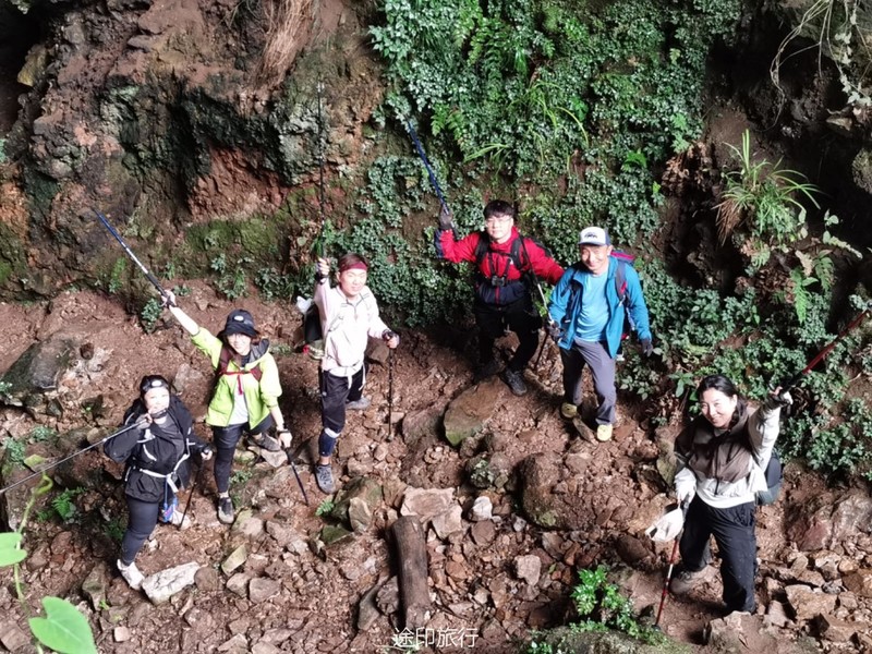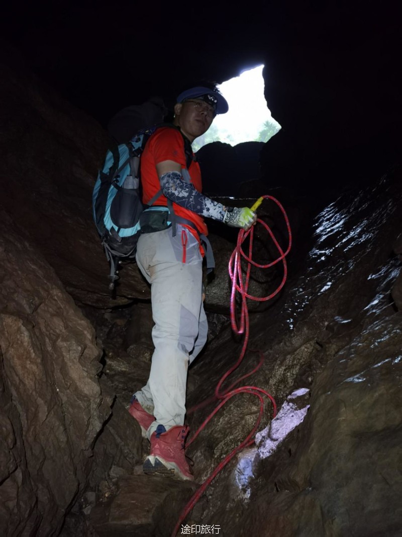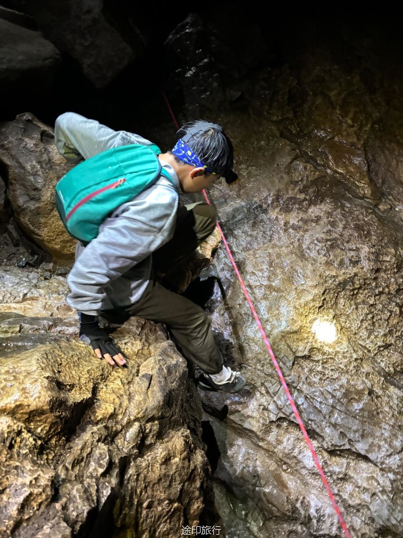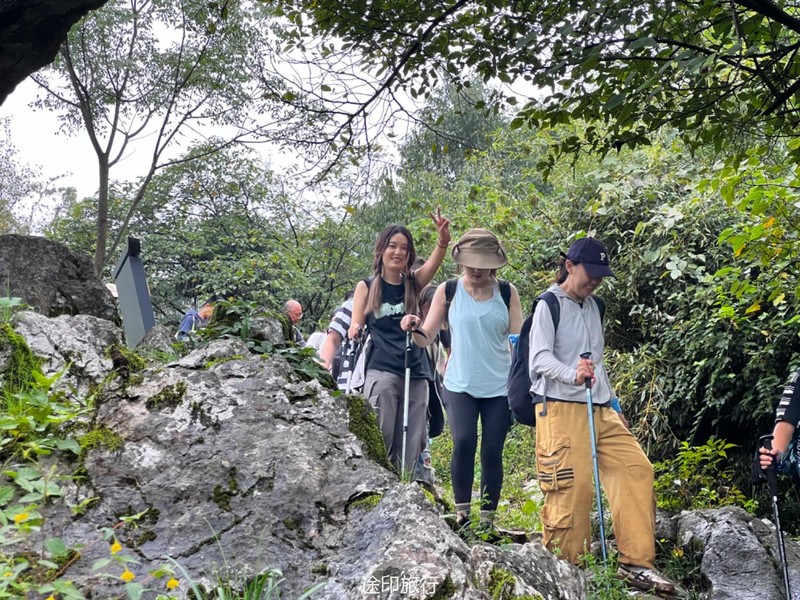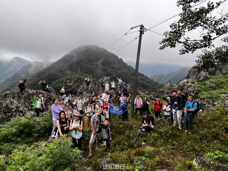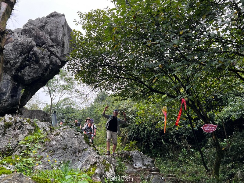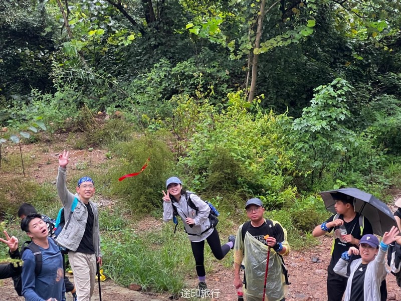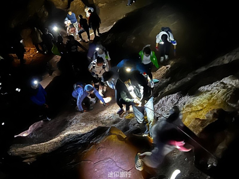 从起点出发,沿路看到农家小院里种植的柚子树以及桂花树。上山途中偶遇牛羊,浓浓的乡间气息,爬坡很短,对经常参加户外的伙伴来说,心率可能刚刚提上来就到山顶了。中午山顶下雨,带着队员直接进入山洞,五十多人在洞口处避雨顺带吃了午餐。这次我们在洞里的三层看到了蝙蝠,听着振翅声还是有些惊喜的,出洞后在山顶怪石那里拍照,还是拍照 ……