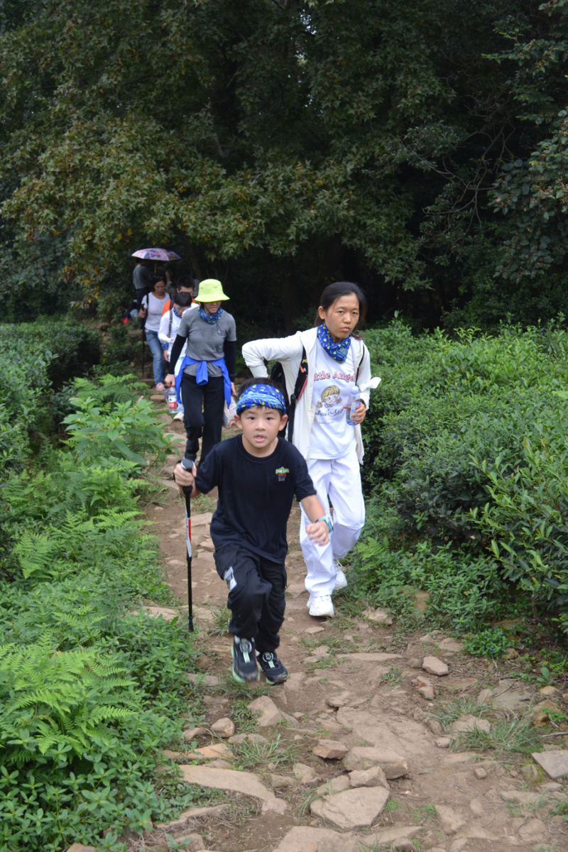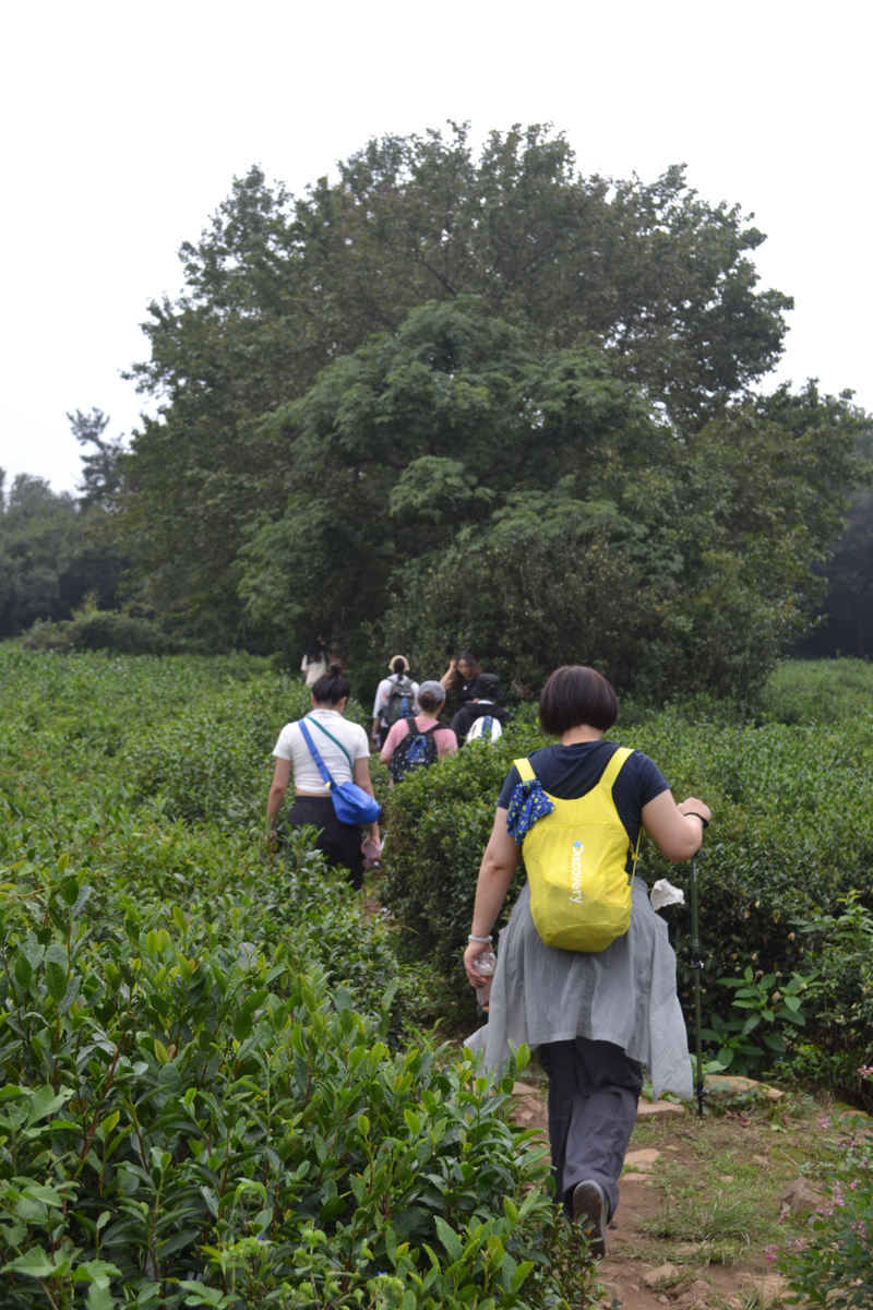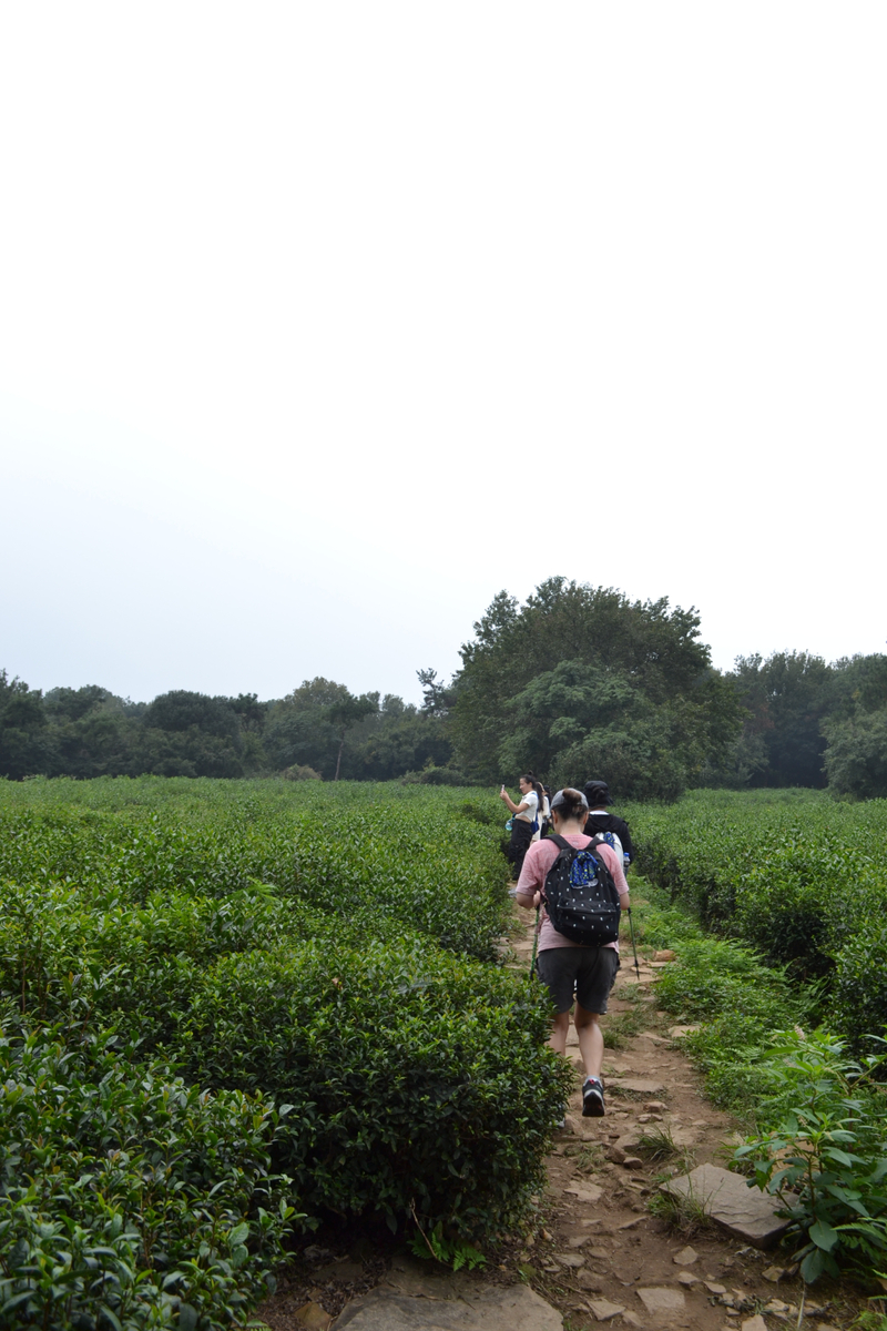 随后我们开始最难走的一段:一是坡度大;二是路型复杂,掺杂石头的土山路。经过一番努力,我们终于登上了山顶,来到一片茶园,望着满眼绿色,呼吸着新鲜的空气,享受着大自然的恩赐。