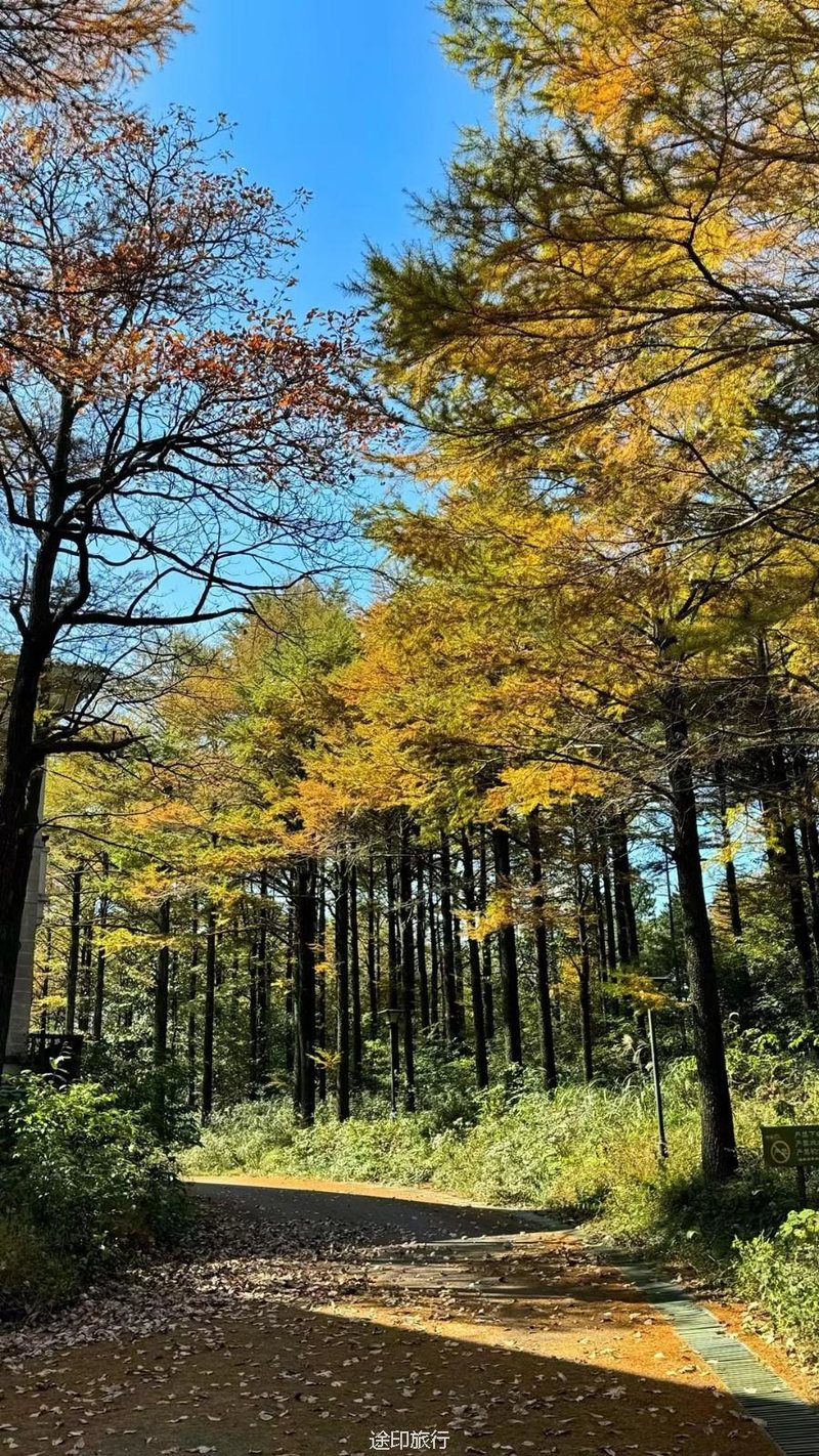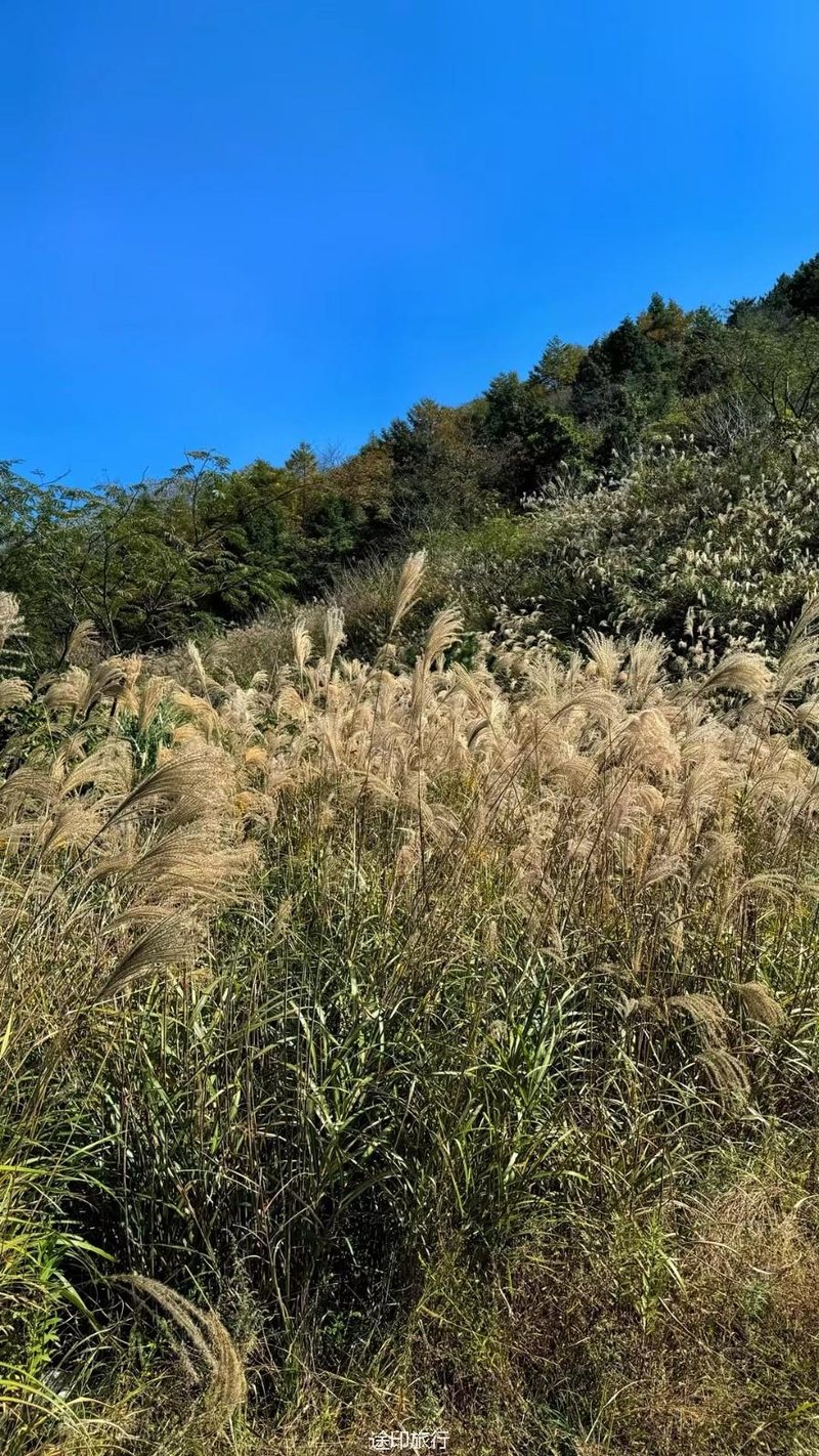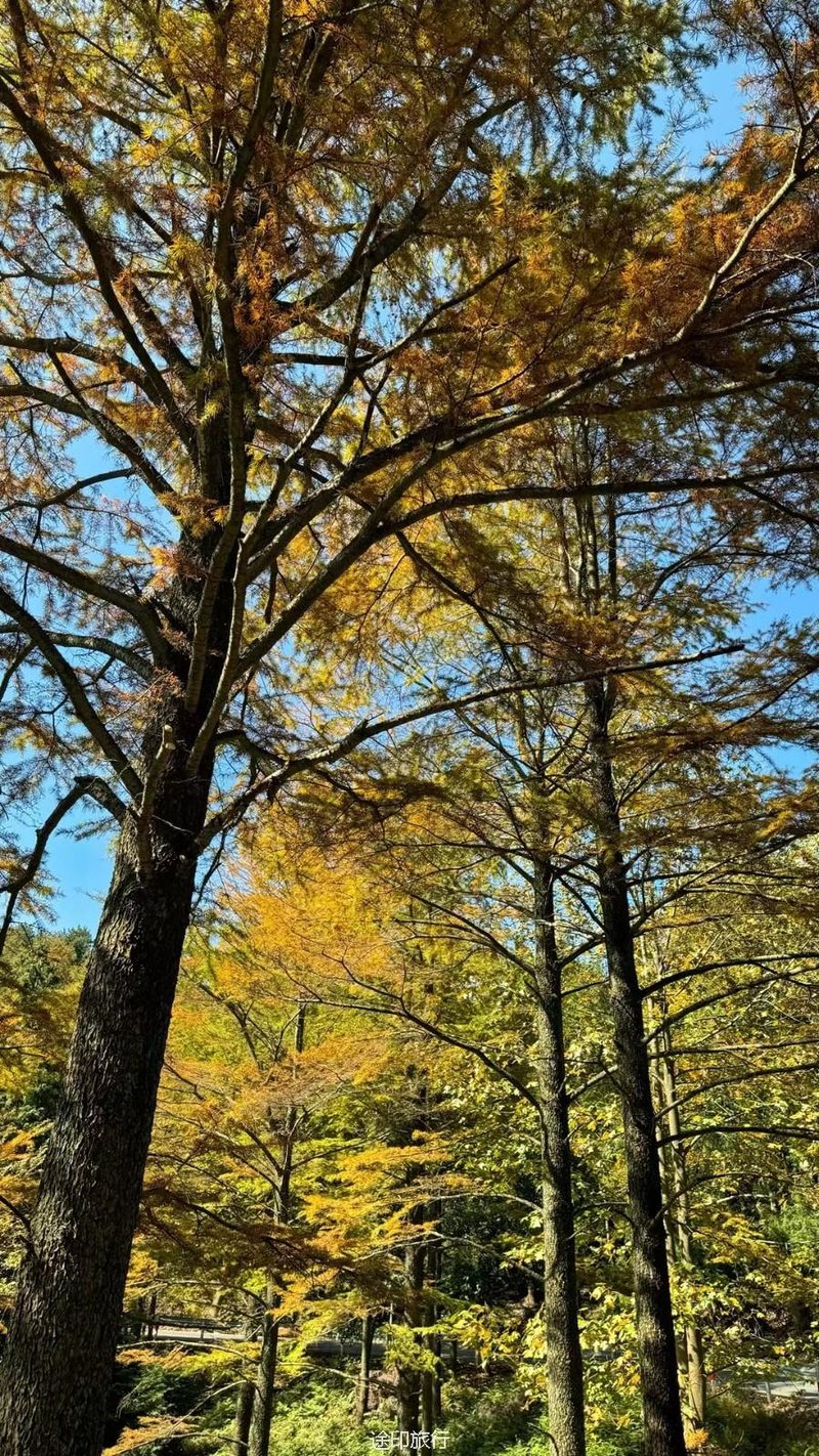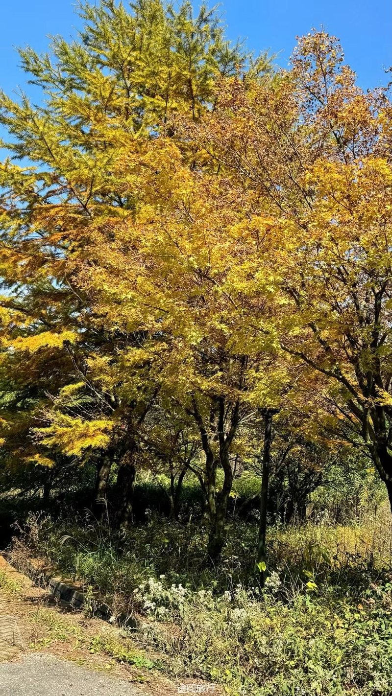 十字裤,一片片的松树林,满地都是金黄的叶子,丝丝凉意的空气中弥漫着桂花的香味,一路小桥溪水,风景很好山野森林的感觉,白云、瀑布、枫叶林、金钱松、这个秋天最治愈的风景线。