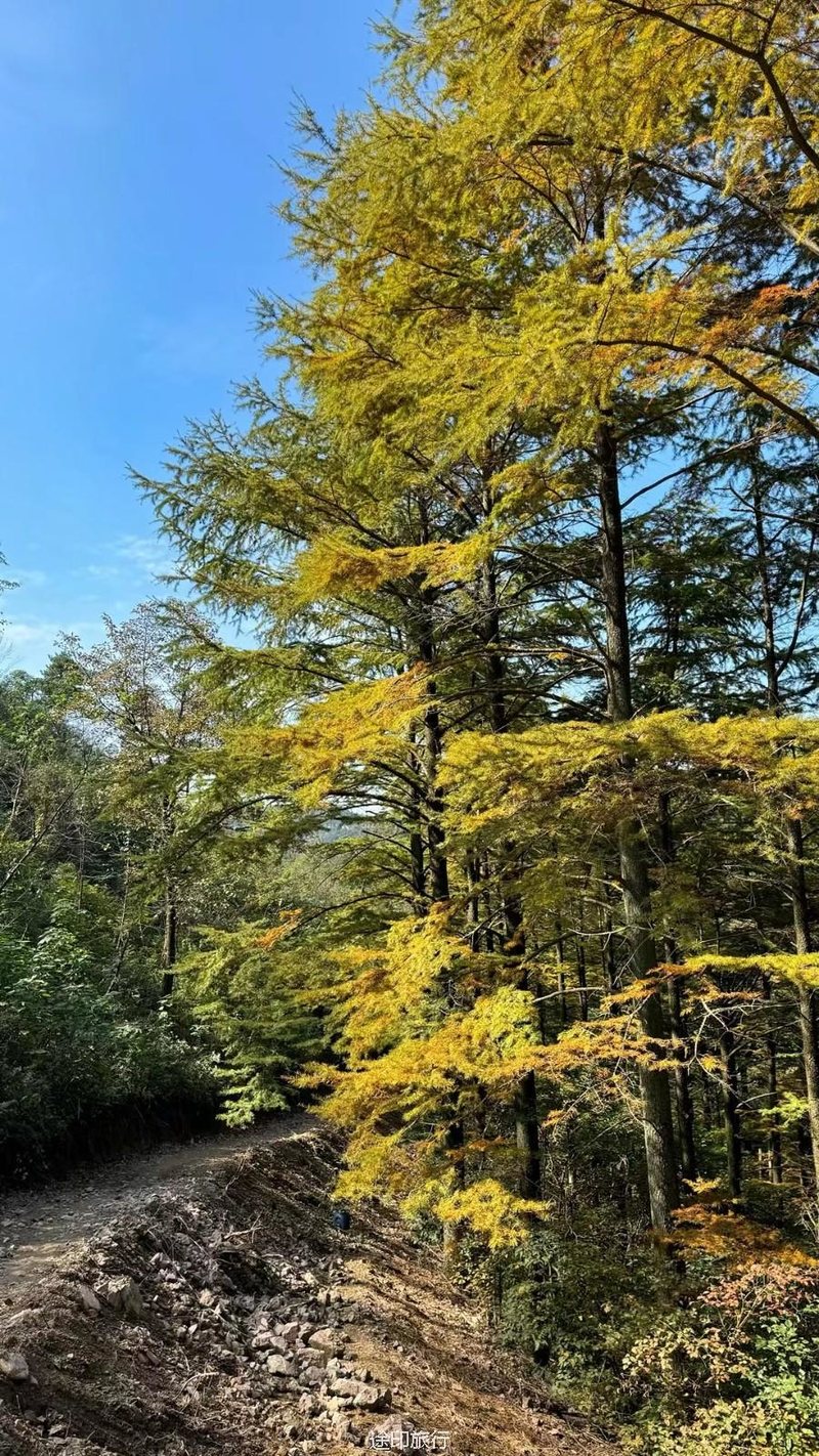 1、徒步起点开始,中午时段经过金钱松森林,满地都是金黄的叶子。