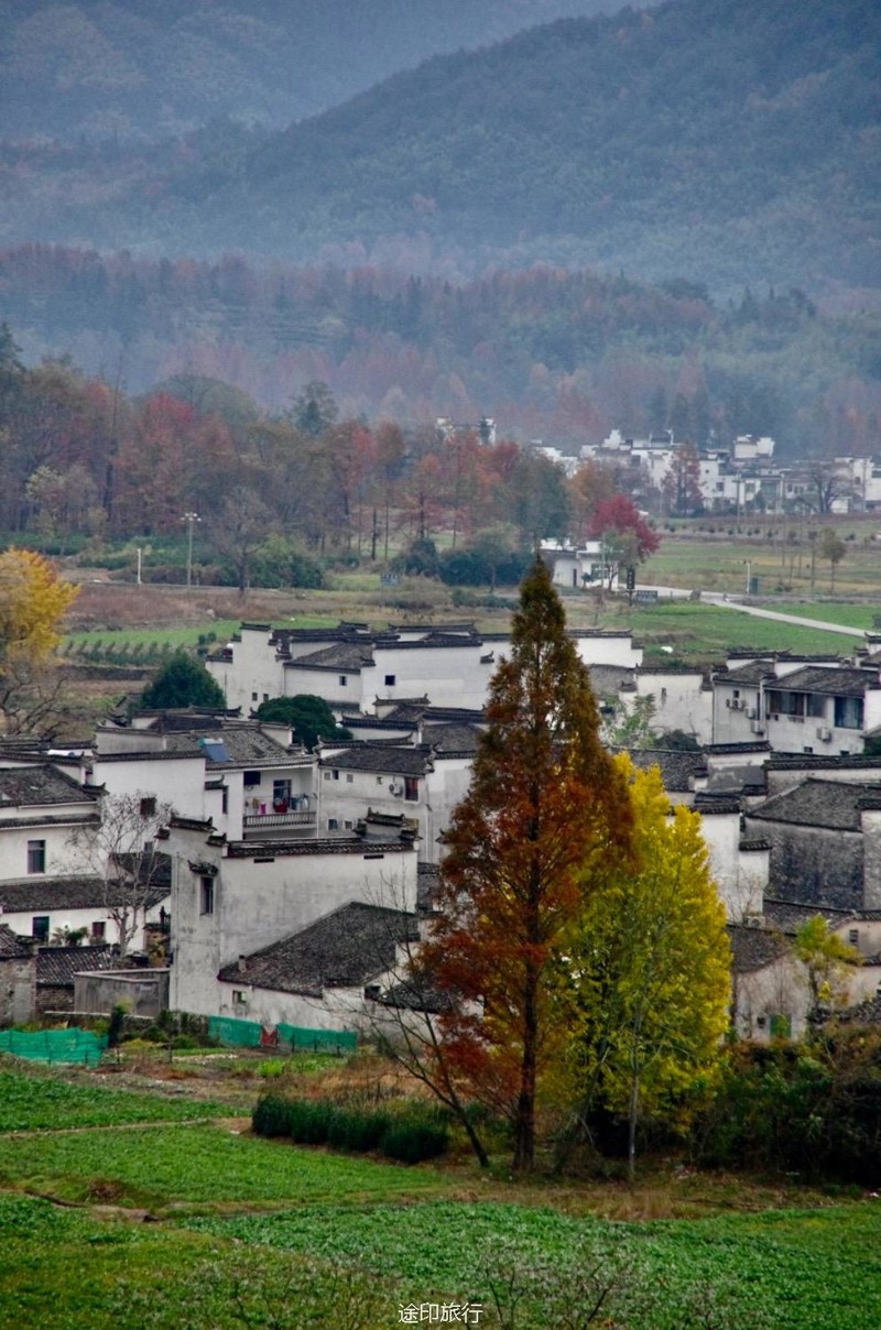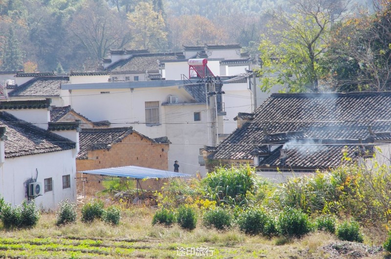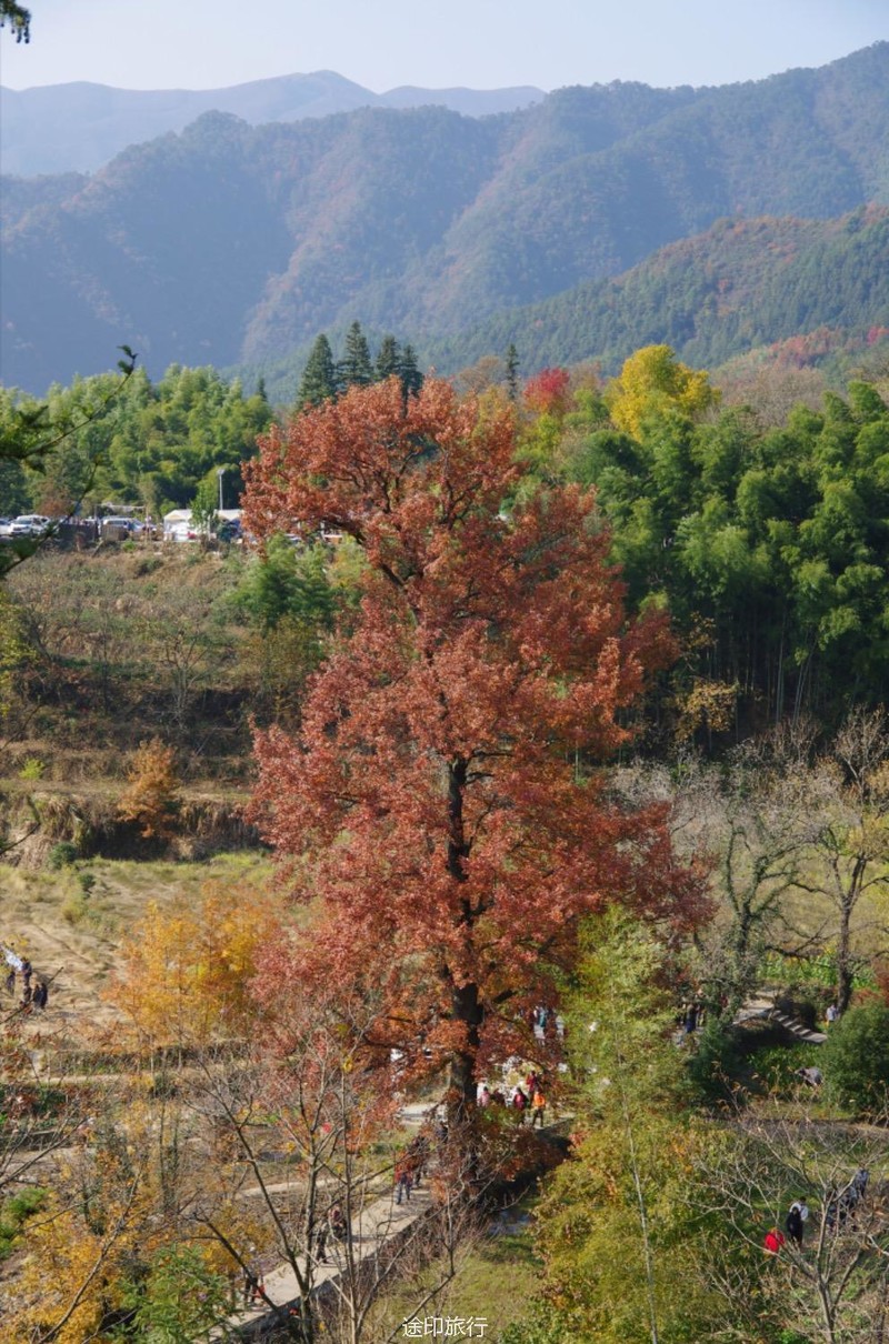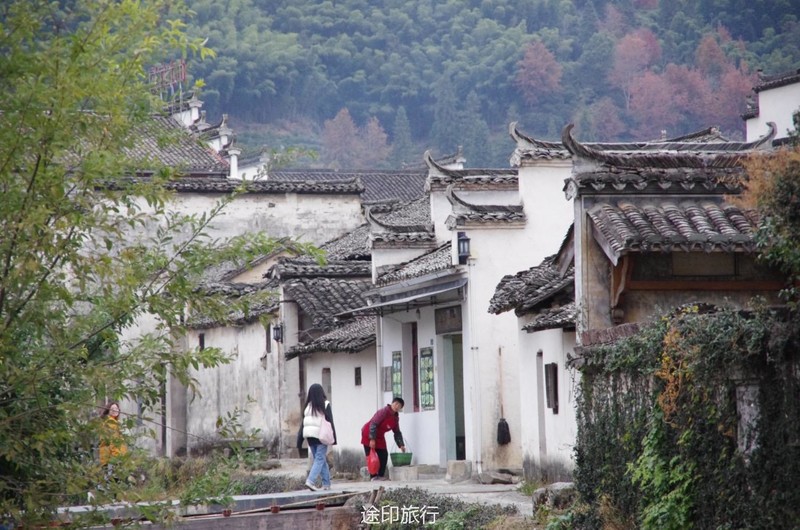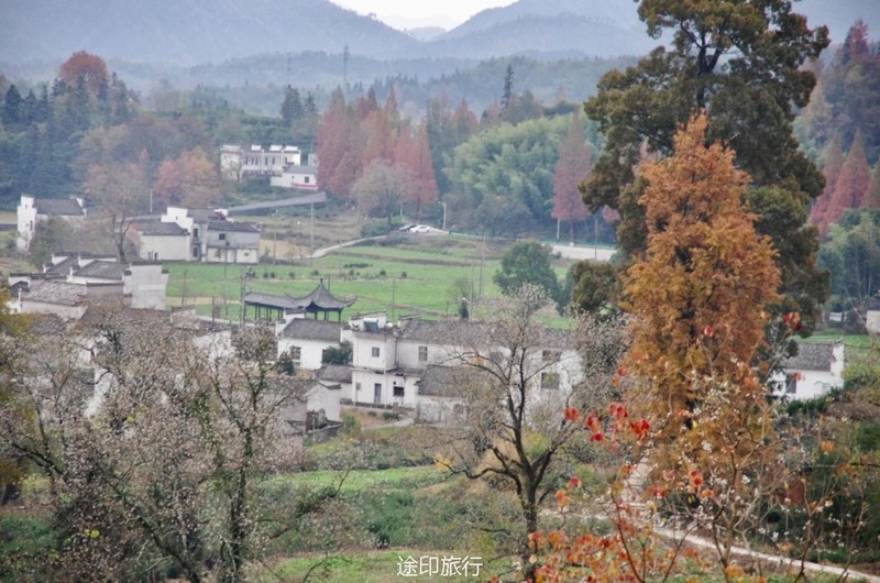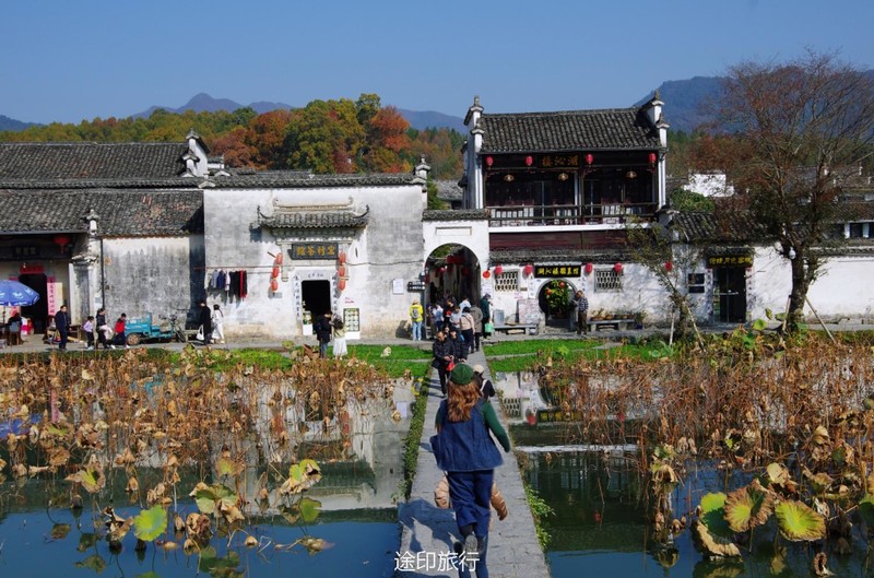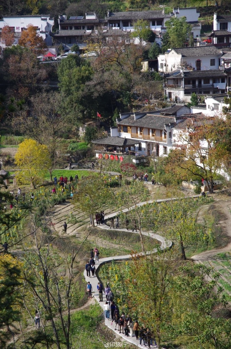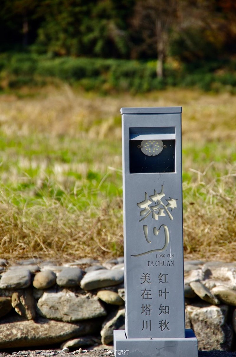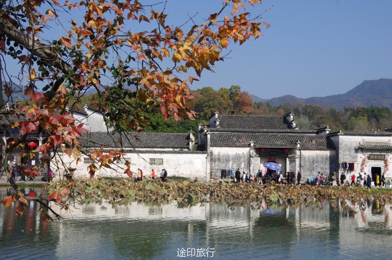 塔川村依山而建,飞檐翘角的古民居,层层叠叠,错落有致,远远望去,就好象一座宝塔矗立于山谷之中。这就是“塔”字的来历。一条清澈的小溪穿村潺潺流过,给村子带来了云烟缭绕的和生生不息的景象。因此有“川”一字。合起来就是“塔川”。 塔川以村落中错落有致的乌桕红色而出彩,乌桕树在经过霜降以后,由绿变黄,又黄变红,中间呈七彩。我们从塔川景区进去,景区内有一个红枫观景台,可以俯瞰村落。 然后下到河谷的田间小道,再一路经梓路-老屋树上-协里-杨家-丰登村-奇墅湖-宏村,走个半环线10公里,到达宏村。