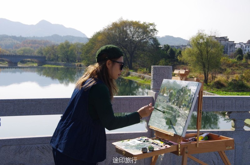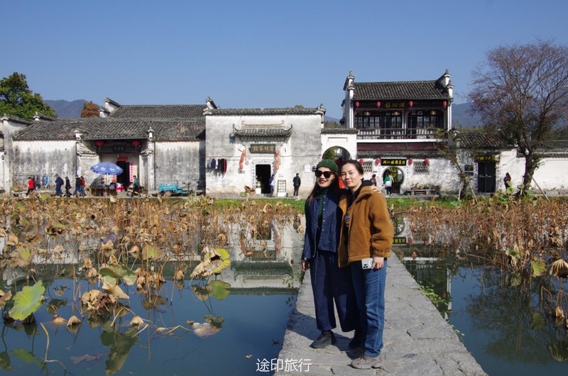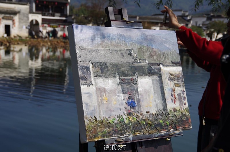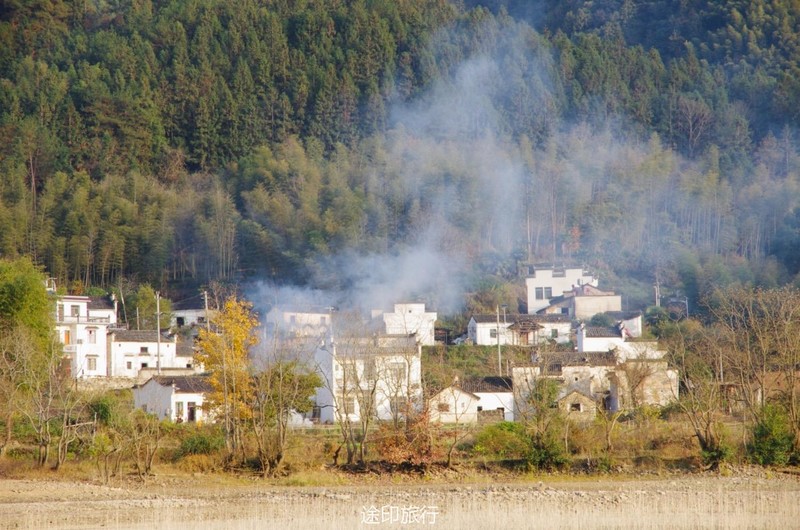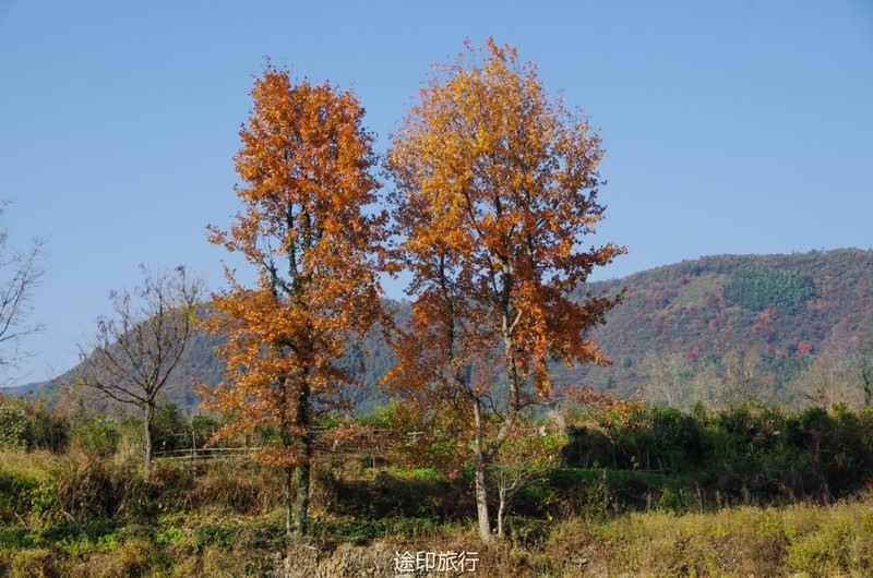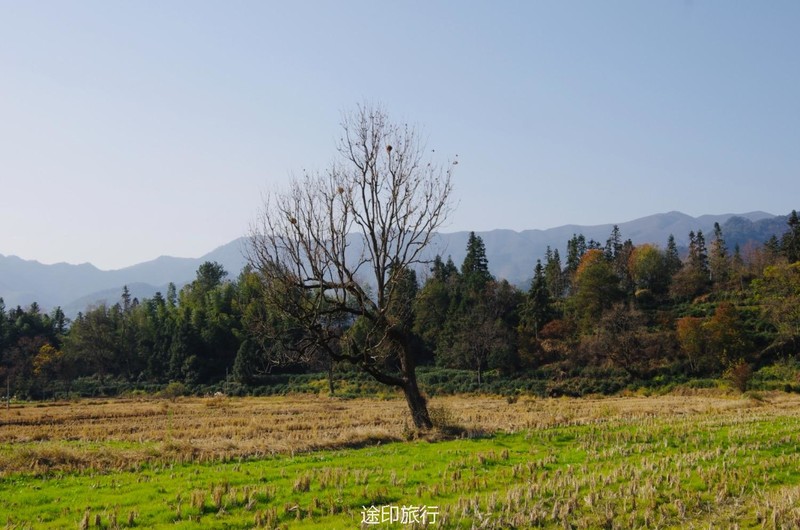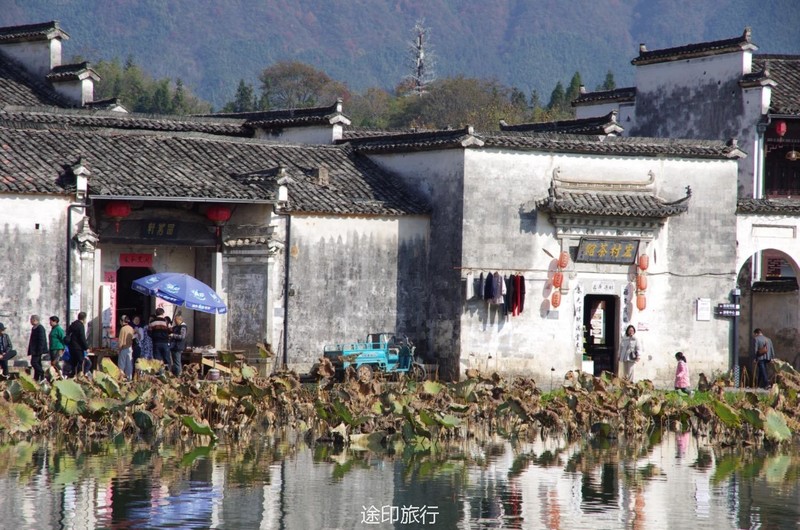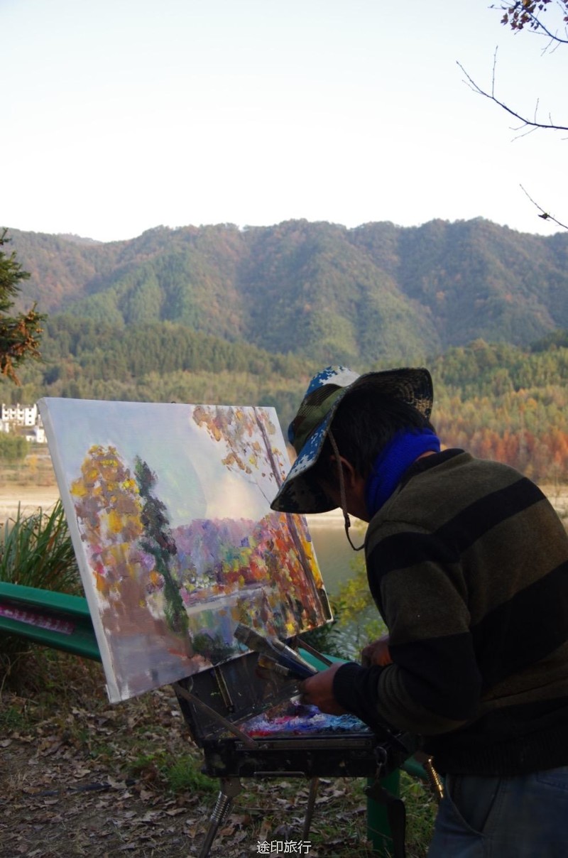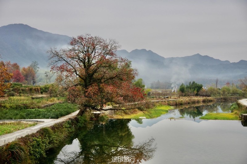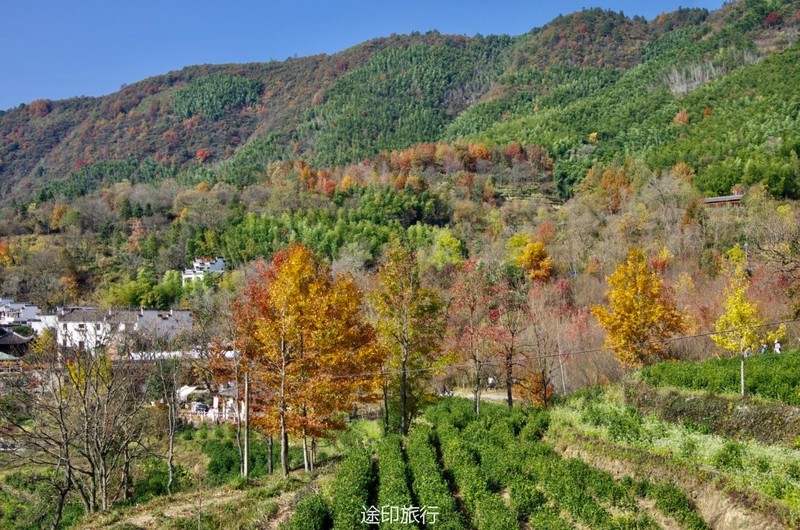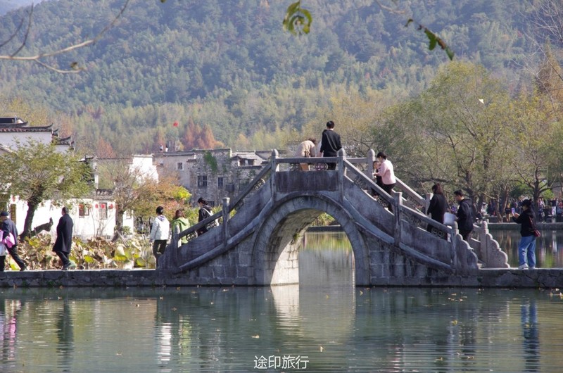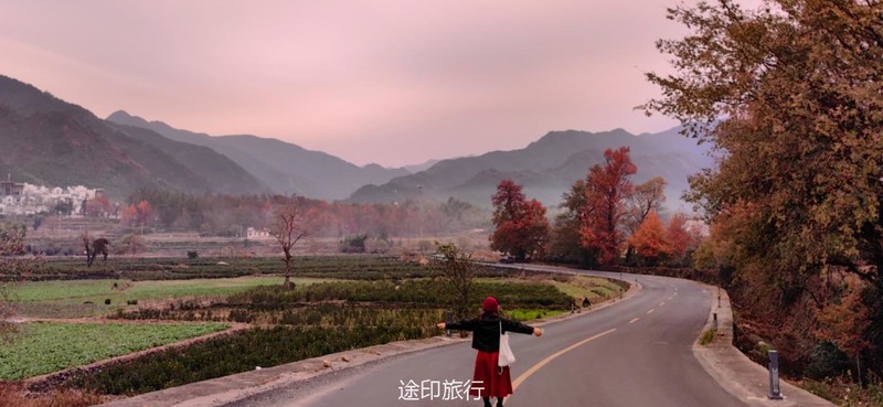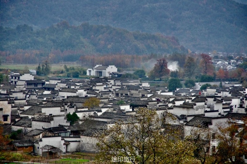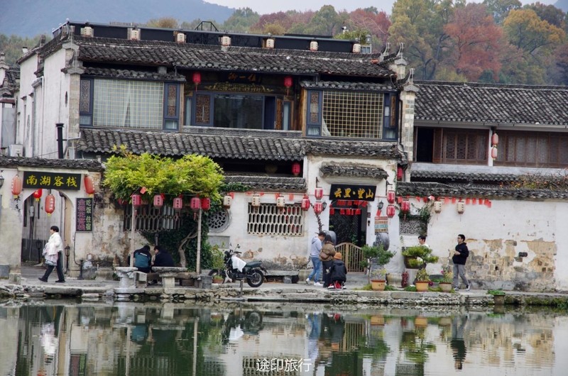 塔川村依山而建,飞檐翘角的古民居,层层叠叠,错落有致,远远望去,就好象一座宝塔矗立于山谷之中。这就是“塔”字的来历。一条清澈的小溪穿村潺潺流过,给村子带来了云烟缭绕的和生生不息的景象。因此有“川”一字。合起来就是“塔川”。 塔川以村落中错落有致的乌桕红色而出彩,乌桕树在经过霜降以后,由绿变黄,又黄变红,中间呈七彩。我们从塔川景区进去,景区内有一个红枫观景台,可以俯瞰村落。 然后下到河谷的田间小道,再一路经梓路-老屋树上-协里-杨家-丰登村-奇墅湖-宏村,走个半环线10公里,到达宏村。