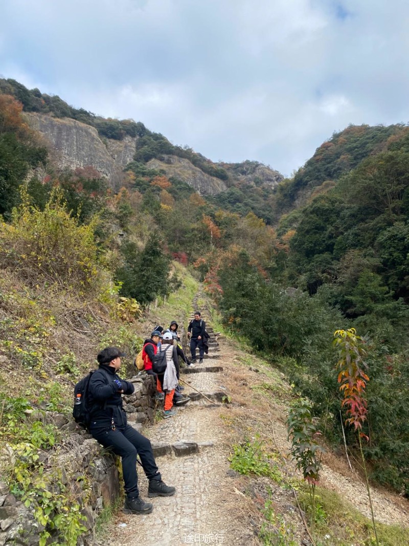 今天是我第三次带着徒友们来到栖霞坑赏秋,见证了栖霞坑各个不同时期的景色,每次都有不同的感受。上午11:20到达徒步起点,稍作休整后便开始沿着古村落往里走。古民居沿着溪流依山而建,白墙灰瓦,屋高低错落。再往西便到了村西口,远望峡谷深处,翠竹摇曳。南培岭筠溪之上有座“永济桥”,建于清朝乾隆初年,也是一座单孔石砌古桥。它连着栖霞坑村的千年古道,以前是奉化去往余姚、绍兴通商的必经之路,是唐诗之路浙东段的重要通道。