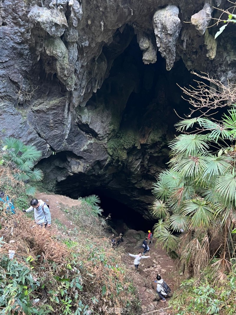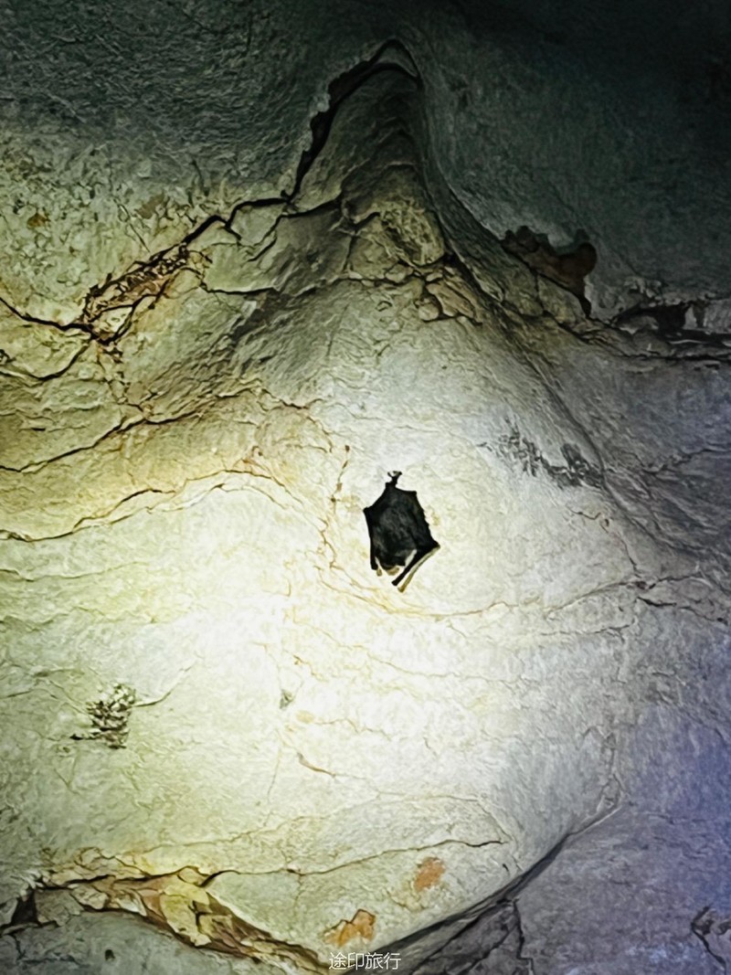 二十几人很快就穿过洞口,沿着石路通往洞内,可能洞外实在是太热了,洞里感觉比较凉。站在洞内二层和三层之间望着洞顶,会清晰地看到飞着的蝙蝠,偶然近距离拍到一只落在洞壁的,下午三点左右,我们原路返回洞口处,山顶处拍合照,返程下山。