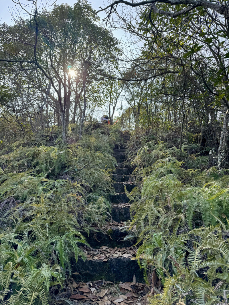 后续在蕨根丛中下山,这一段下山比较好走,为了赶在太阳下山前走出山林,大家也加快了步伐,最后走在公路上,徒步至起点,到的早的小伙伴在农家吃了面、炒年糕,也是对一天徒步的犒劳。
