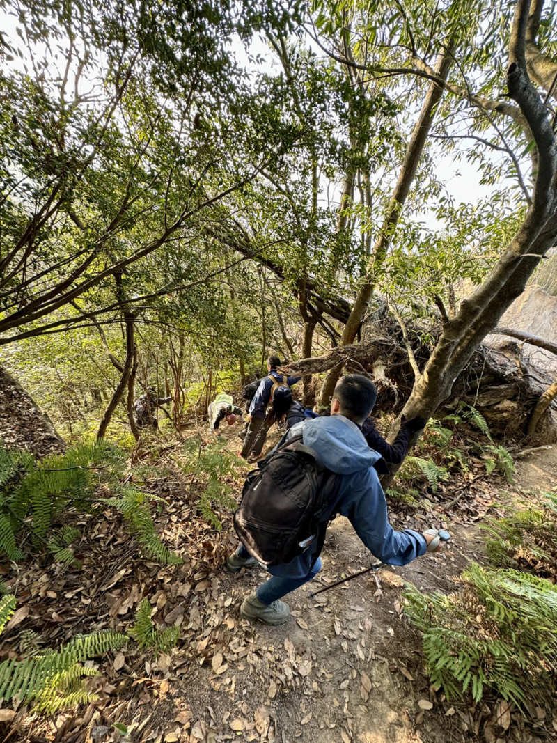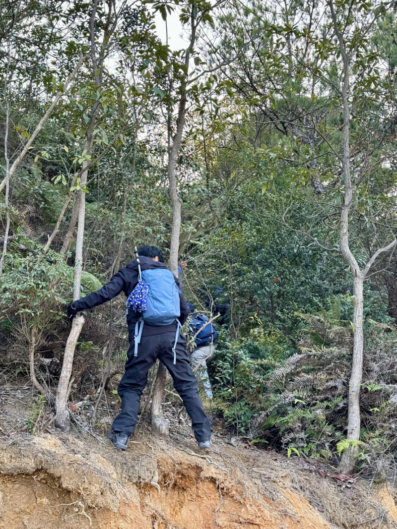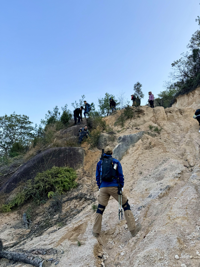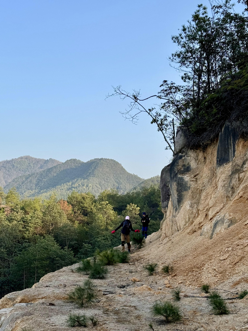这座山以山路为主,中间一侧是矿石开采区,我们需要翻越到后山走野路过去。说是野路真是野路,只能靠抓住周围的树木和树根下坡,滑滑擦擦,手脚并用,各种下降方式各显神通,大家全程互相帮忙,安全感增加了不少。