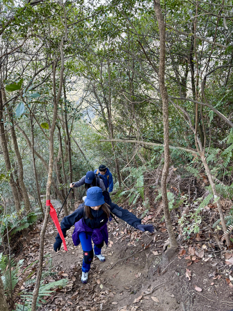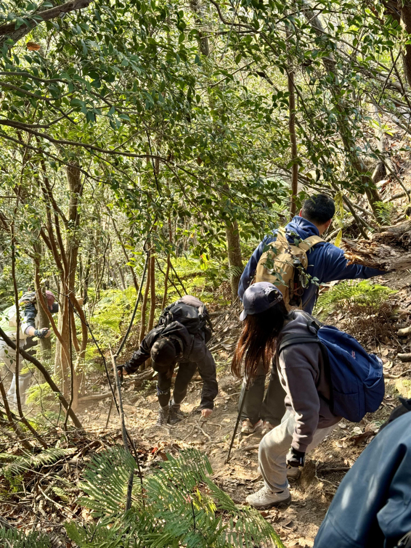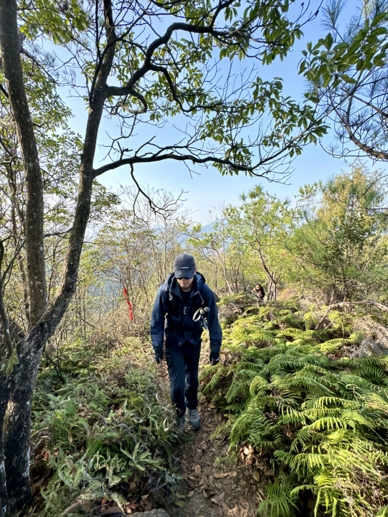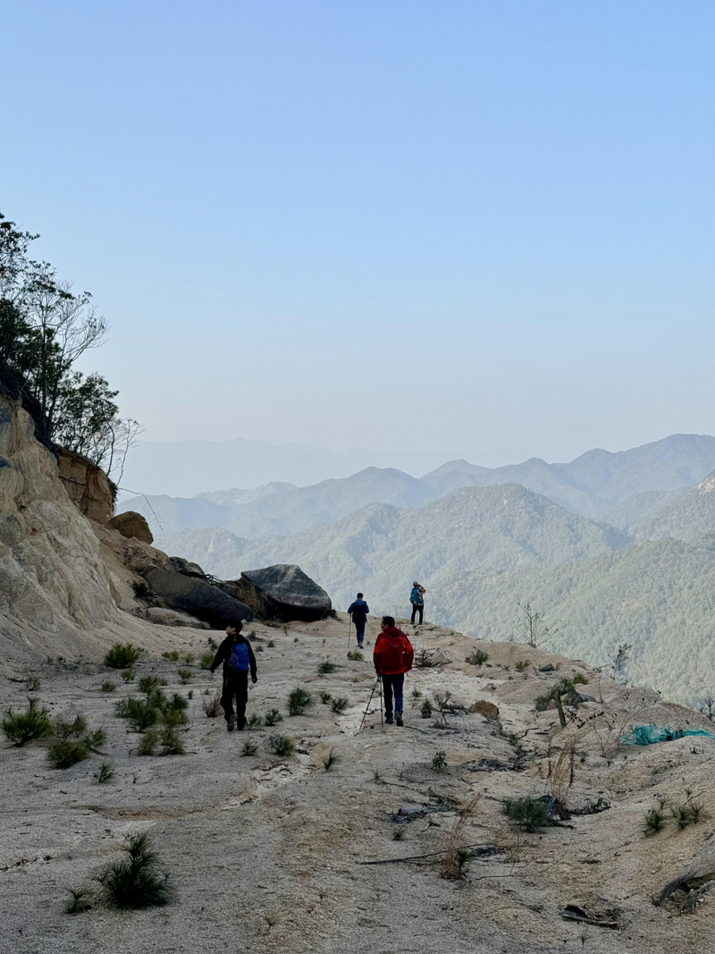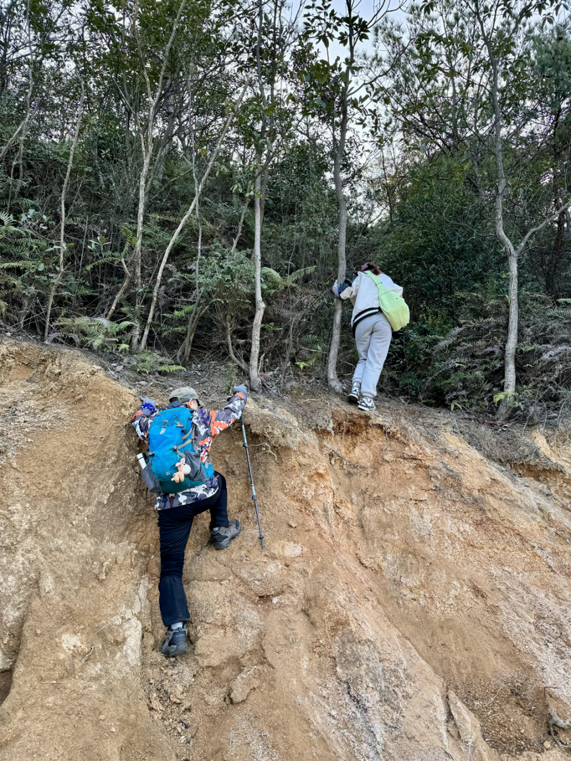 这座山以山路为主,中间一侧是矿石开采区,我们需要翻越到后山走野路过去。说是野路真是野路,只能靠抓住周围的树木和树根下坡,滑滑擦擦,手脚并用,各种下降方式各显神通,大家全程互相帮忙,安全感增加了不少。