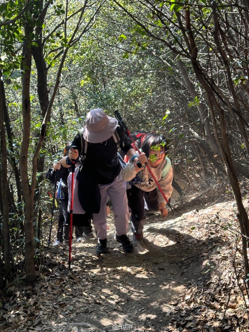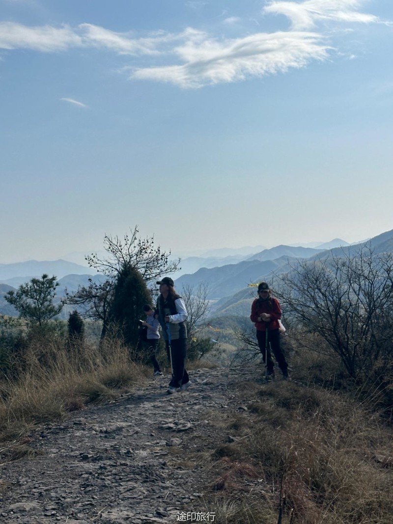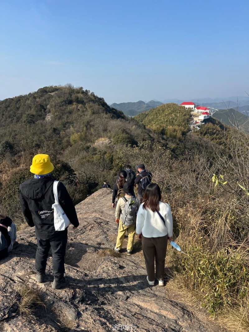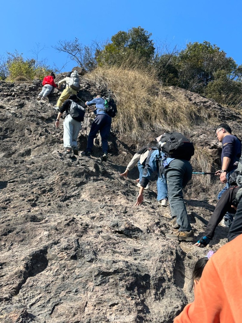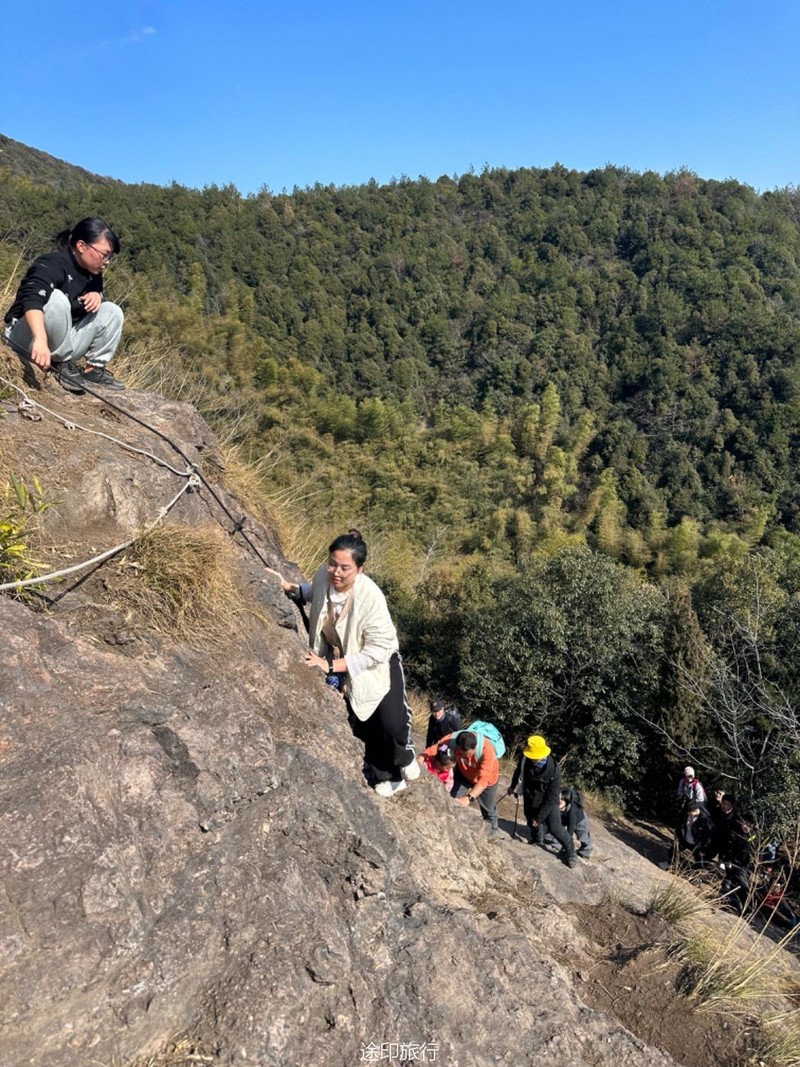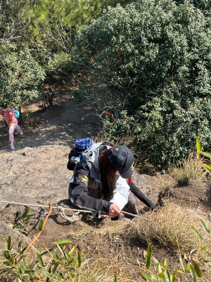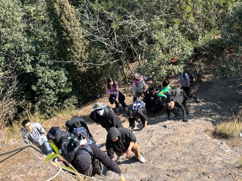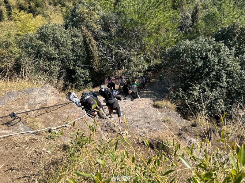 我们在道观边解决了午饭,然后往石崖边走,石崖是这段行程的一个难点,需要攀爬10来米高的崖壁。不过铺了绳子,所以也很顺利的通过,接下来就都是很简单的路线了。