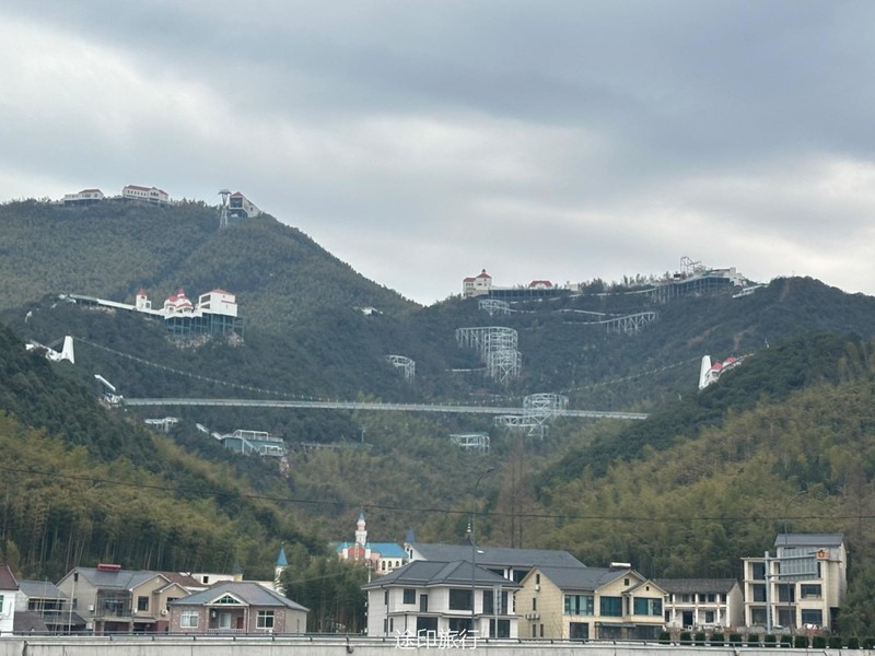 我们继续爬升到了最高处,可以远眺莫干山主峰,这里已经开始建设景区了,不知道是否以后会收门票,且行且珍惜吧。 我们开始下山,到了小九寨沟,水一如既往地蓝,旁边的建筑的开始完善了,相互辉映。更加漂亮。 沿着公路一段我们就到了停车场,回望大山,和去年很不一样了。山上的房子,公路,索道等改变了山的面貌。不知是好是坏。