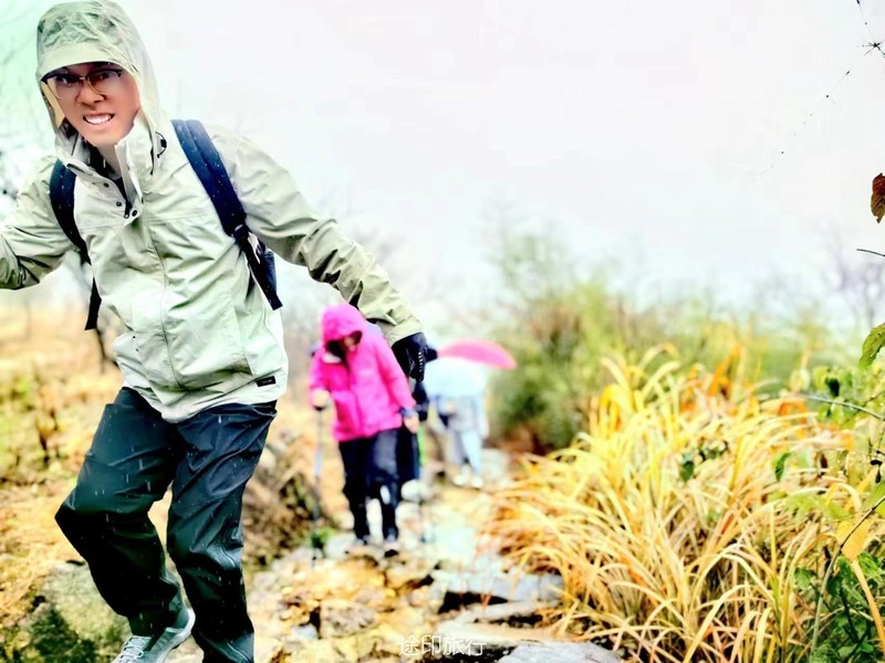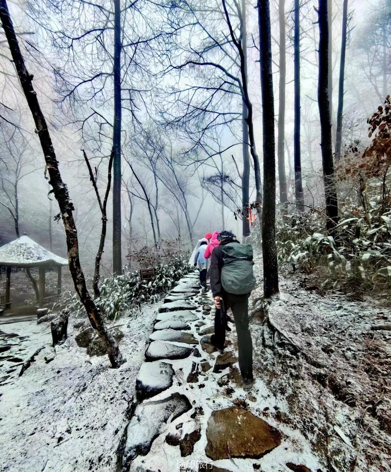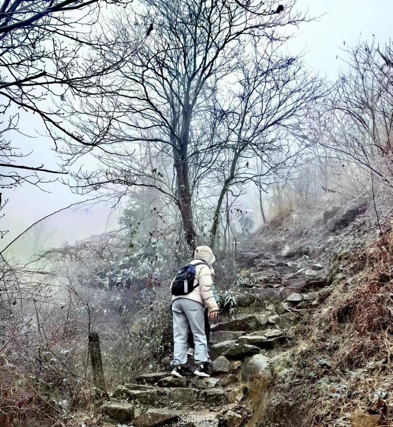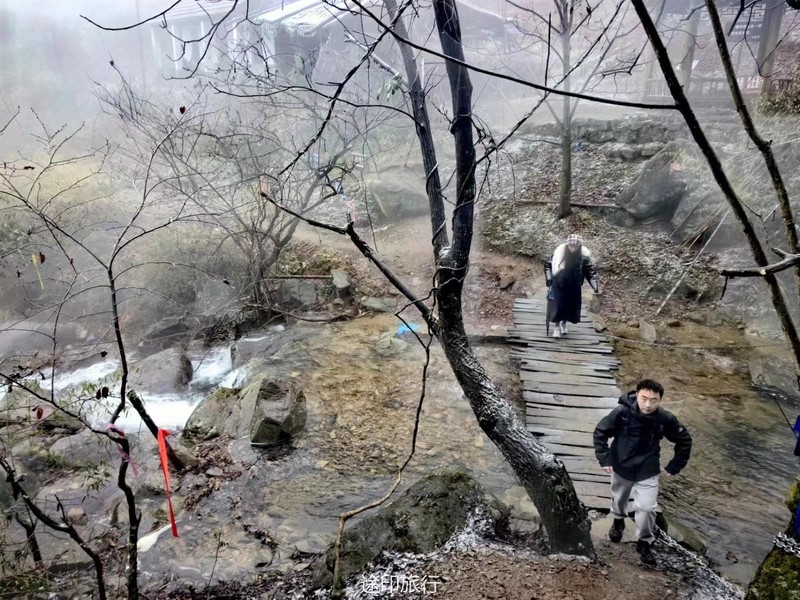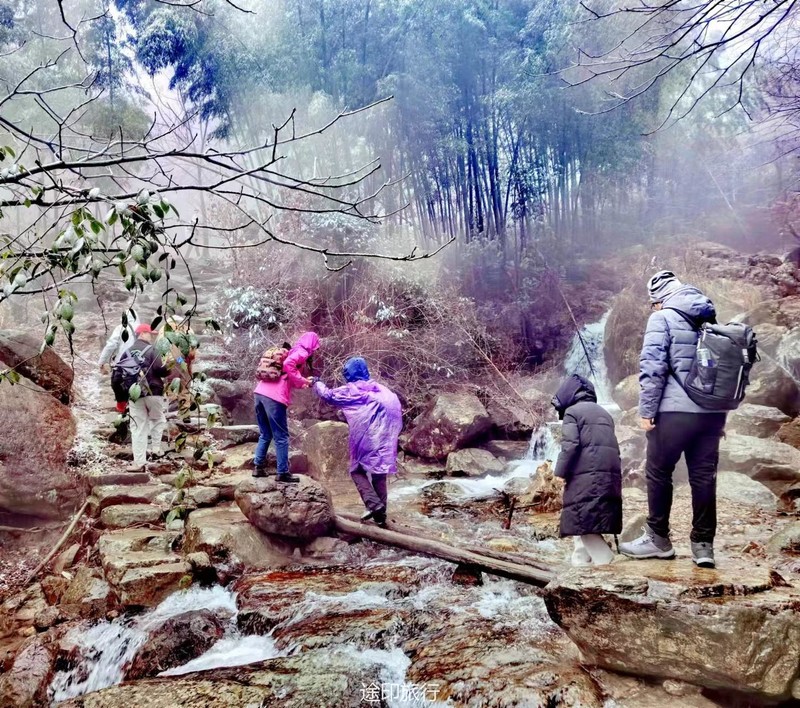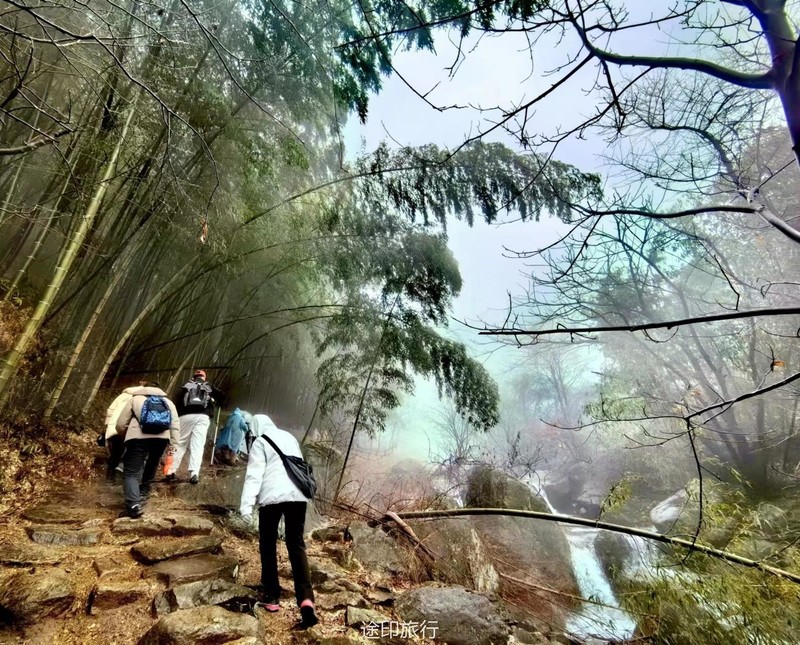 此次行程我们选择了较为自虐的线路,一路从万家乡大塔村拾阶而上由山地峡谷中慢慢地往上爬行,最后,到山顶观浙西天池。冬季的吴越古道别有一番风味,一路枝挂冰晶,美不胜收。到达天池后迷雾朦朦,不禁让人联想到草船借箭中的大雾漫江,小伙伴们顶着彻骨的寒风,踩着时而湿软,时而泥泞的滩涂绕着大雾弥漫的天池一周,期间互帮互助跨越溪流最终完成环天池的整个行程后,不禁戏称也体验了一番过草地的乐趣~