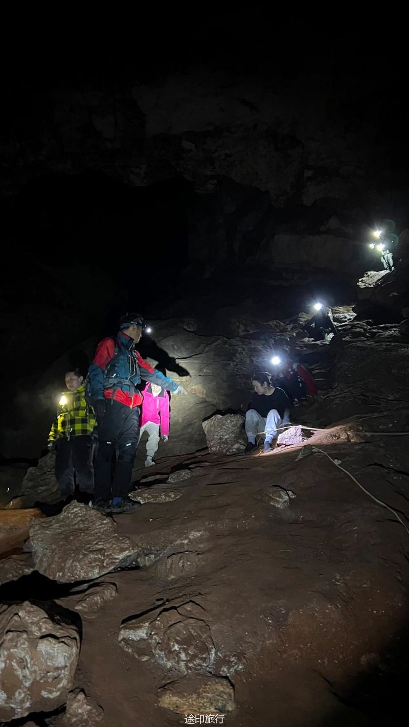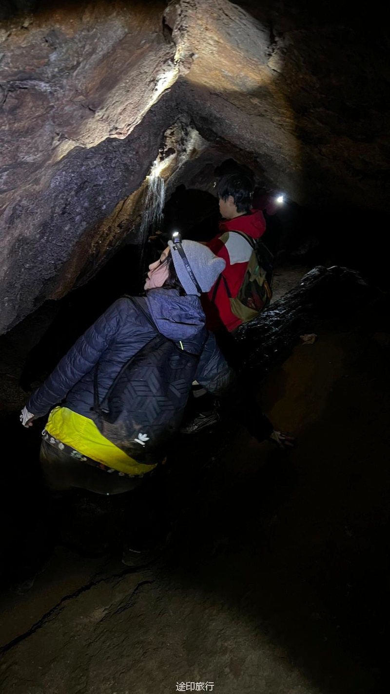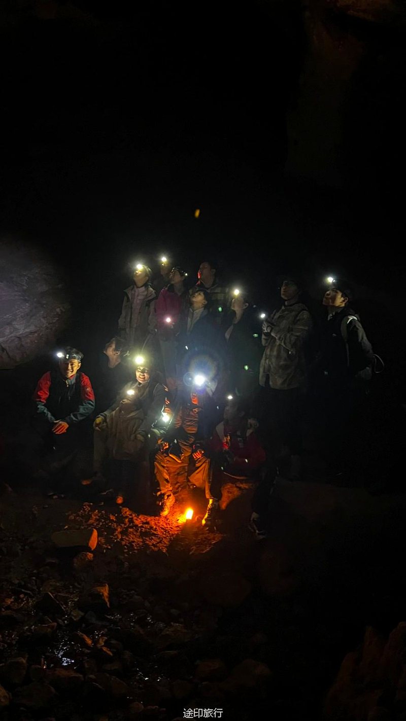由于当天下起了小雨,抵达山脚,雨雾缭绕,仿佛给整个山林披上了一层轻纱,山路湿滑,每一步都需要小心翼翼,增添了几分探险的刺激感。来到洞口,大家脱掉雨衣,吃着午餐,雨水从洞顶滴落,与洞内的寂静形成鲜明对比,深深感受到大自然的魅力。