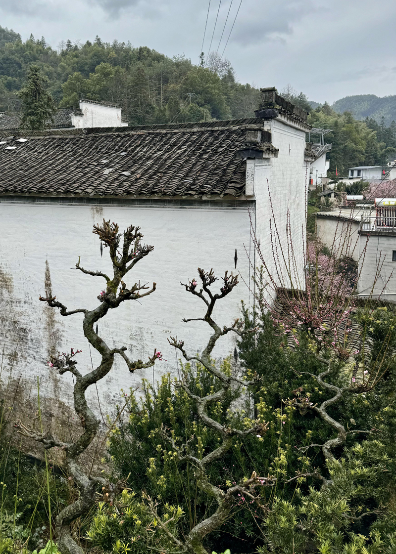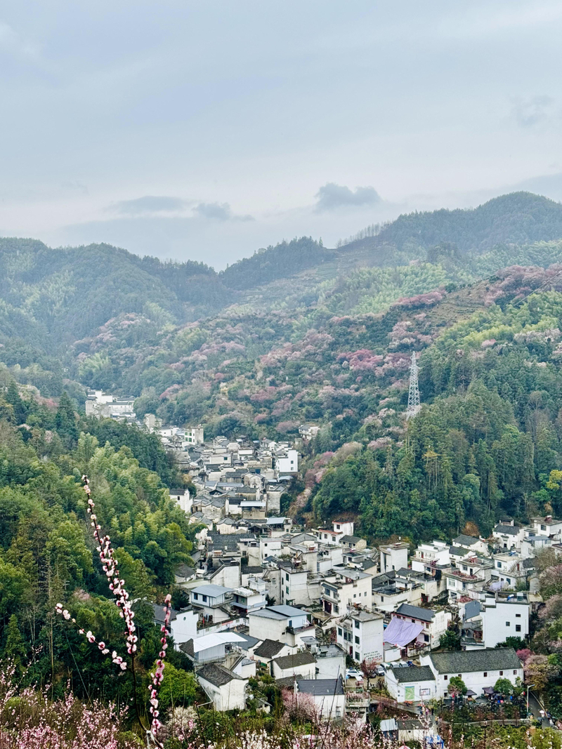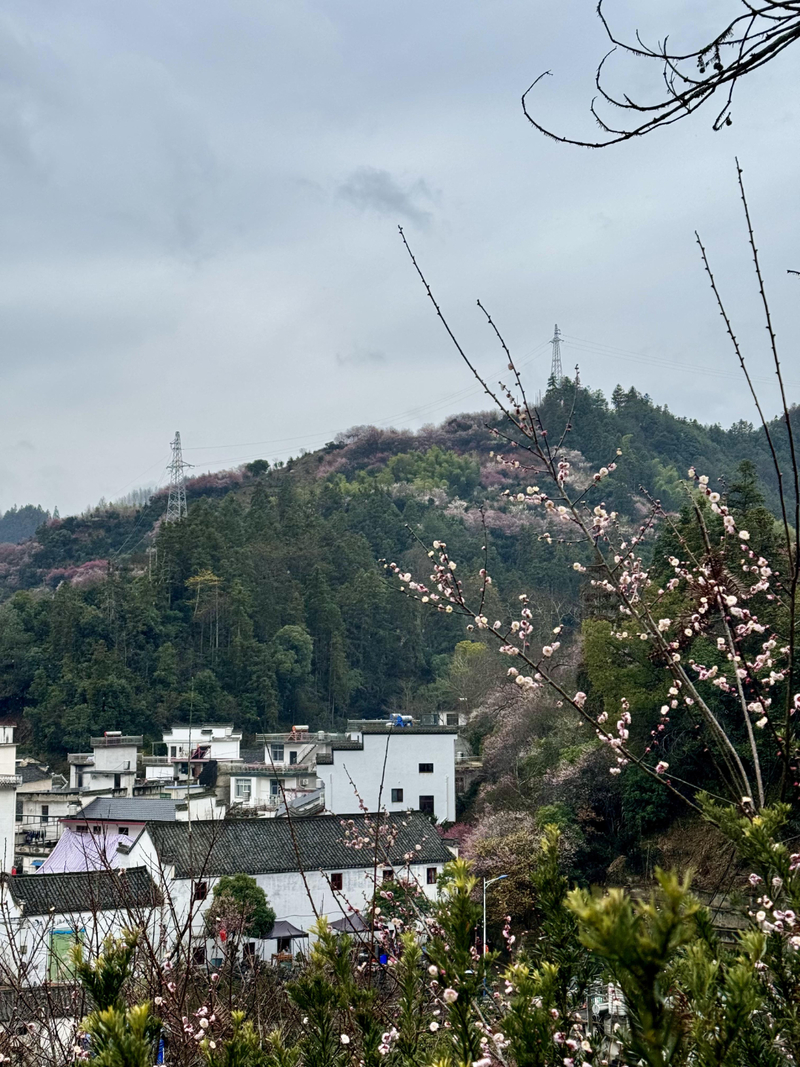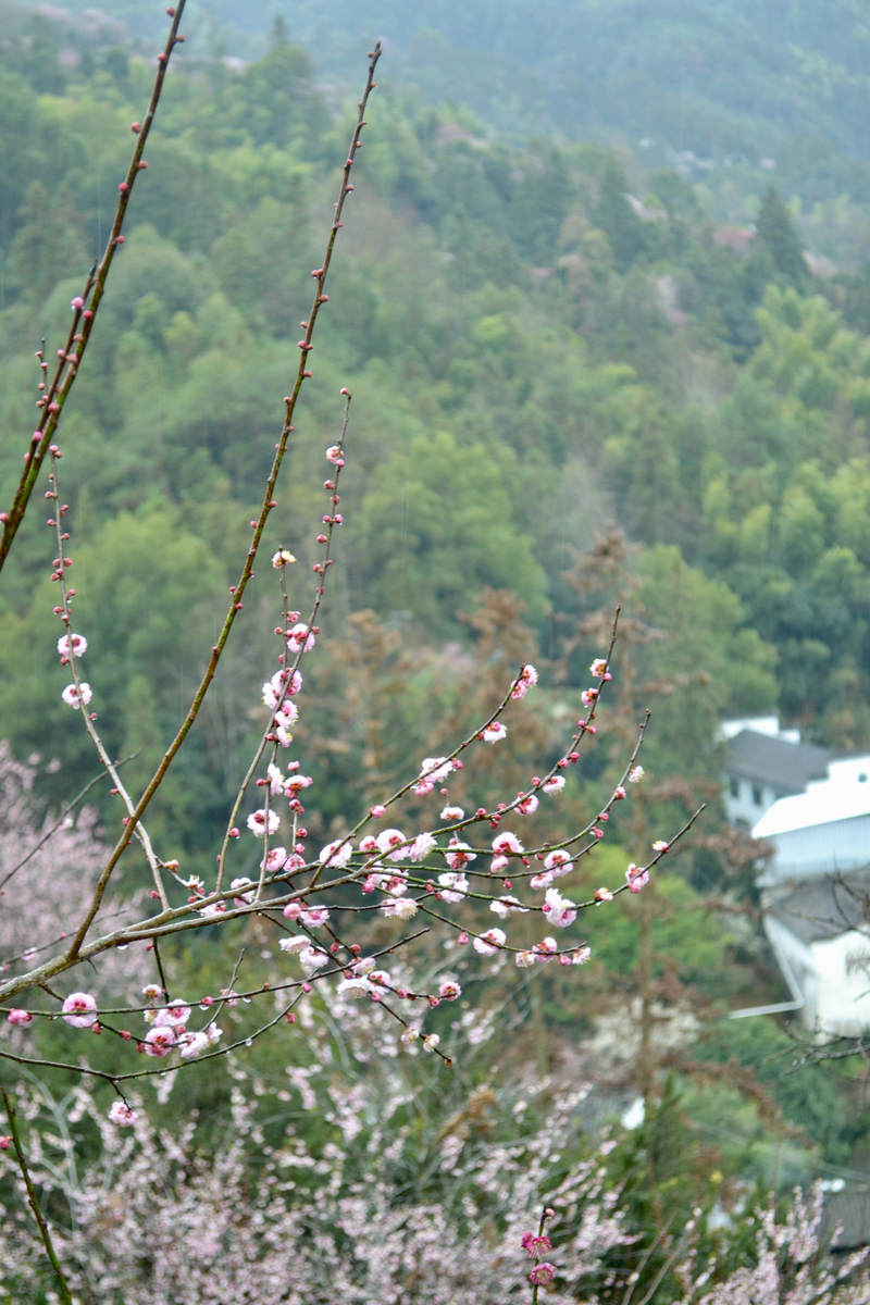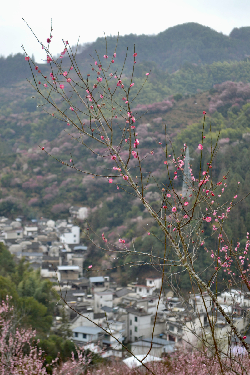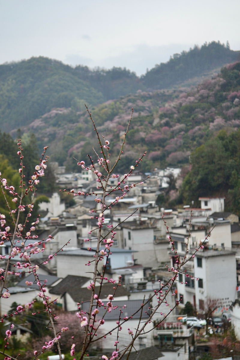 我们首先来到山村的高出,村落四面环山,坐落在山坳之中,俯瞰满山遍野梅花林,夹带着徽派白墙灰瓦的村庄,很壮观。也是由于小雨阴天的天气,更是增加了一些云海的感觉。
