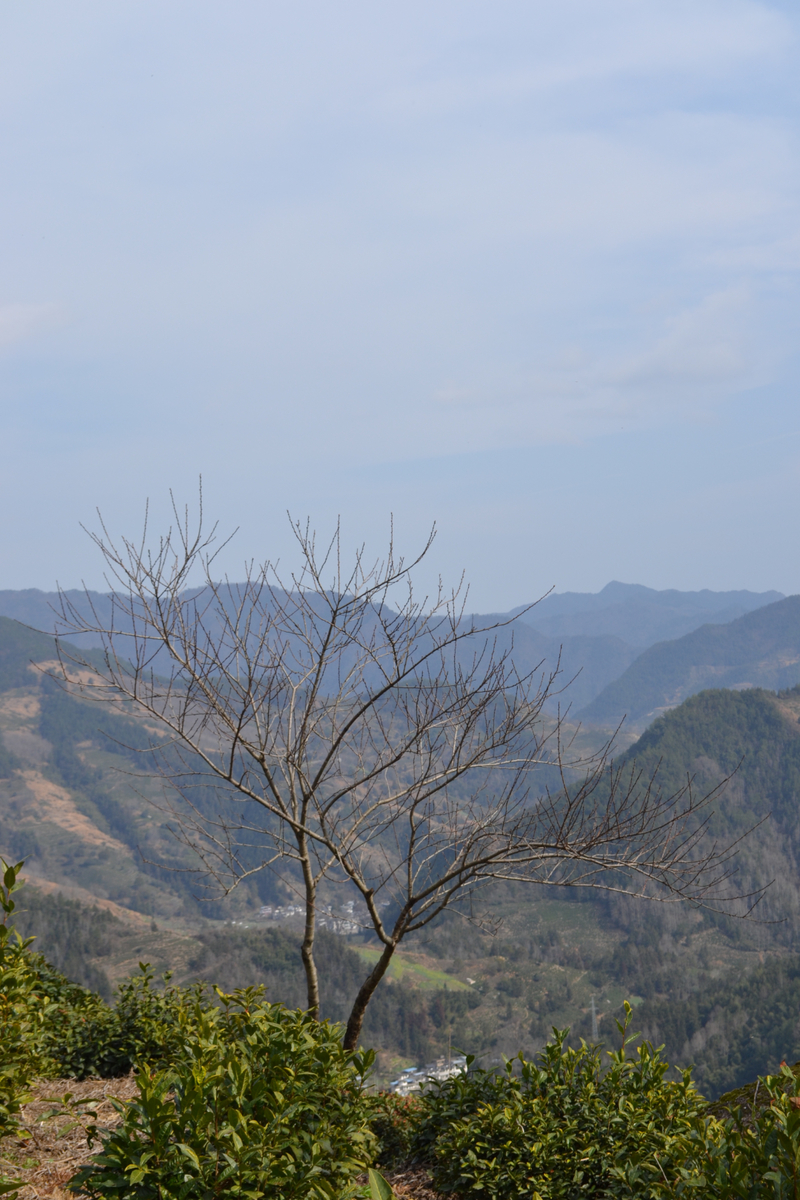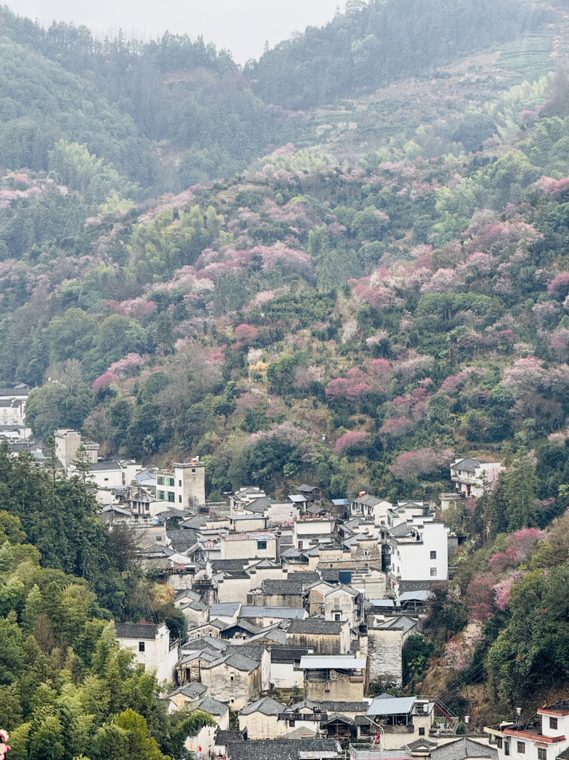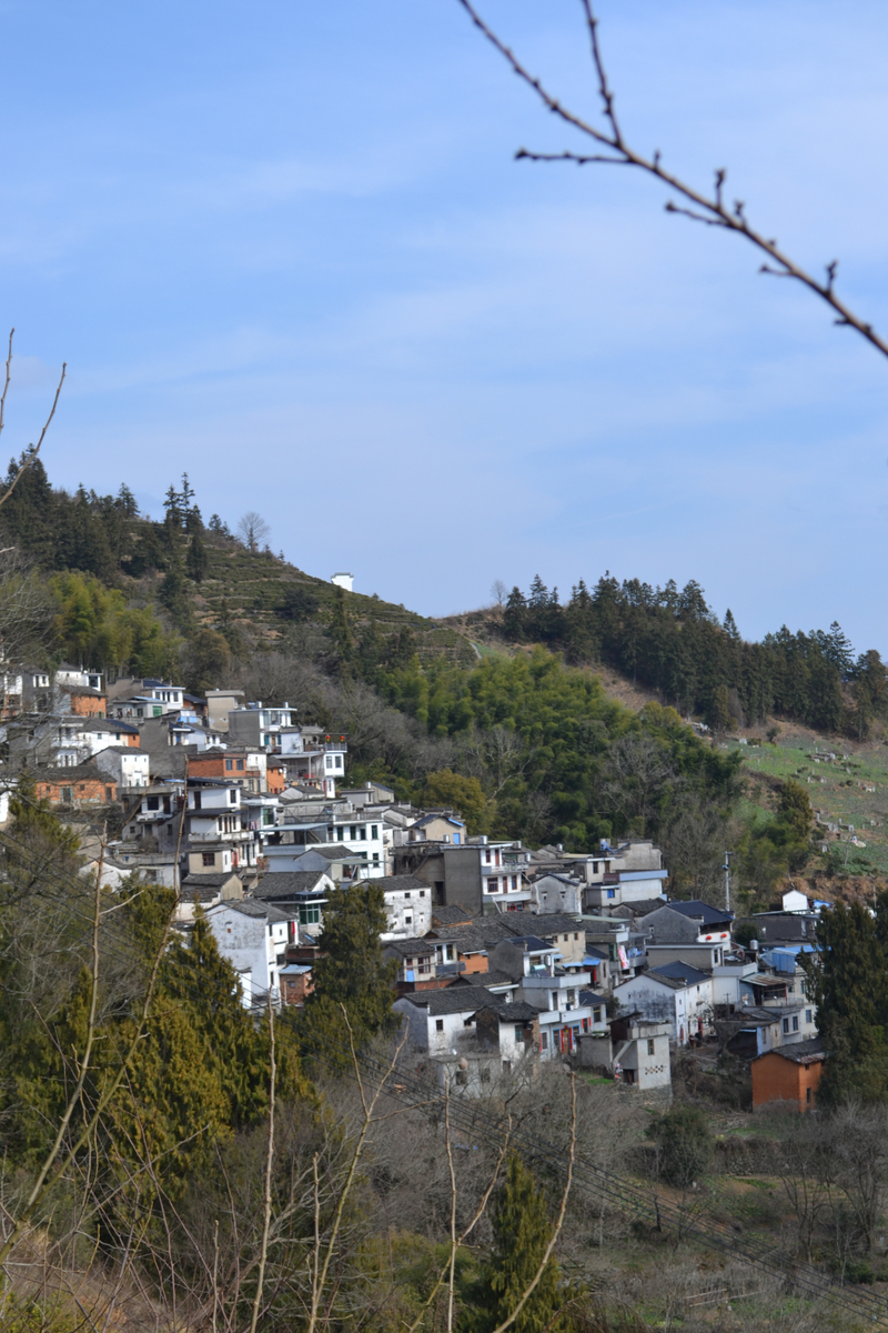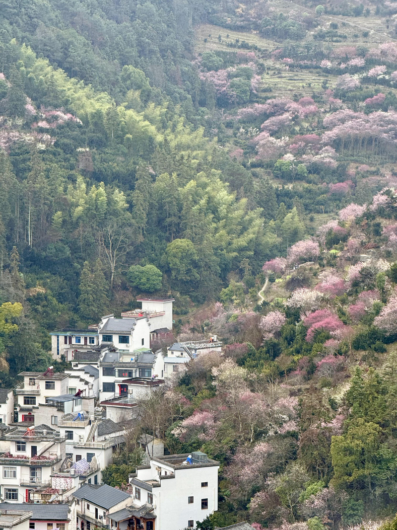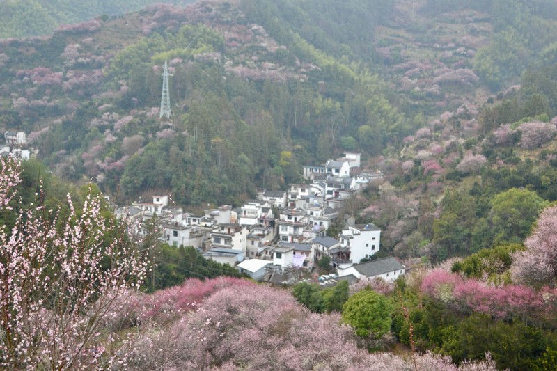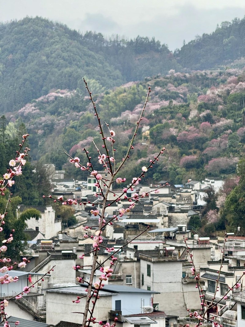 我们首先来到山村的高出,村落四面环山,坐落在山坳之中,俯瞰满山遍野梅花林,夹带着徽派白墙灰瓦的村庄,很壮观。也是由于小雨阴天的天气,更是增加了一些云海的感觉。