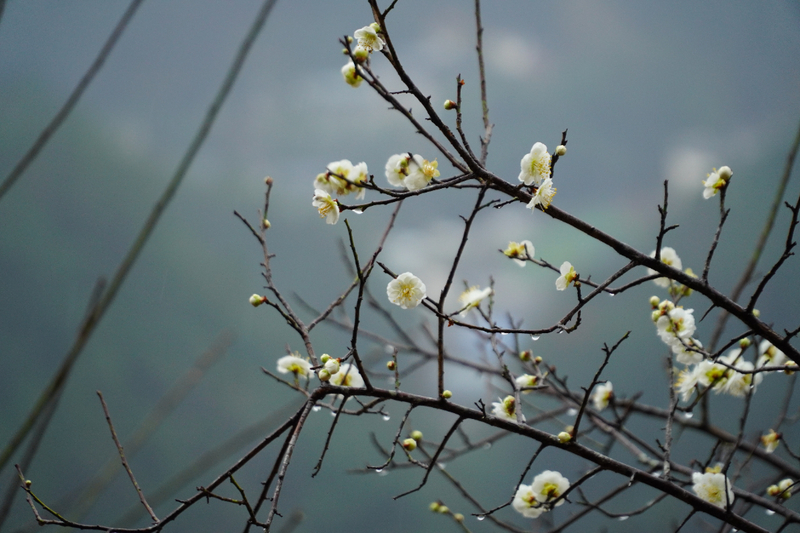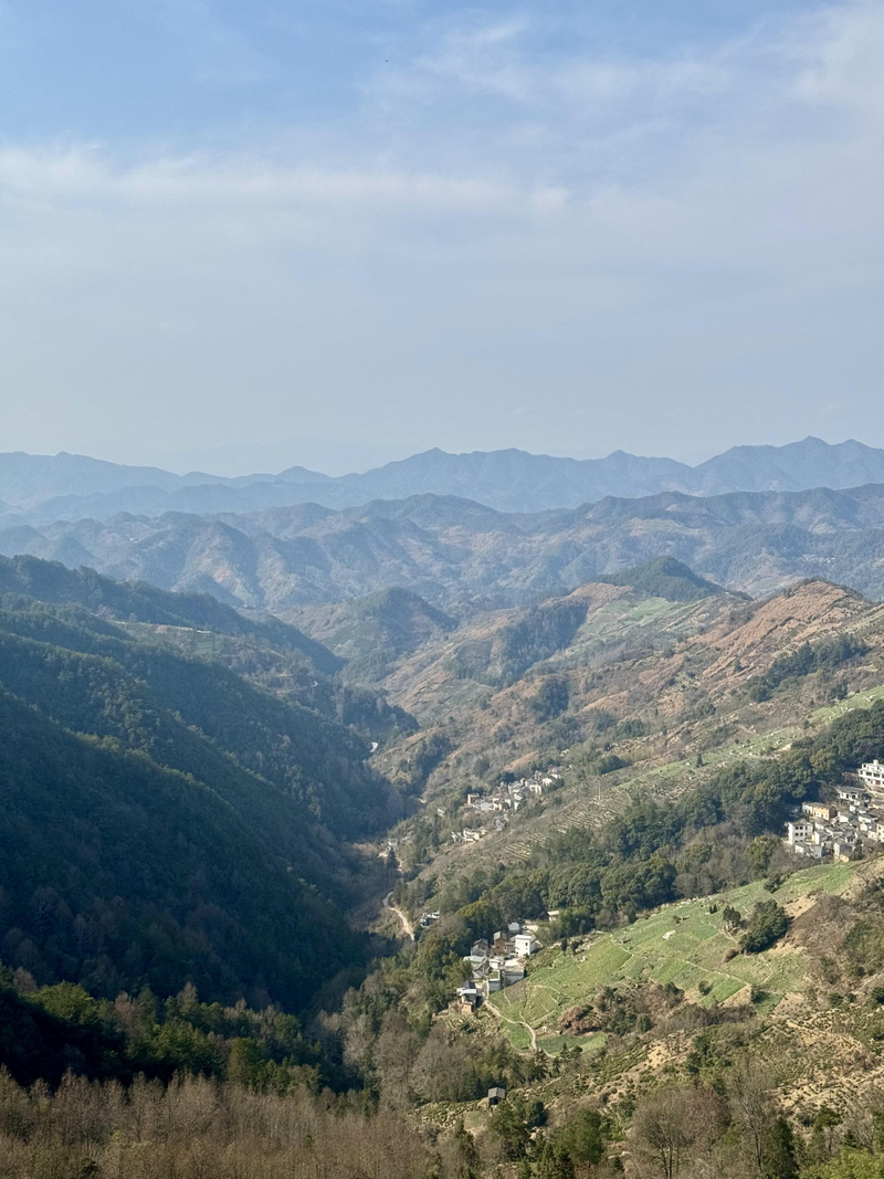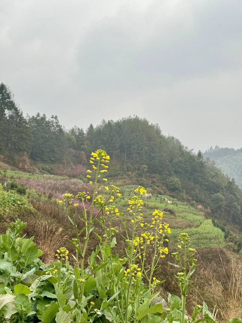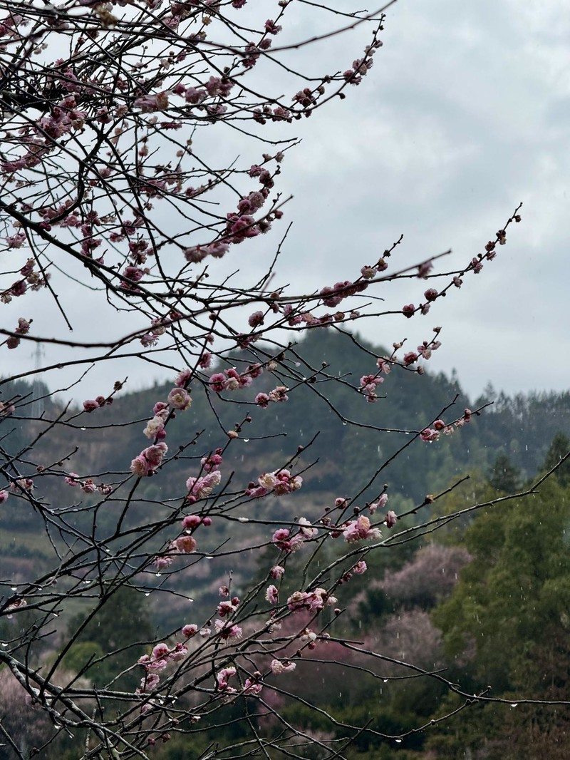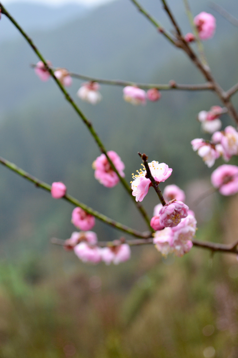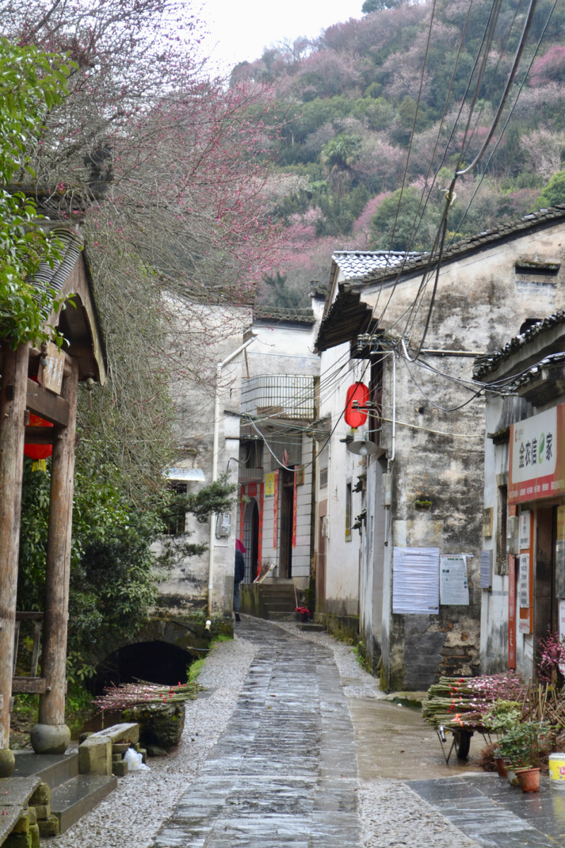 我们首先来到山村的高出,村落四面环山,坐落在山坳之中,俯瞰满山遍野梅花林,夹带着徽派白墙灰瓦的村庄,很壮观。也是由于小雨阴天的天气,更是增加了一些云海的感觉。