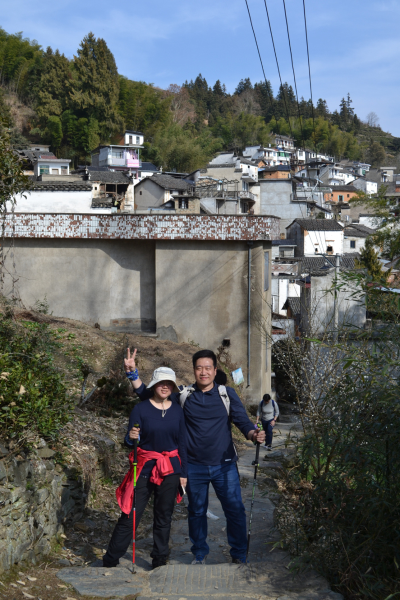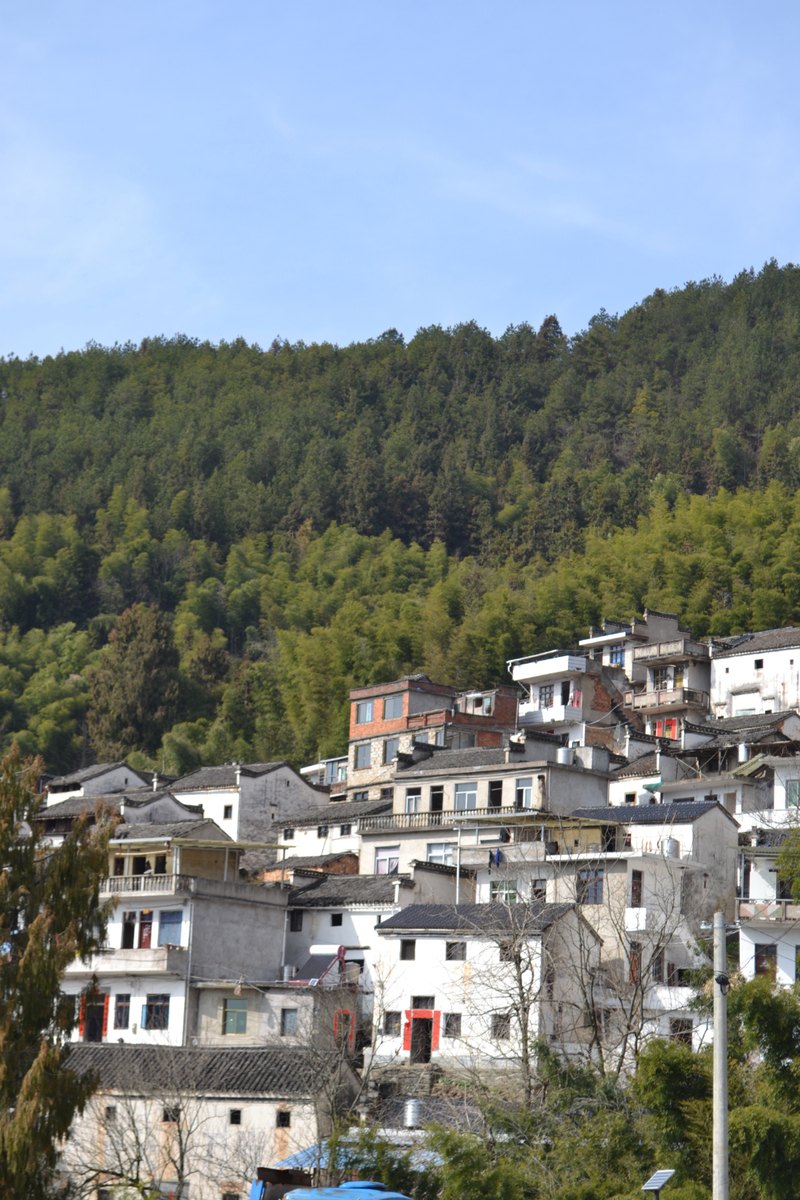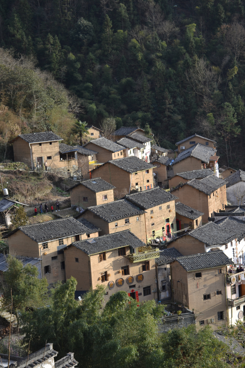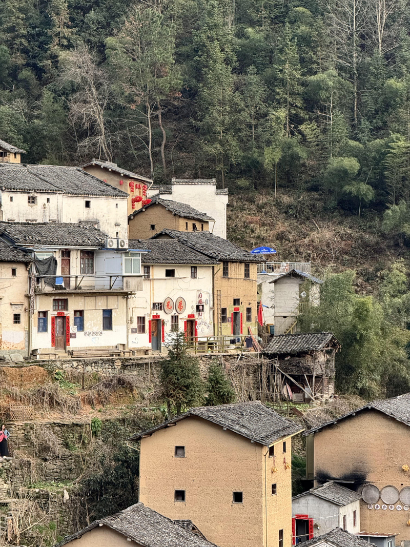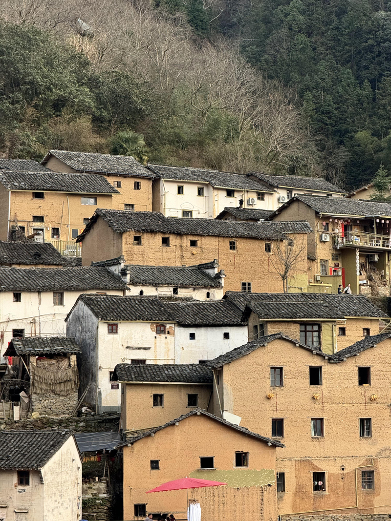 经过不到4小时的徒步,我们来到阳产土楼,白黄相间,与村庄周边的古树林一起构成一幅绝妙油画。阳产土楼位于皖南山区的深渡镇,在群山之中,是一个依山而筑的小山寨。这里由于地势高,交通不便,数百年来,山民就地取材,采周边青石铺路架桥,取红壤木材筑巢而居,形成了现在的山庄。村庄还住有村民,出去也有景区短驳车,单程15元,由于是过年期间,人比平时多了一些,要排队。