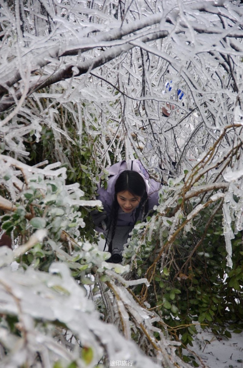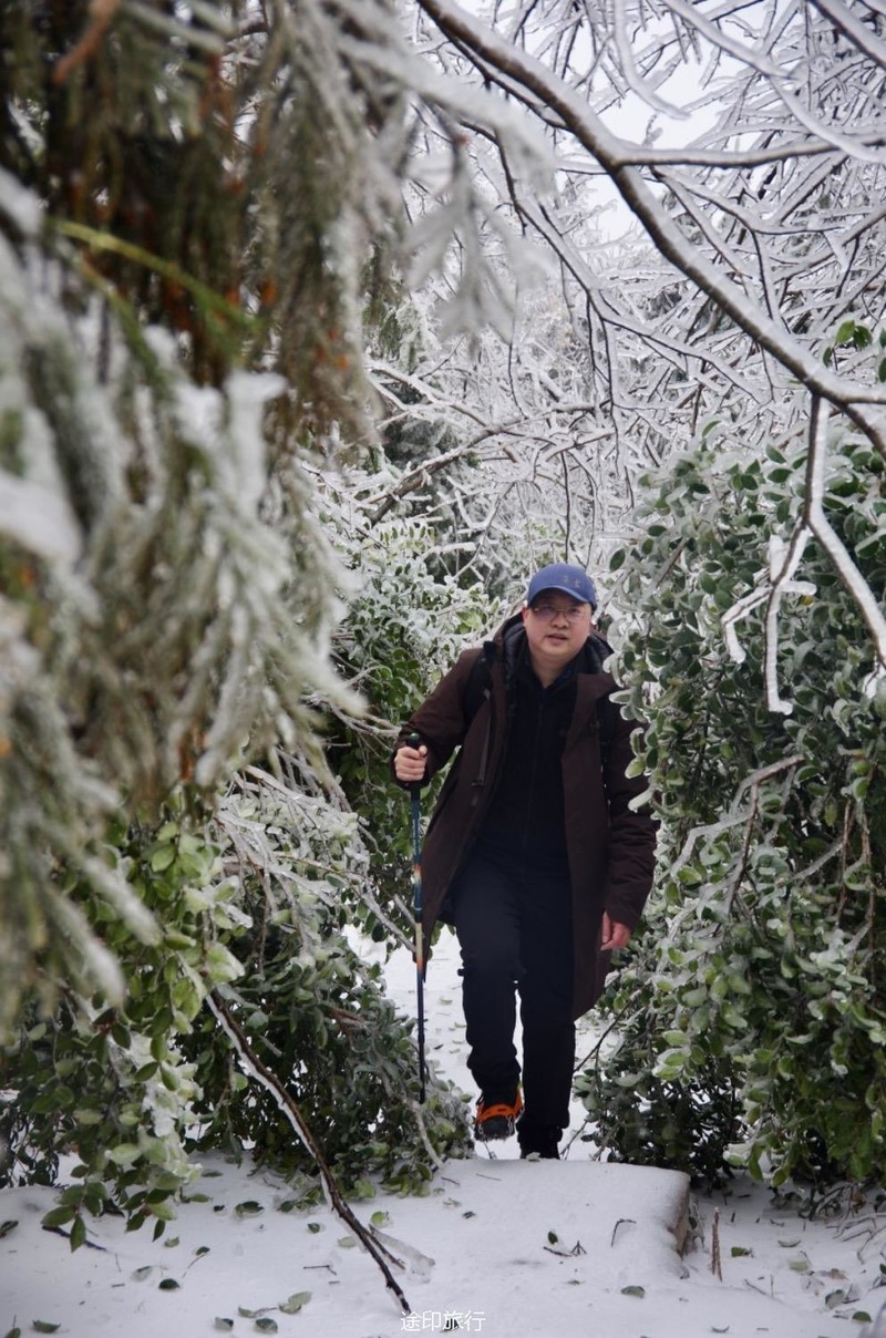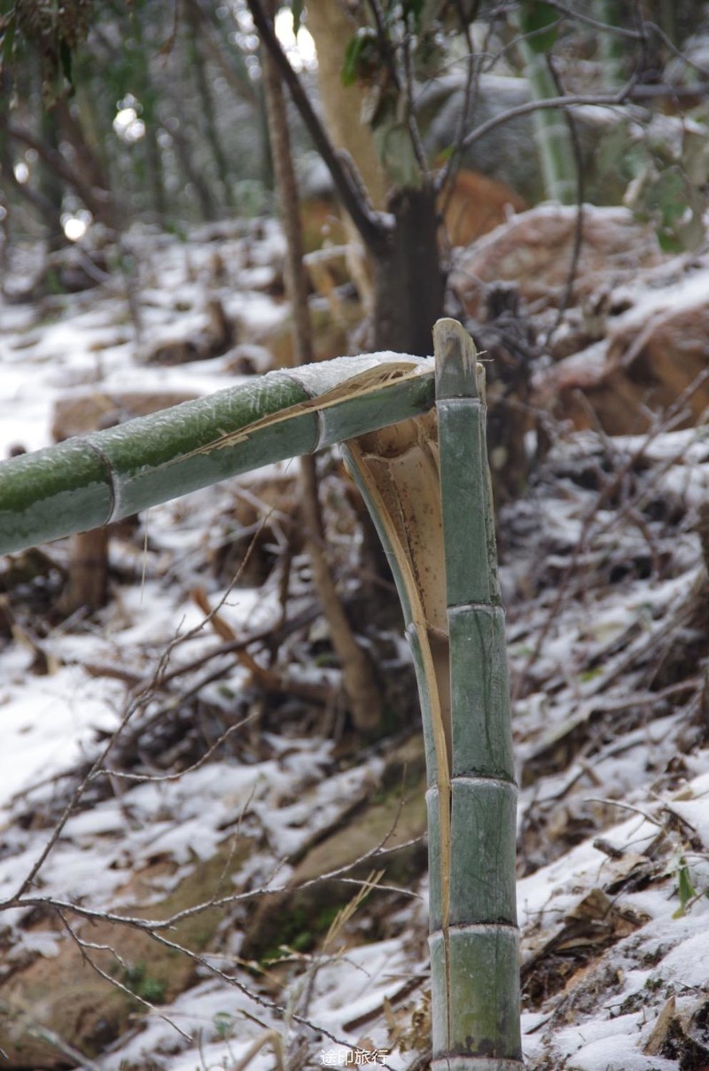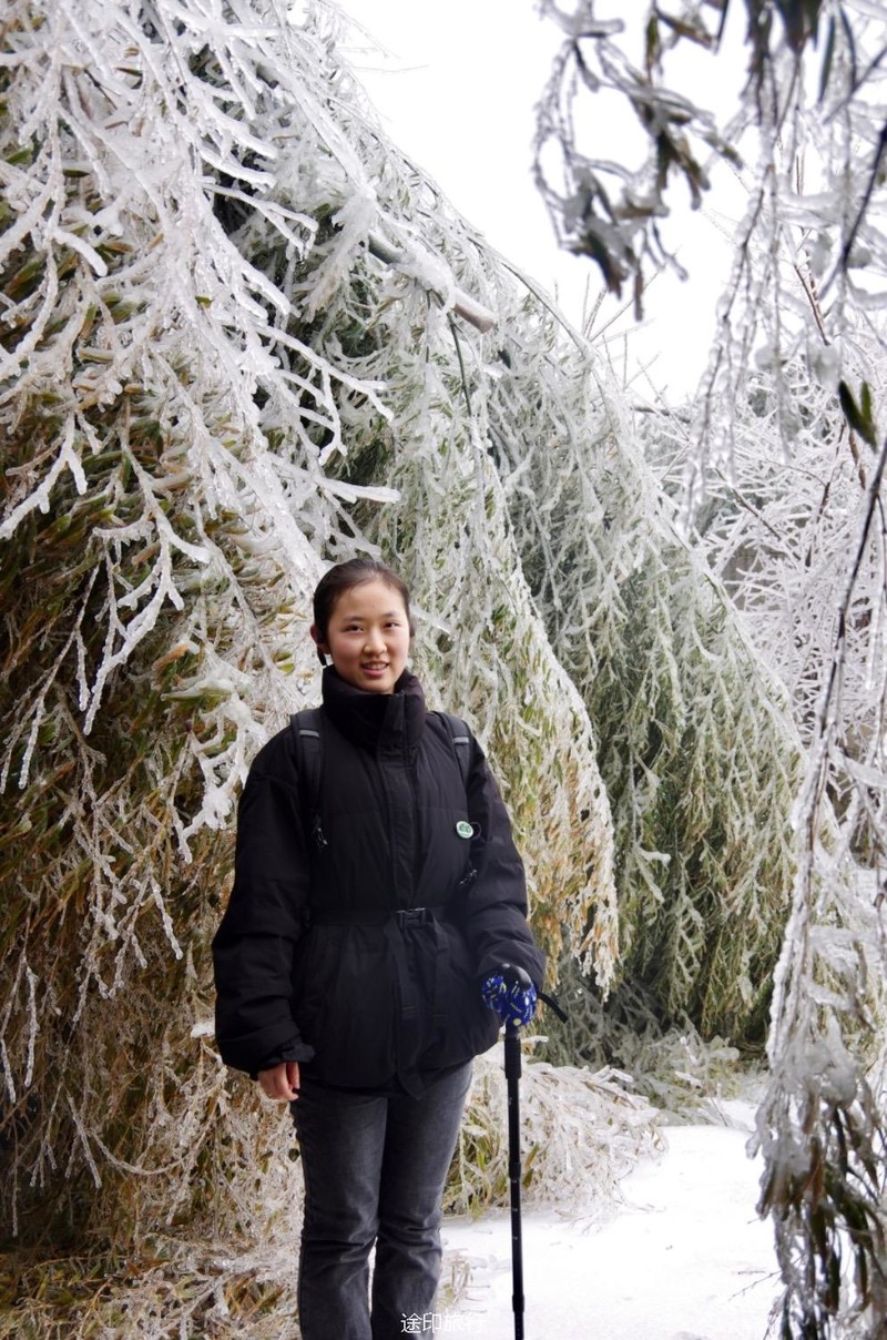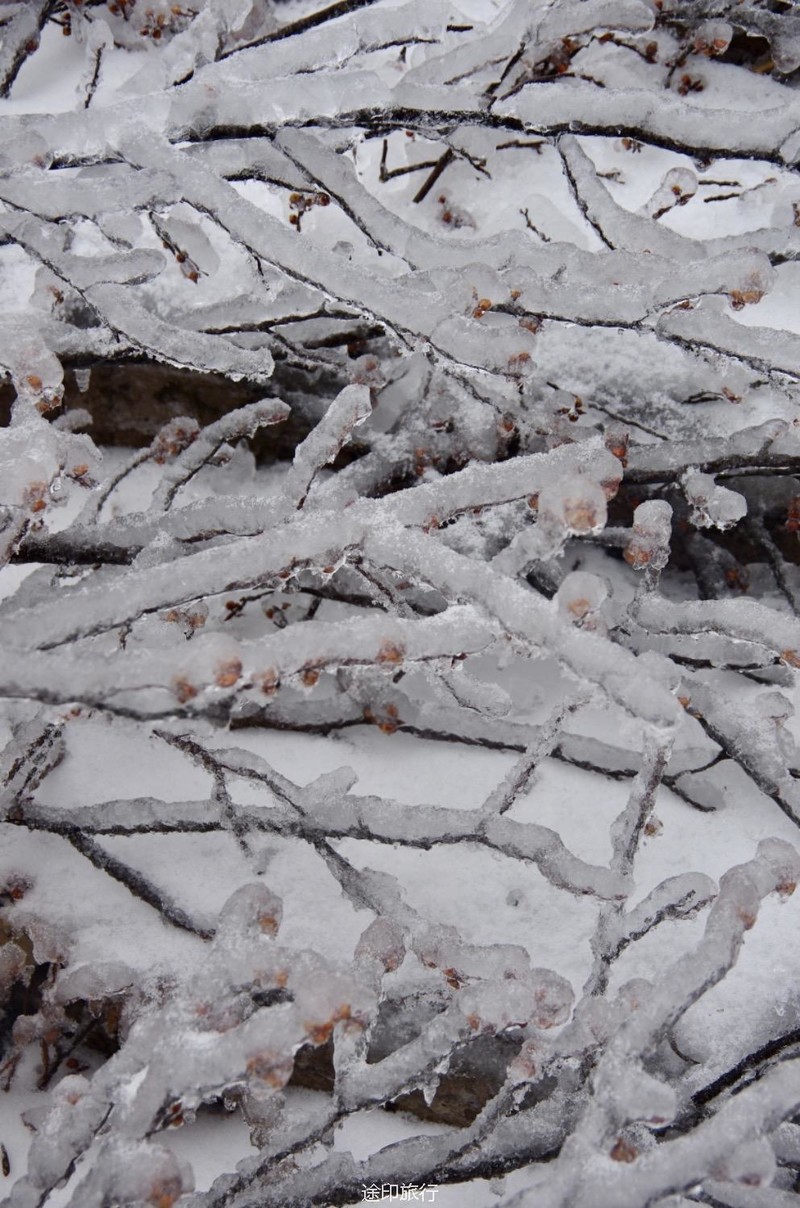 自诩是见过一些美景和世面的,依然被今日的鸬鸟山美到失语! 一场场冰雨让海拔200米开始的所有植被都冰封了,高耸的灌木丛树枝也被压断,折断的树枝,竹子,细碎的松树叶,整枝的杜鹃花芽散落满地,原本清晰的石板路基本已经没了路,钻过垂下来的树枝时冰晶清脆的声音,觉得悦耳,却又生出许多怜惜。 竹子何其坚韧和挺拔,若不是无法承受冰雪之重,又怎会向世间万物弯腰!