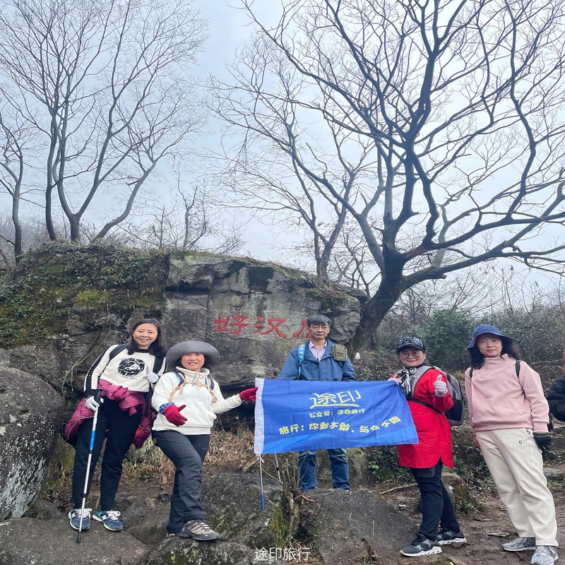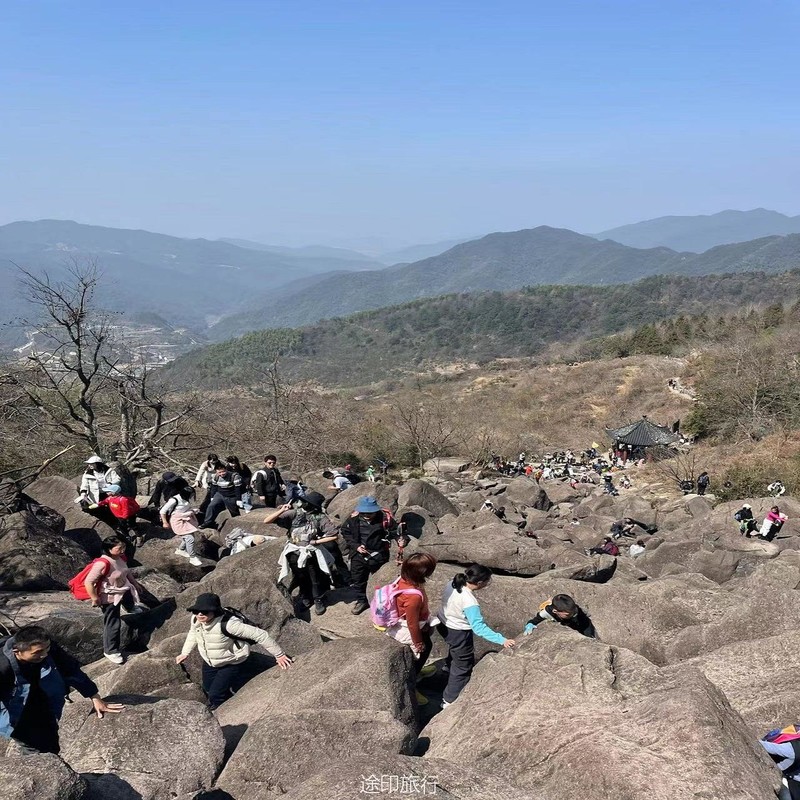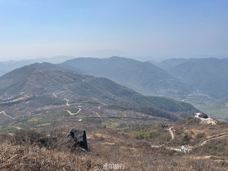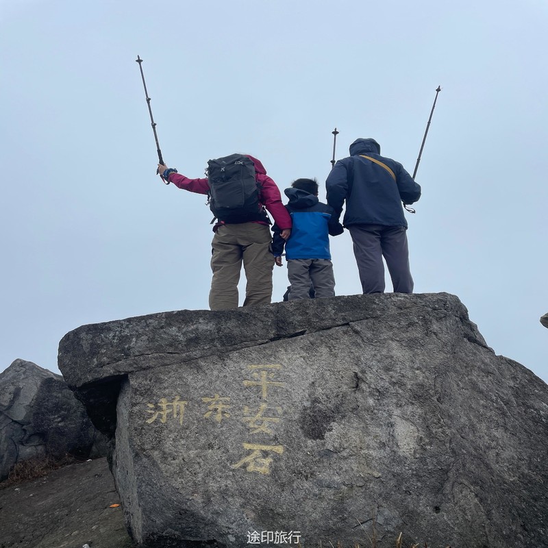 攀过石浪继续沿着台阶路往山上走,一步一台阶,两三百米的爬升,刚好有两个休息打卡点,停下来回头看,油菜花田已经在脚下,山上起了风,吹散了雾也带走了疲累,一鼓作气成功冲顶。