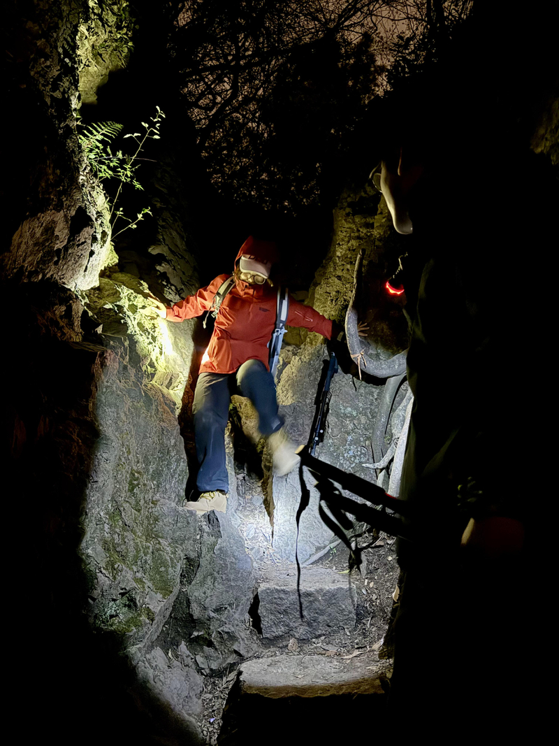 灵树线地形地貌相对复杂,强度较大,富有趣味性与挑战性。一路陡坡处事先结好了绳子,可借力上升或下降。还有小段的绳降,可以作为绳降的初体验。遇岩石阻隔前路,需手脚并用。如果想找虐,体能好状态佳,可挑战全程当作新驴毕业考;若痴迷于这一路山光水色,也可放慢脚步,徜徉其中,在两个下撤点下撤。
