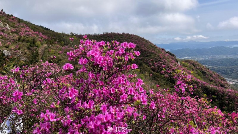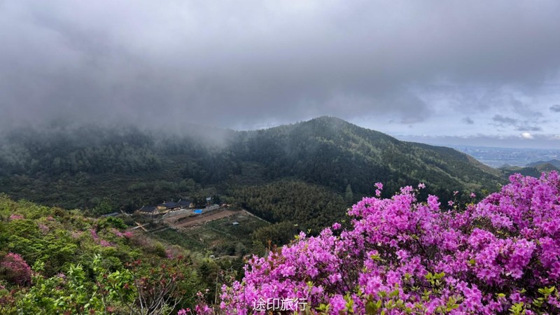 金峨山,这个位于奉化区西坞街道的神奇之地,以其数百亩的野生杜鹃花而闻名,四月份中旬杜鹃花也刚刚盛开。我们首先抵达了金峨禅寺,下车后天气渐渐放晴,沿着观音岭古道开始了一天的徒步。