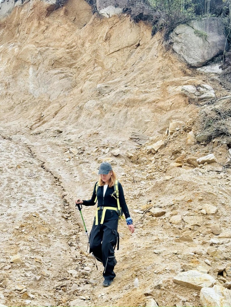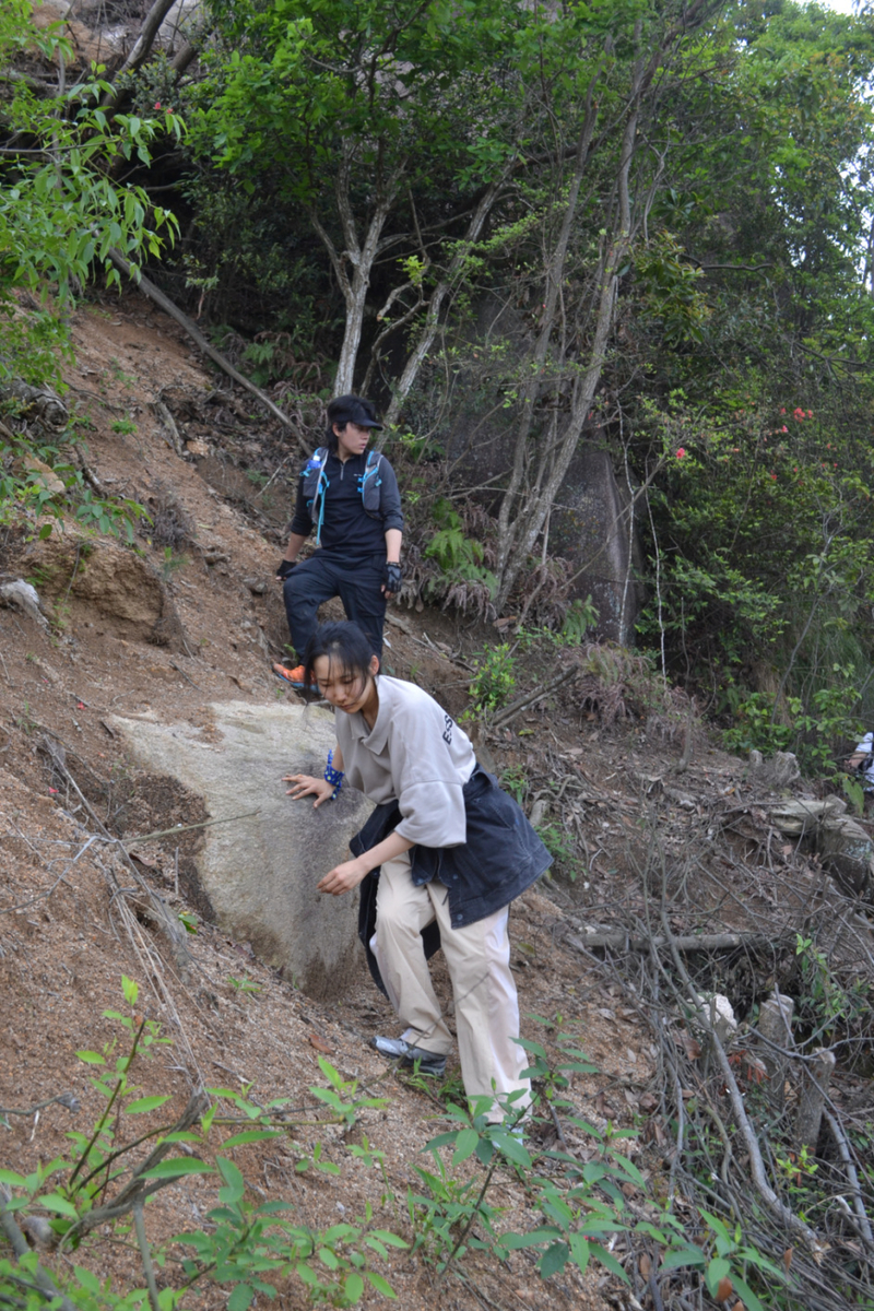 来到山底后,我们会到药王水库,这里我们要走一小段公路,公路后开始进第二座山,相比刚走的那段山,这座山以山路为主,路过一座在开采的矿山,正是因为矿山的开采,导致要走一段野路,说是野路主要是因为坡度大,没什么抓手,山路滑滑擦擦,这个时候大家互相拉一把,正是这样也增加了一些野趣,不过户外还是安全最重要。