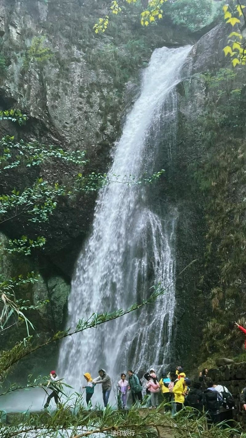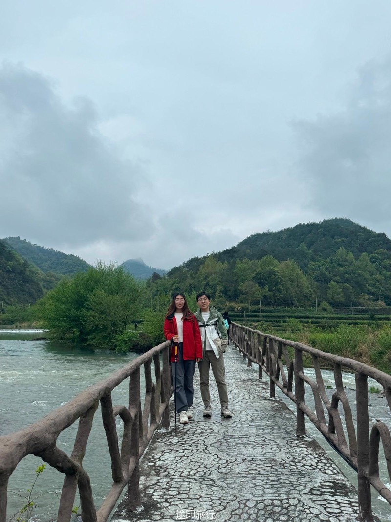 沿着石子路右边是清亮的小溪,左边是青葱的大山,我们一路沿着小溪走进山里。一路上经过了一线天、九龙飞瀑和金锁桥,路上偶尔遇到用锄头挑着篮子的村民,篮子里装着野菜和熟透的桃子。这段古道沿着山路蜿蜒而上,基本没有人工维护,风景也是一绝。到达山顶有清凉的山泉水,我们稍做休整继续下山,团队中的小朋友活力满满,迈着轻快的脚步一路飞奔。