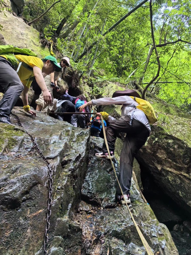 转眼到了5月底,夏天溯溪线路走起。这次我们去了绍兴上虞的神仙峡谷,大概10KM的距离&500多米的爬升,数据上来看是一条比较入门的休闲线路,但是因为前半程几乎全部在峡谷溪流中徒步、穿行,加上乱石堆大都覆盖着一层青苔,非常滑,部分路段必须手脚并用,抓着铁索通过。难度系数增加了,不过也更有趣味性。