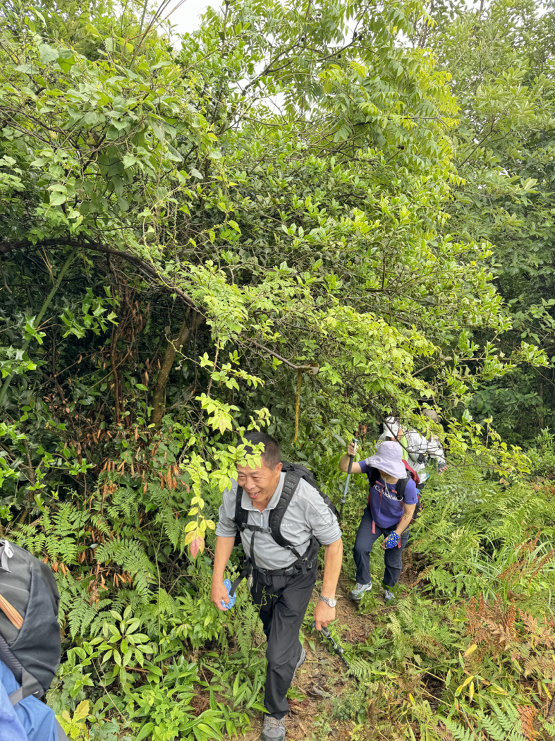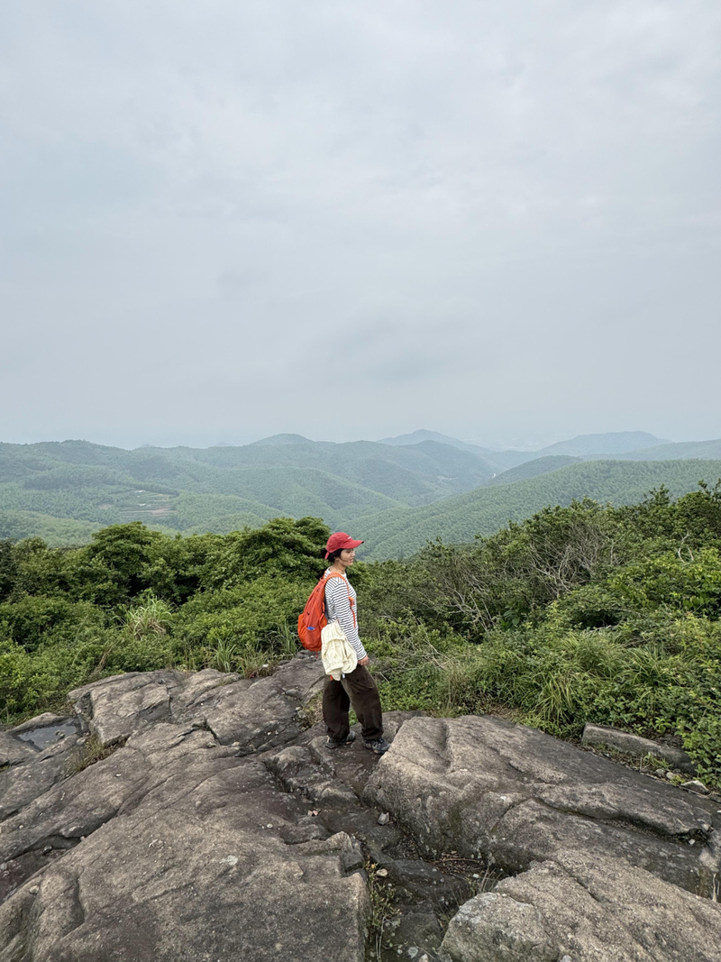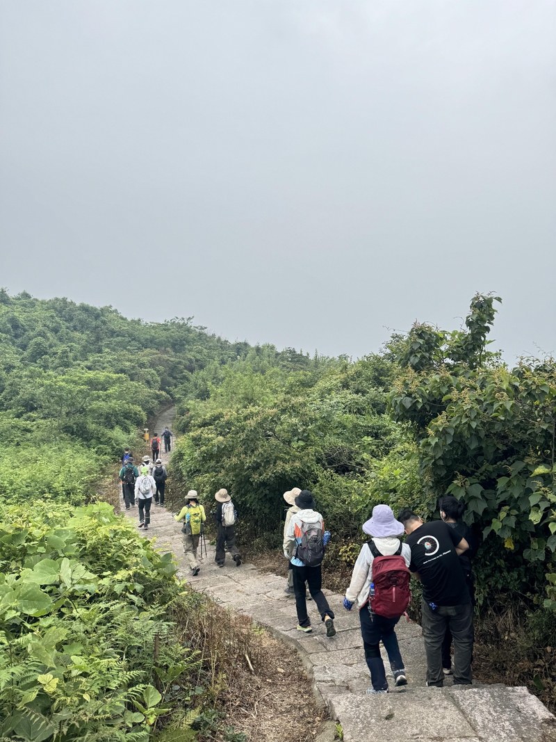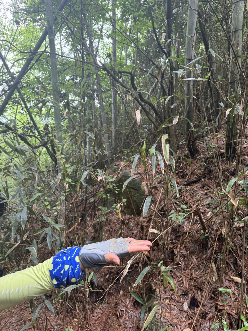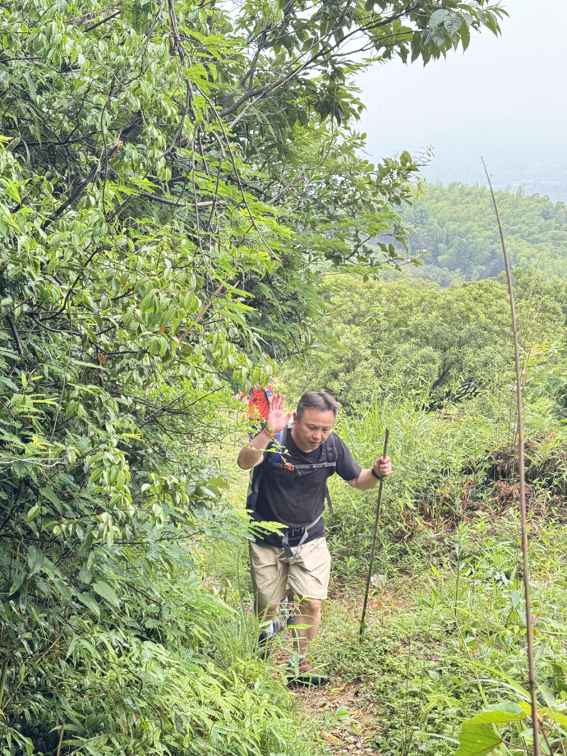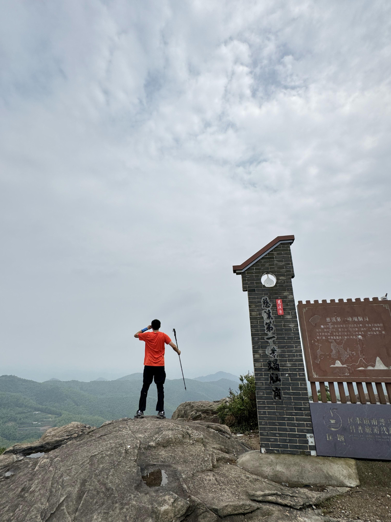 后面继续翻山越岭,走过杂树野路,到达蹋脑岗,蹋脑岗是慈溪市栲栳山脉的第一高峰,海拔446米。山顶以几块巨石为主,站于塌脑岗之上,一览众山小,大家也可在这休息调整一下。