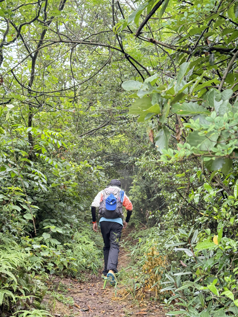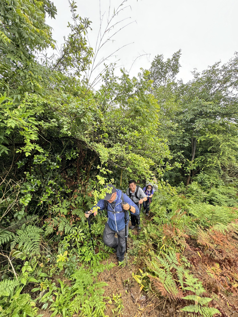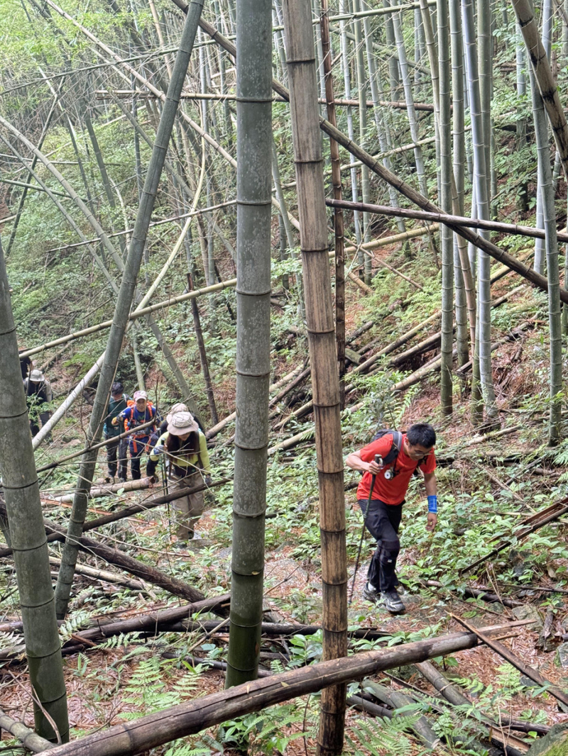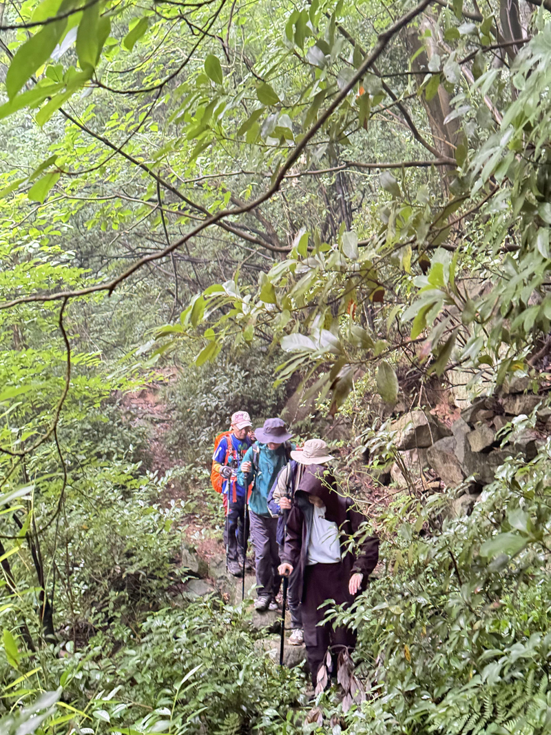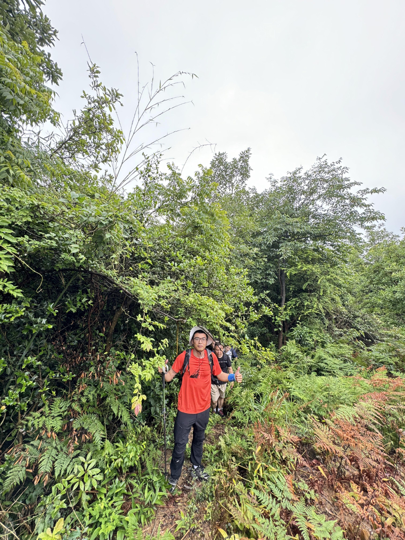 后面继续翻山越岭,走过杂树野路,到达蹋脑岗,蹋脑岗是慈溪市栲栳山脉的第一高峰,海拔446米。山顶以几块巨石为主,站于塌脑岗之上,一览众山小,大家也可在这休息调整一下。