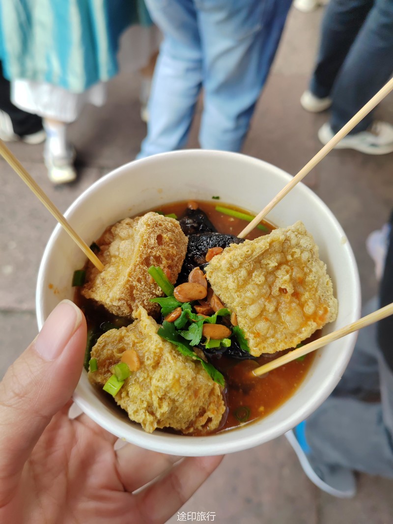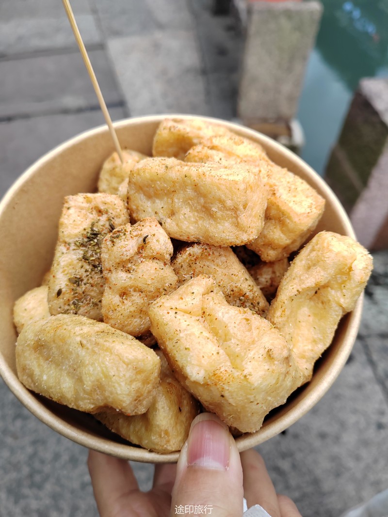 在街头的小摊前驻足,等老板刚炸好的臭豆腐递过来,香香臭臭的口感让思绪回到了童年时光。