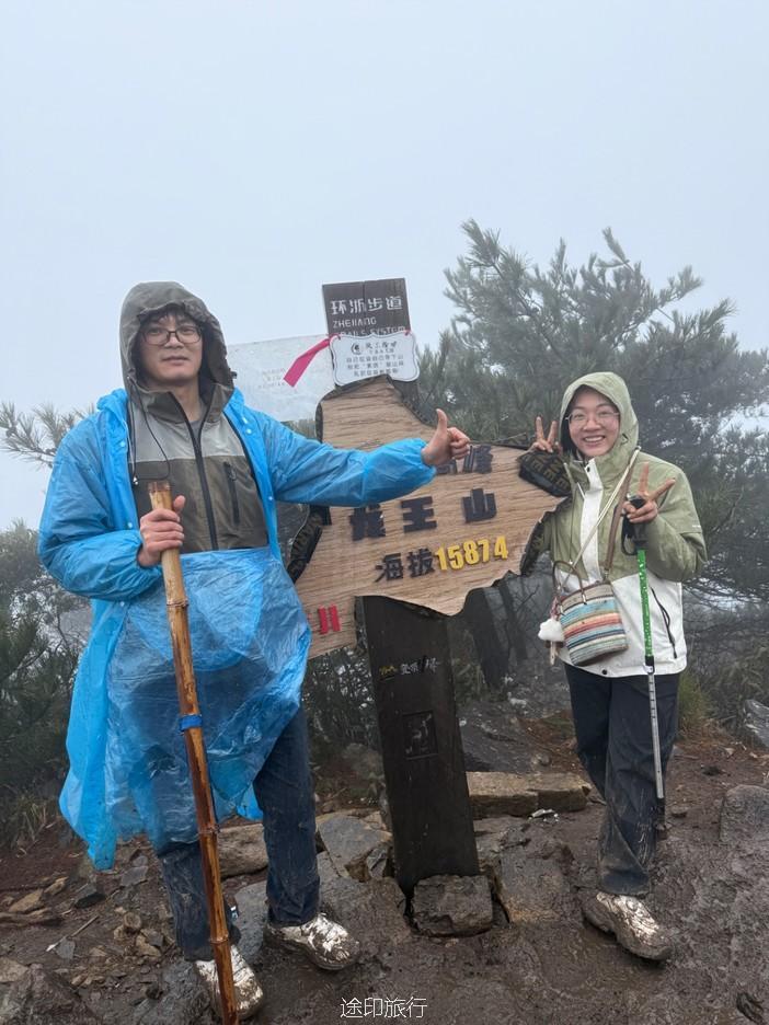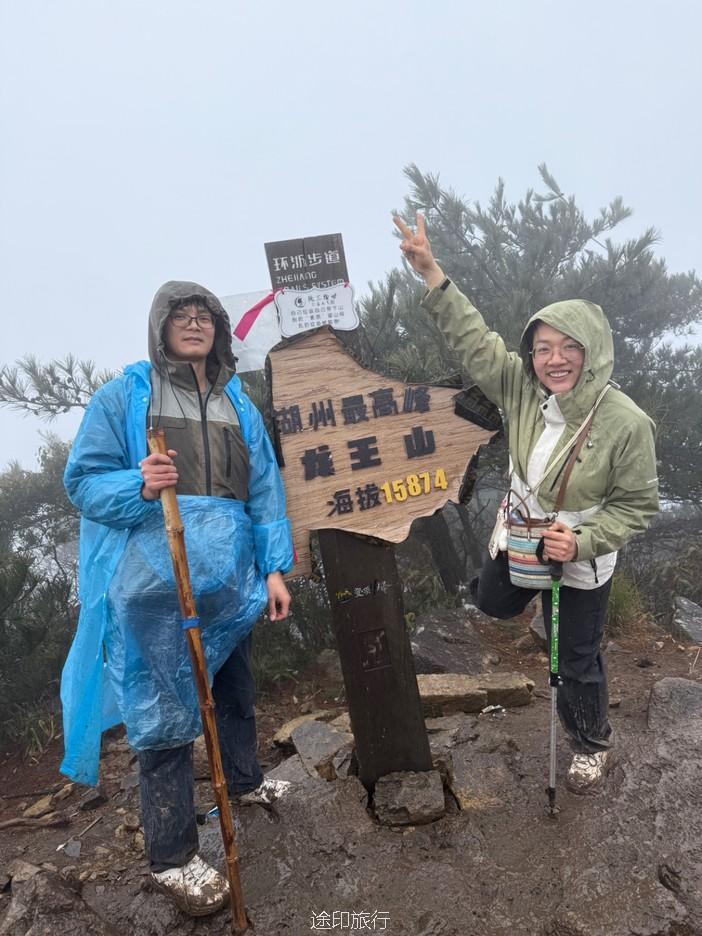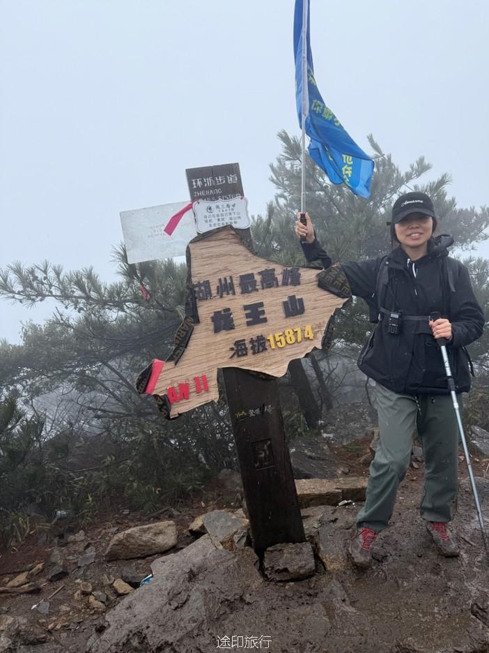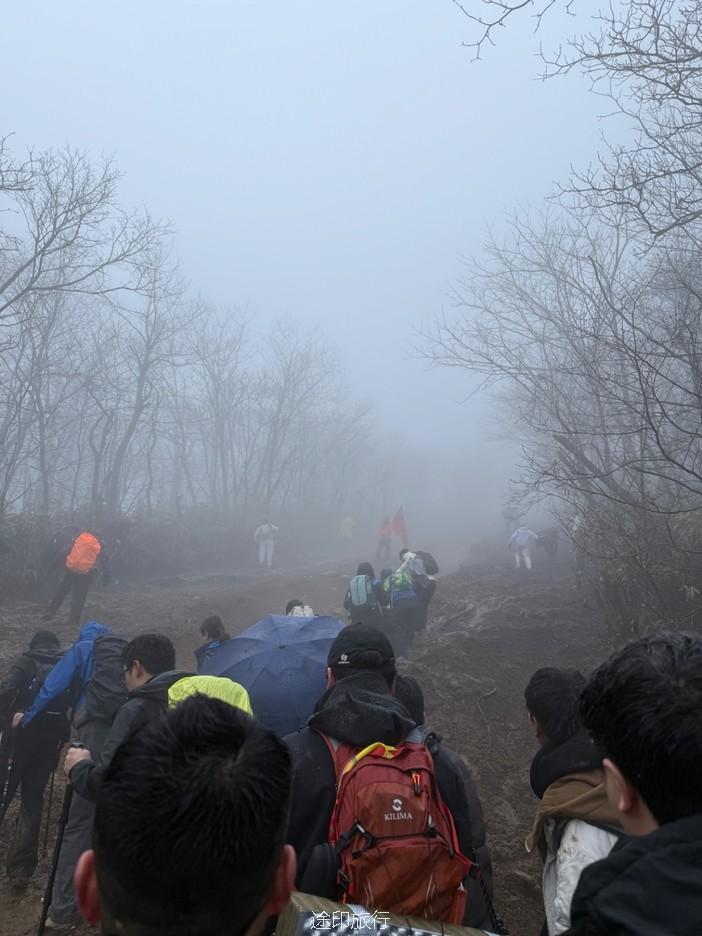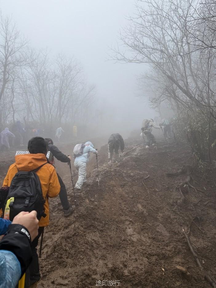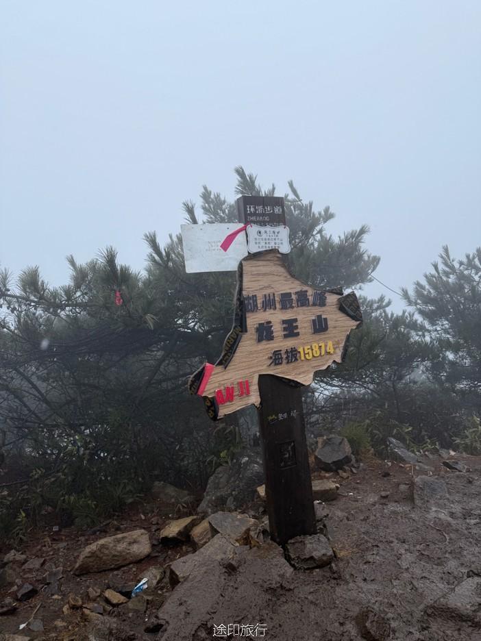 到了防火道,我们继续往龙王山顶。路上的泥巴开始更多更泥泞了。我们的速度更慢,走的也更小心了。终于到了龙王山顶。这里气温明显低了很多,加上安吉方向吹来的湿气,更觉得寒冷。大家打个卡就开始下山。