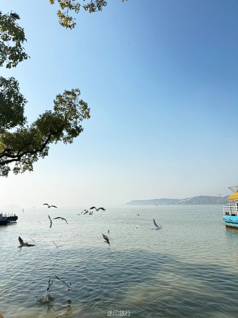 为了能够赶上最美的夕阳,我们决定晚些时候进入游船码头。尽管排队的人稍显多,但大家的心情依然兴奋愉快。一上游船,就感受到了海鸥的欢呼,白天我们可以清楚看到红嘴鸥鲜红的嘴巴,在天空自有的盘旋。太湖仙岛的第一站是月老祠,参拜过月老后,我们继续前行徒步。接着我们看到的,是宏伟的老子像和大卢舍那佛,庙宇中沉静的氛围让人不由得驻足沉思。