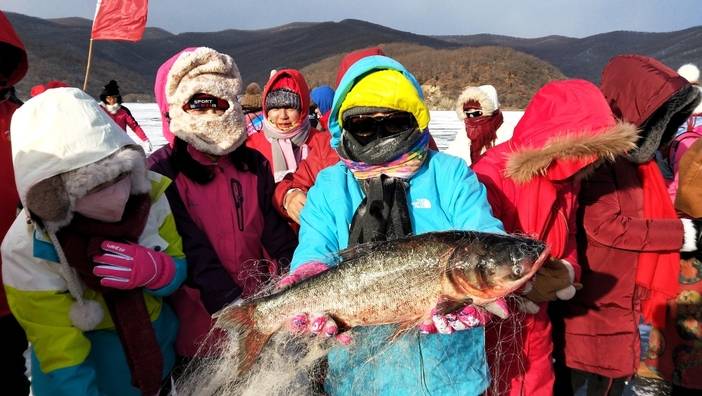 抵达【镜泊湖南湖头冰上基地】,在这里为大家安排【冰上保龄球】以及【冬捕】项目,乘坐东北冰面特有的交通工具【雪圈车】(镜泊湖南湖头1月1日-2月10日结冰安全期期间安排,其他时间替换为【朝鲜民俗村】,参观纯正的朝鲜族民居,学习【制作朝鲜族打糕、辣白菜、穿朝鲜民族服装照相】)。