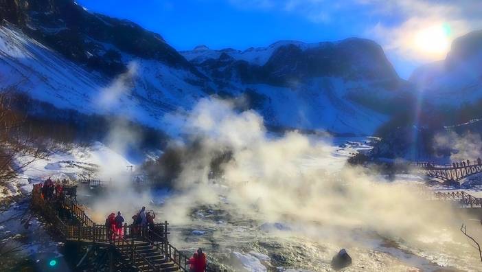 再回来酒店享用早餐,之后集合上车出发前往【长白山北景区】山门。因为进入景区之后必须要换乘景区内的环保车,我们自己的车子就要停在停车场,所以下车之前一定要带好需要的东西。景区环保车是循环式的,下车之前一定要检查好自己的物品,不要遗落在车上,排队约20分钟。抵达倒站口,如果天气好大家可以自费80元换乘倒站车20分钟抵达天池主峰停车场,爬上5分钟到山顶,俯瞰美丽的天池,自由摄影30分钟。中午乘倒站车返回到中转服务站,换乘环保车赴【长白瀑布】,车程约10分钟,步行约20分钟到达长白冰雪瀑布底部近距离观看、摄影,参观【聚龙温泉群】,周围一片白雪,中间却热气腾腾,甚是美丽,游览30分钟,步行20分钟返回瀑布停车场。