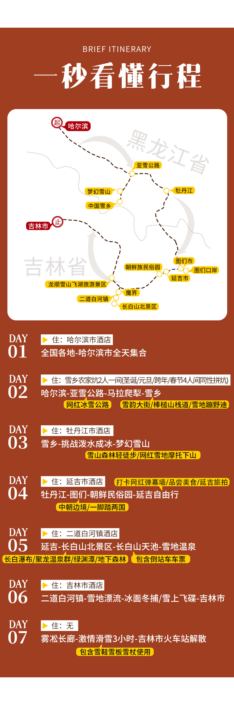 今日亮点:雪乡日出、长白山雪地露天温泉、镜泊湖南湖头冬捕+冰面雪圈飘逸(镜泊湖南湖头1月1日-2月10日结冰安全期期间安排,其他时间替换为朝鲜民族村,参观纯正的朝鲜族民居,学习制作朝鲜族打糕、辣白菜,穿朝鲜民族服装照相)