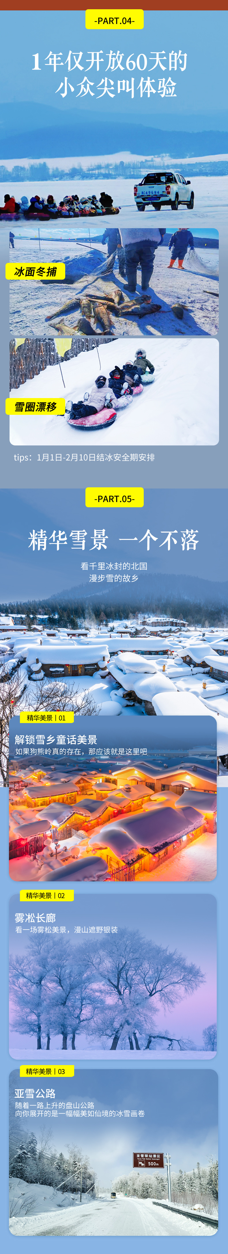 4、门票:亚布力2小时滑雪(包含雪鞋雪板雪杖使用)、雪乡门票+往返环保车、林海雪原徒步穿越门票、长白山往返环保车、魔界门票、万科2小时滑雪(包含雪鞋雪板雪杖使用)、雾凇岛门票。