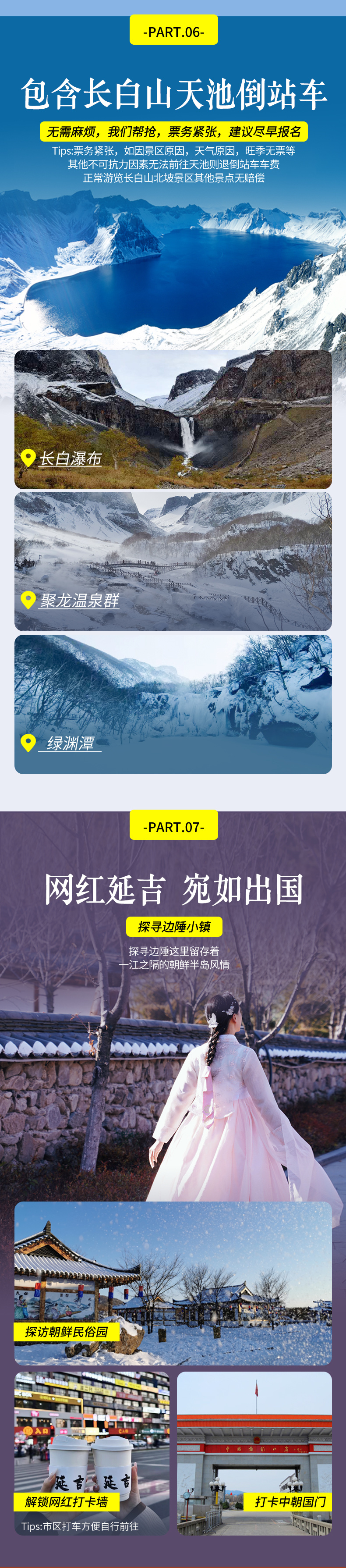 3、长白山上天池的倒站车80元不含,长白山门票125元不含(景区冬季实行免门票,如景区政策改变费用自理)。