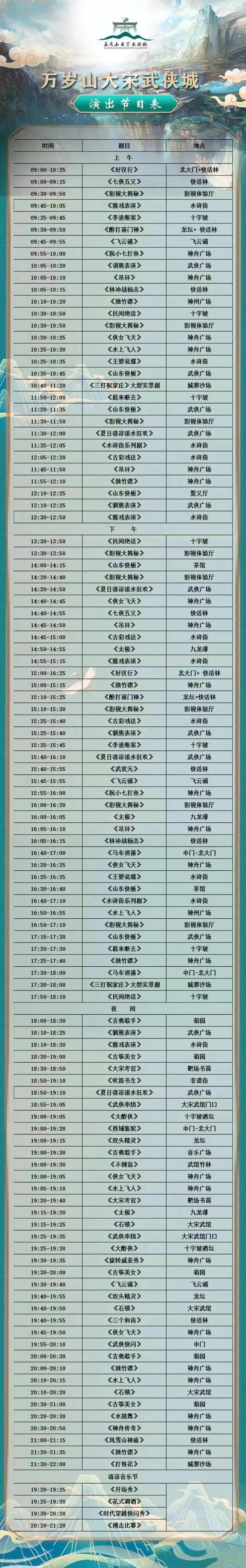 第一天:峡谷游:红石峡-子房湖水上乐园-潭瀑峡-泉瀑峡-猕猴谷 第二天:登高游:叠彩洞-茱萸峰索道-茱萸峰-重阳阁-凤凰岭索道-万善寺 第三天 万岁山武侠城 上百个节目循环演出 适合年龄:10-60岁