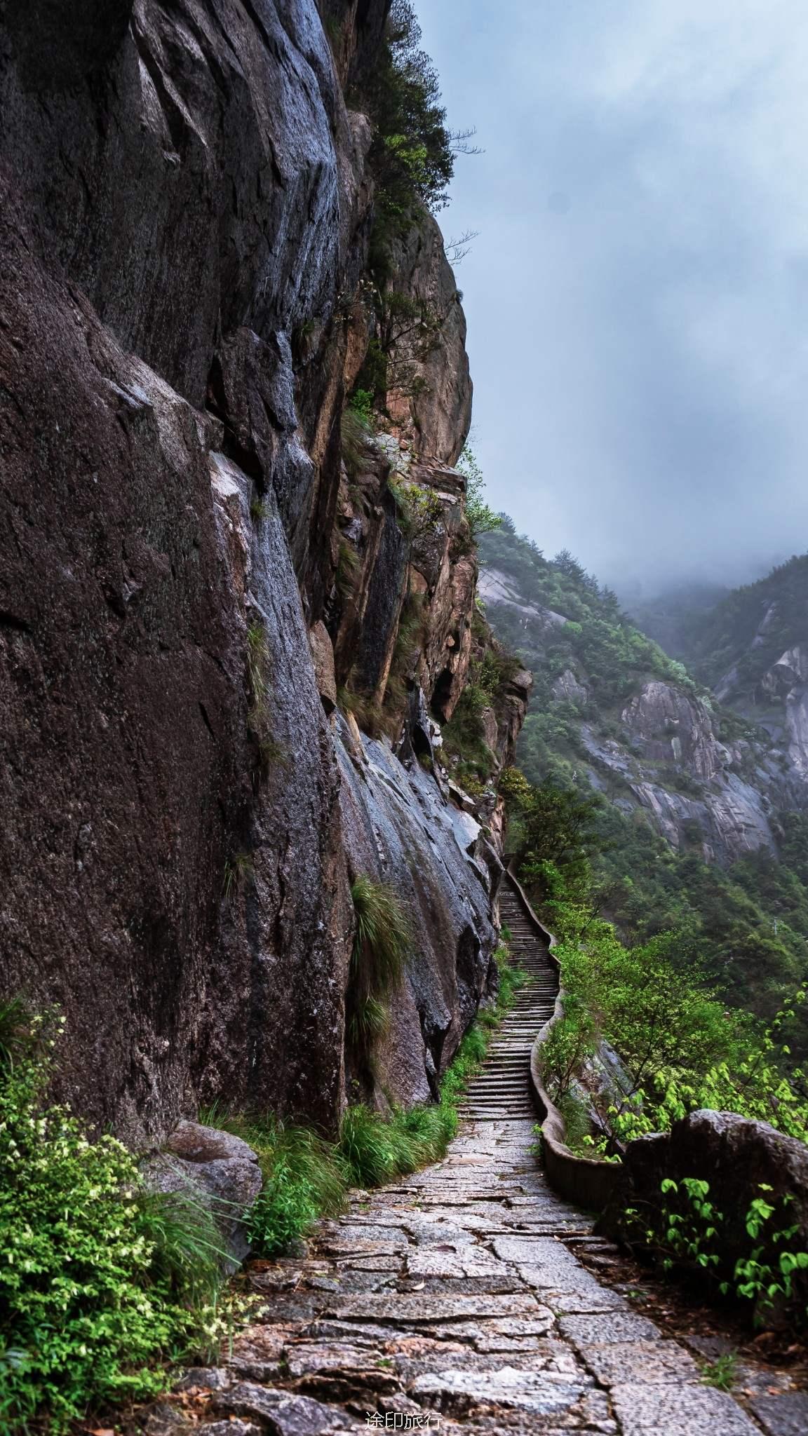江南第一关附近的路上,一米宽的古道,底下就是悬崖,挑战您的心智