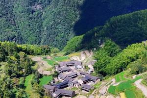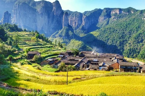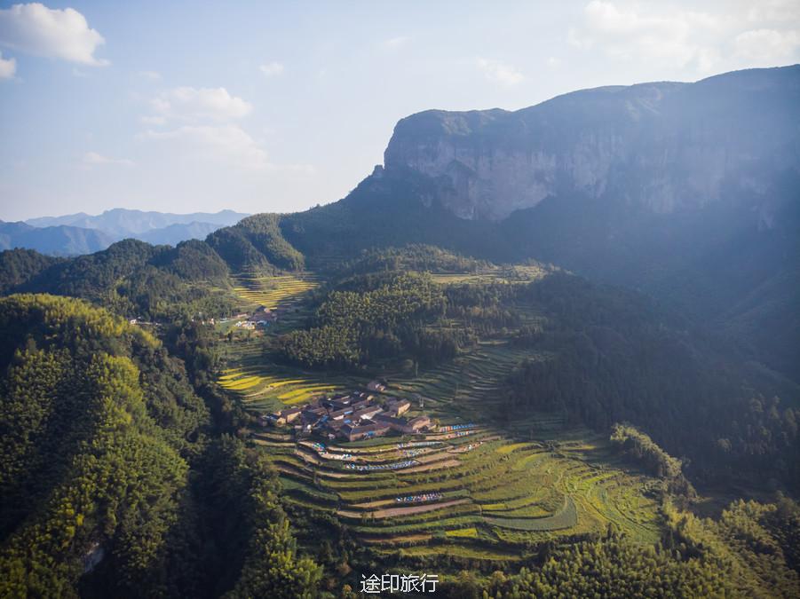 这个桃花源般存在的地方叫公盂村,坐落台州仙居县以岿巍著称的公盂景区内。四周山崖连着山崖,气势峥嵘,横亘无际。
