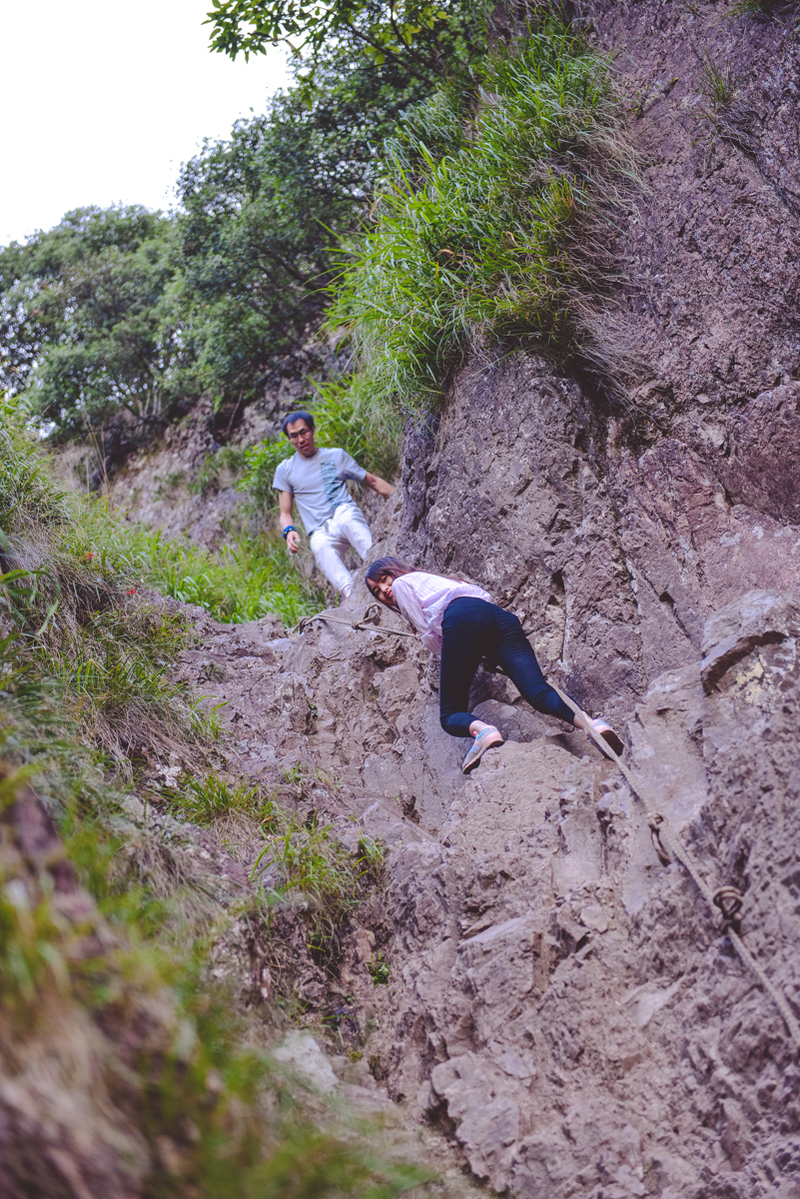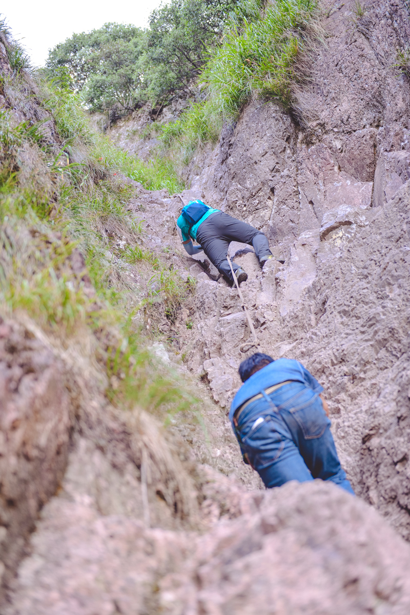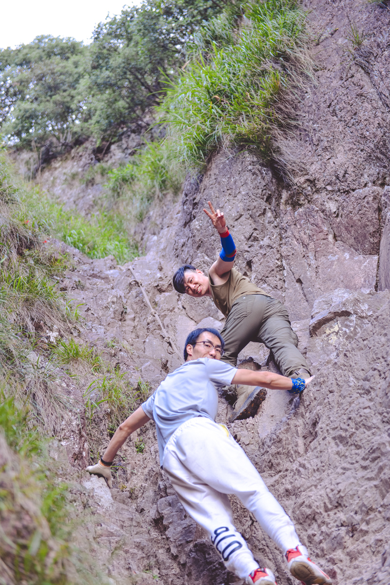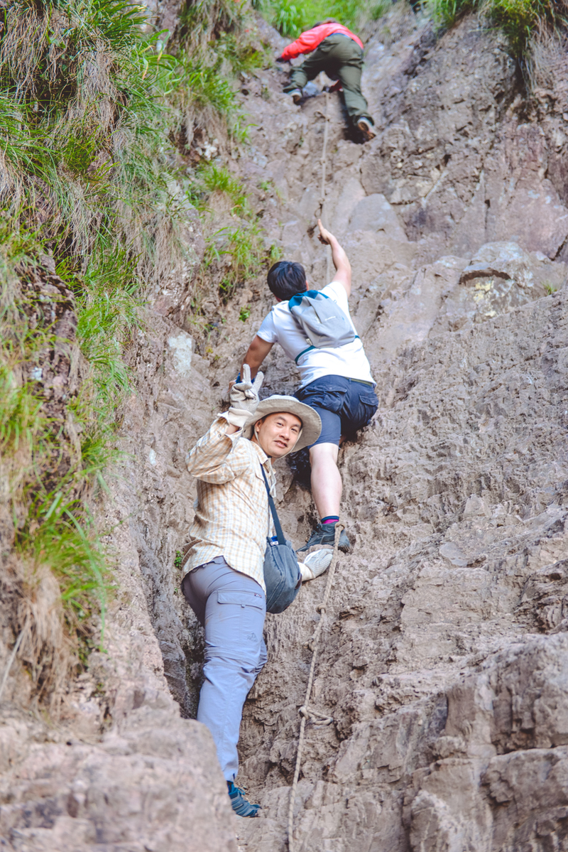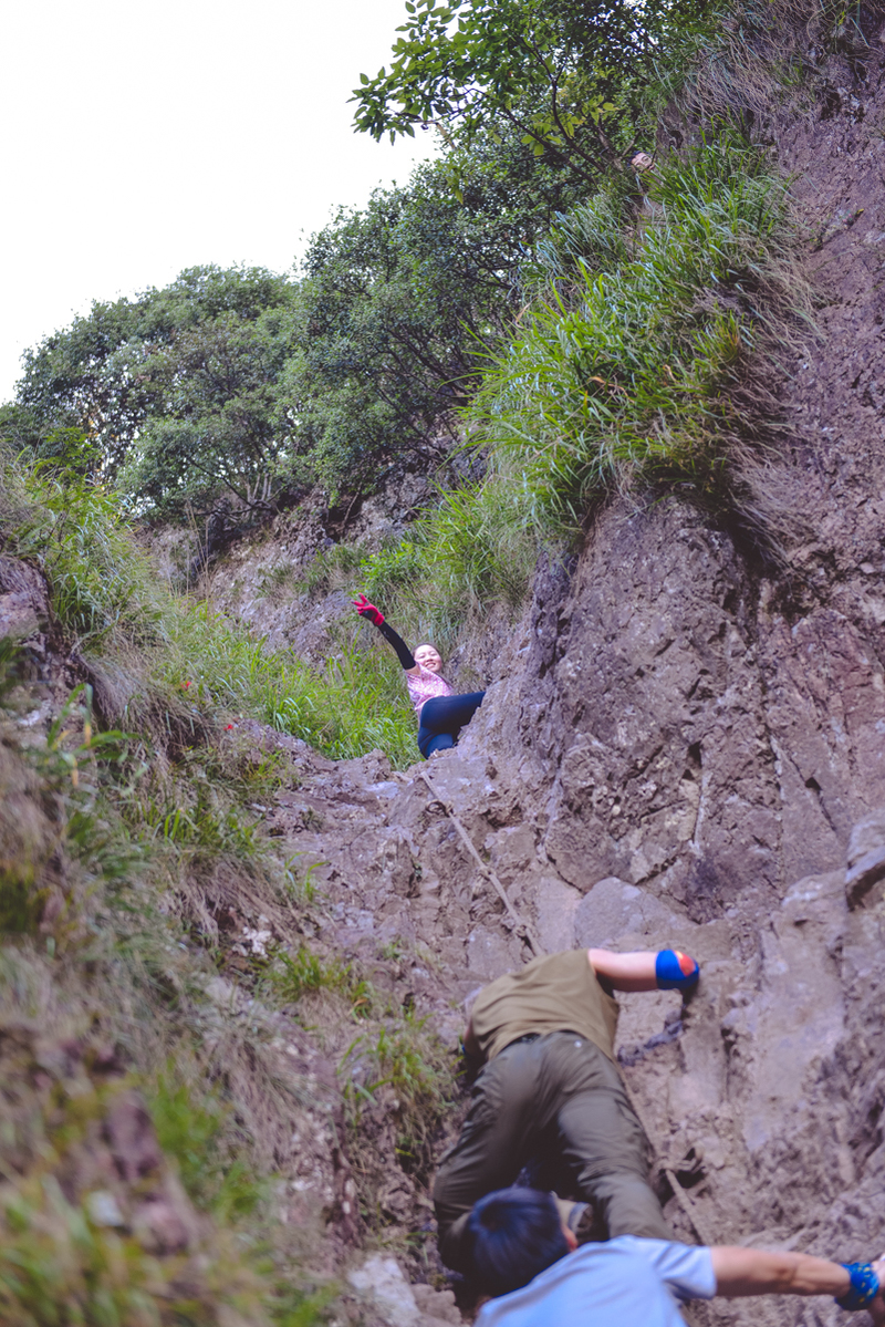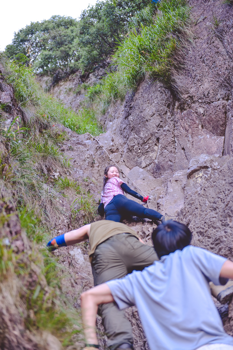 下午我们要去的地方叫公盂背,这个地方是个非常险峻的地方,其中艰难地方比华山有过之而无不及,正式因为此,莫名而来的队伍不计其数,导致小小的地方排起了长长的队伍。但依然阻挡不了队员攀爬的热情。