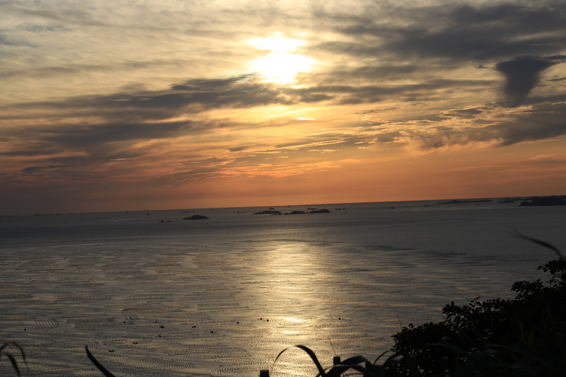 渐渐地,夜幕降临,日落海面映夕阳,岛屿披金装,岸边炊烟袅袅灯火透亮,好一个岛屿之乡!真叫人流连忘归,好美!……
