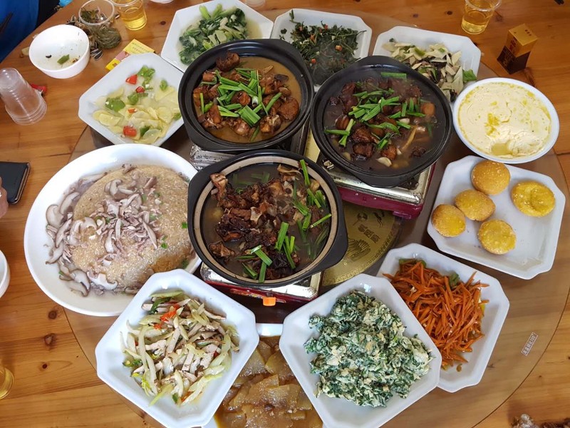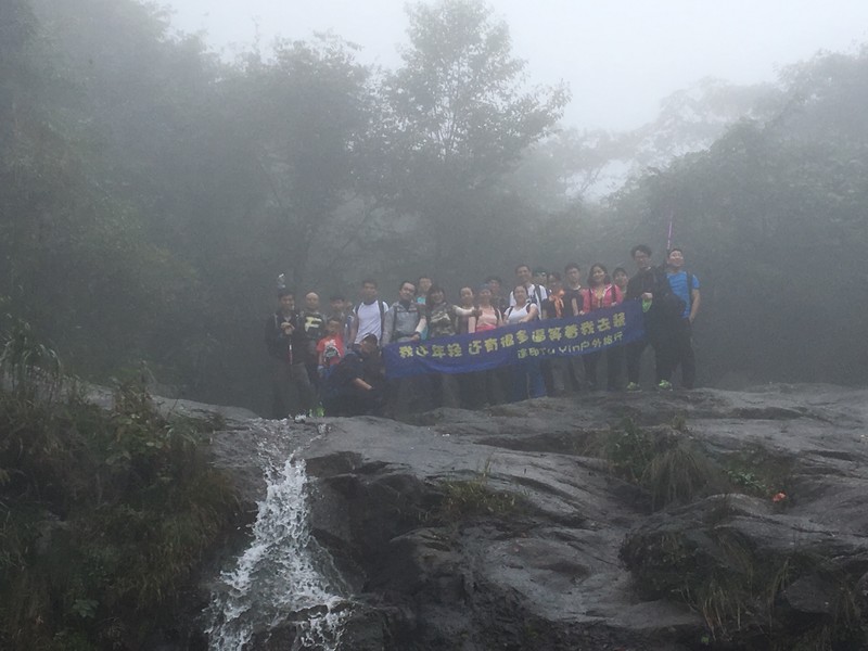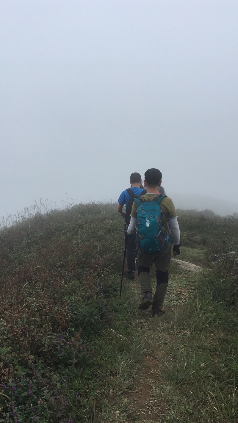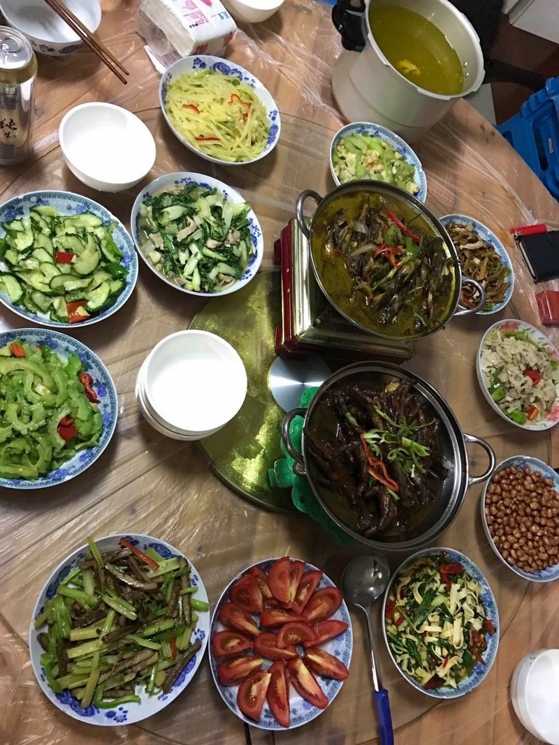 到达山顶后,大家短暂的休整,吃完午饭,开始继续出发,后半段以下山为主,由于起雾,周边又有草甸,有徒步武功山的感觉。由于雾气比较大,没这么拍照,留给大家以后的发挥空间,下午5点左右大家回到农家,一桌桌丰盛的饭菜等着我们。