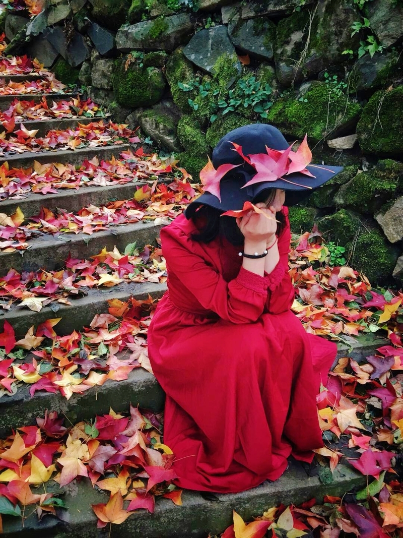 拍完集体照,大家就迫不及待要解散去寻秋了,三三两两结伴而行,少女们穿起来红裙,拍摄自己的大片。