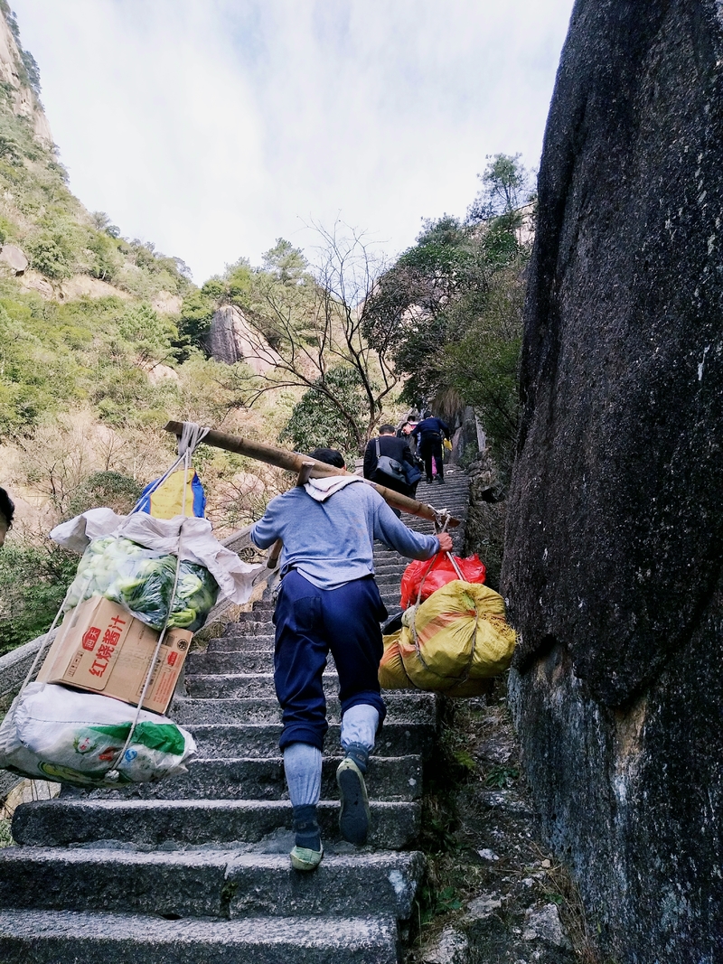 一路上山,沿途会遇到辛苦的挑山工,大家主动避让,甚至停下等待,向他们的辛苦付出致敬。