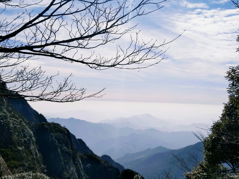 登高望远,远处重山栾峦,隐隐约约蒙着山雾,看不清楚,似一副行笔流畅的画。