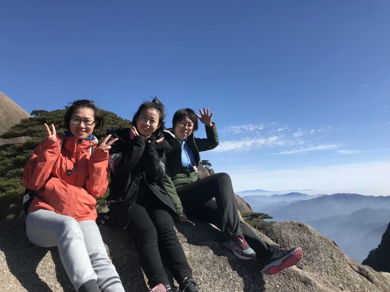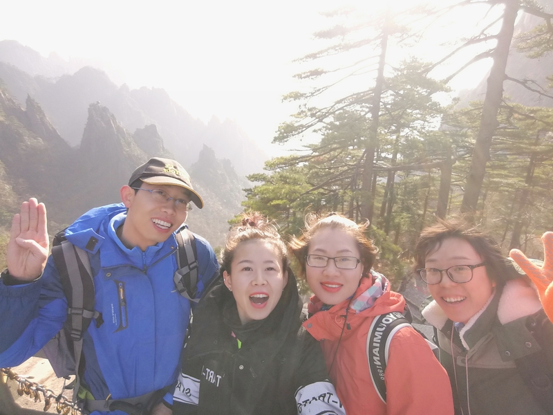 三位跑马拉松的美女子:小蘑菇、小丽、木木表示早已轻松无压力抵达迎客松,已经在这里等待我们半小时多。对于她们这样的速度和体力,引用同队走残的崔教授的话来说,就是:“太可气了!”