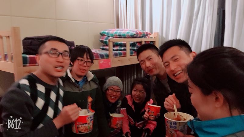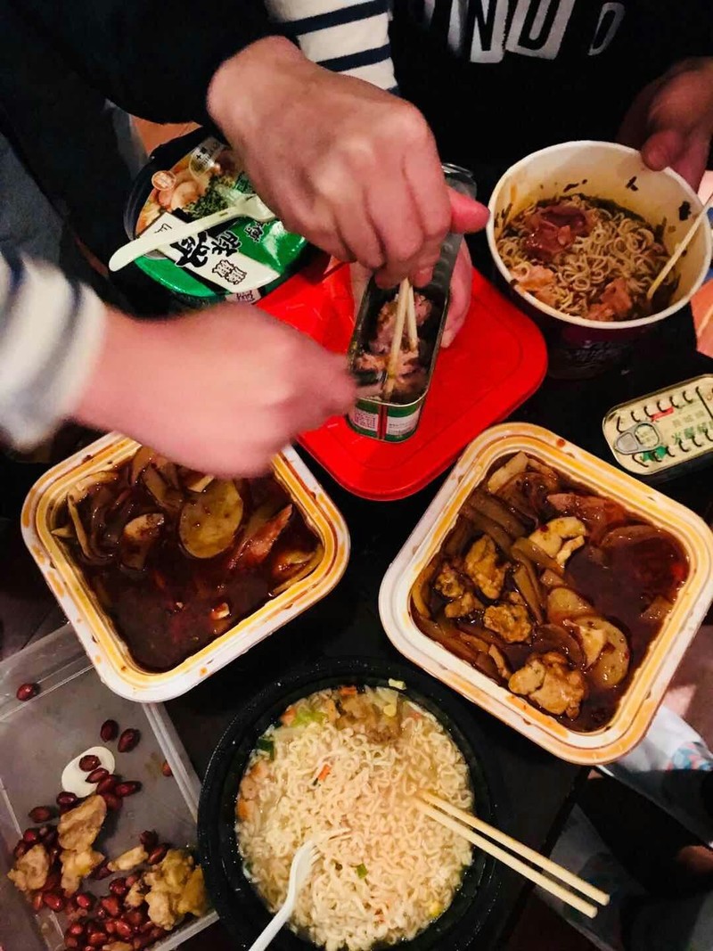 由于山上的餐饮较贵,大家都自备干粮在男生寝室里聚餐,热热闹闹分享各自准备的美食:火腿肉、小鱼干、二锅头...我带的泡面+火腿肠的豪华阵容被马拉松三人组带的自热小火锅 KO,小龙坎的自热小火锅荤素皆有,牛油味特别地道,闻着就口水直流。